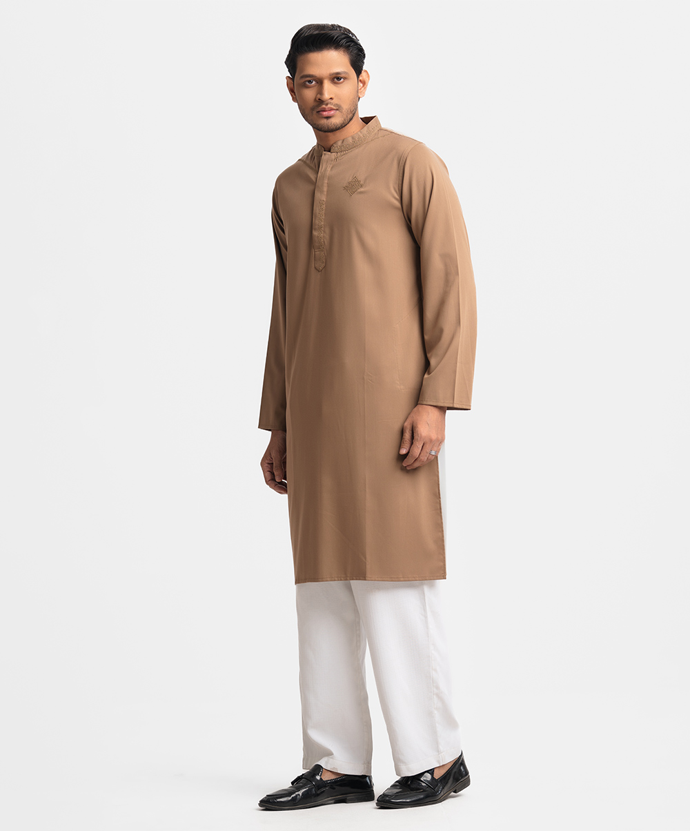 Men’s semi fitted panjabi in cotton blended fabric. Mandarin collar with hidden buttons placket & full sleeves. Embroidery at front & inseam pockets.
