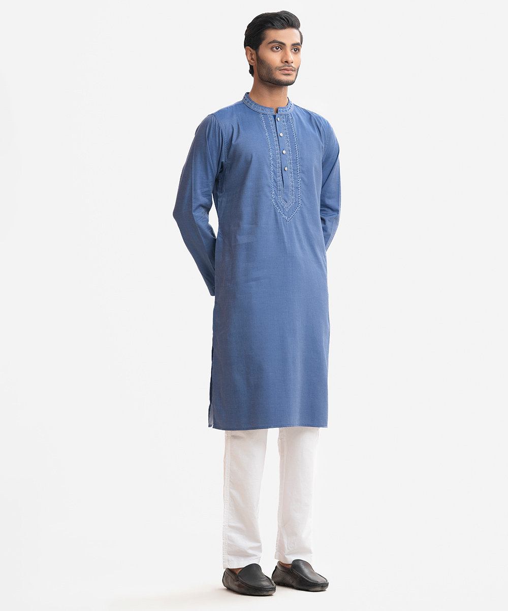 Classic semi fitted panjabi in cotton fabric with button closure and inseam side pockets. Embroidery and karchupi at the front.