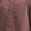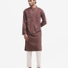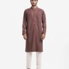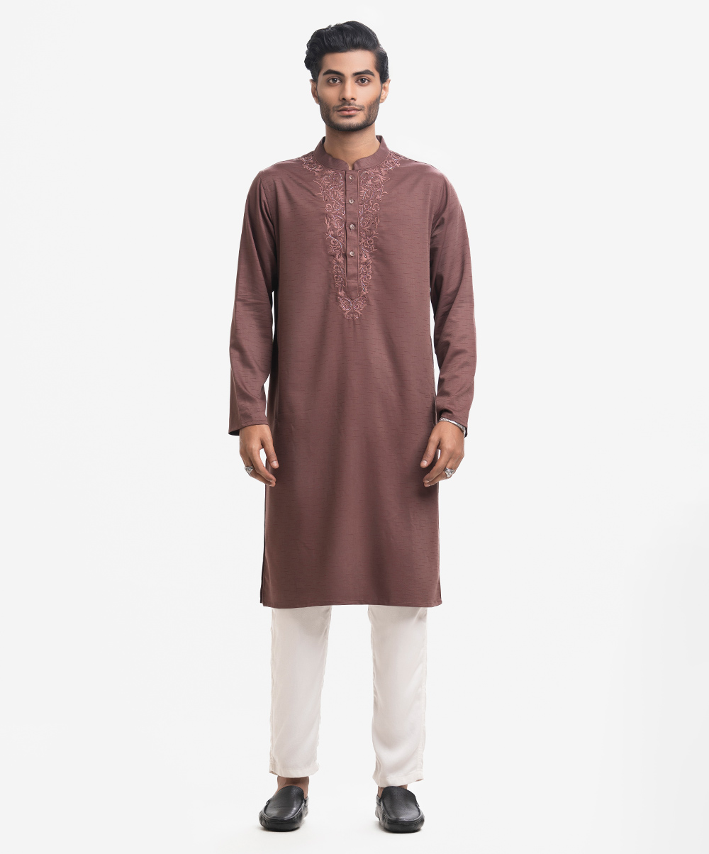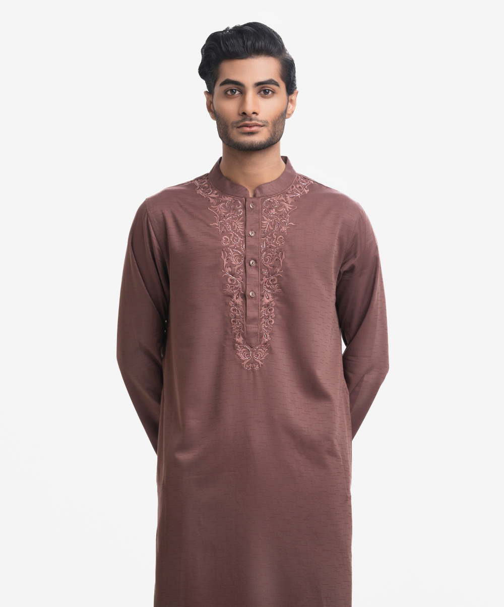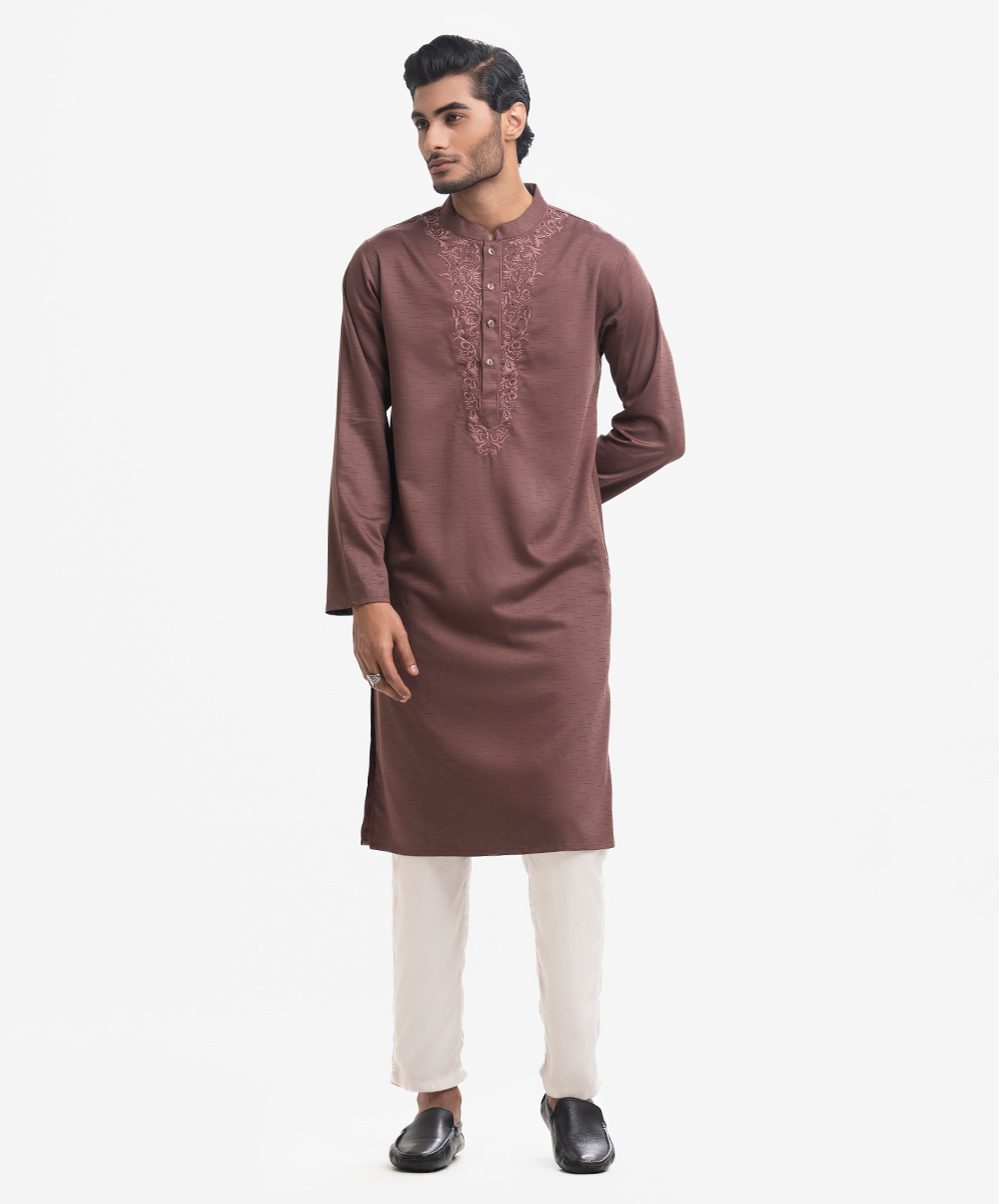 Men’s semi fitted panjabi in cotton jacquard fabric. Mandarin collar, full sleeves. Karchupi at the front. Inseam side pockets.