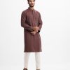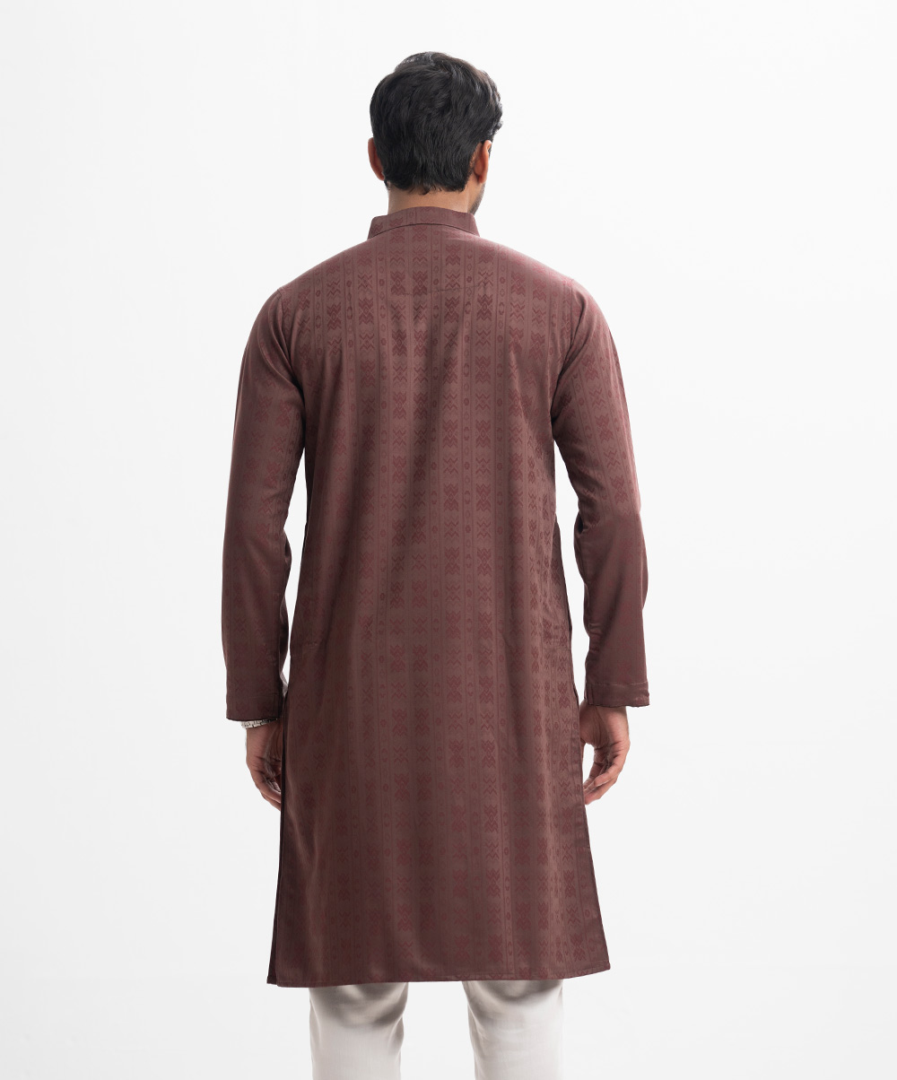Men’s semi fitted panjabi in cotton jacquard fabric. Mandarin collar with metal buttons on the placket & full sleeves. Inseam pockets.