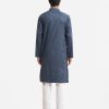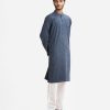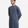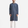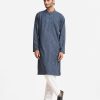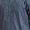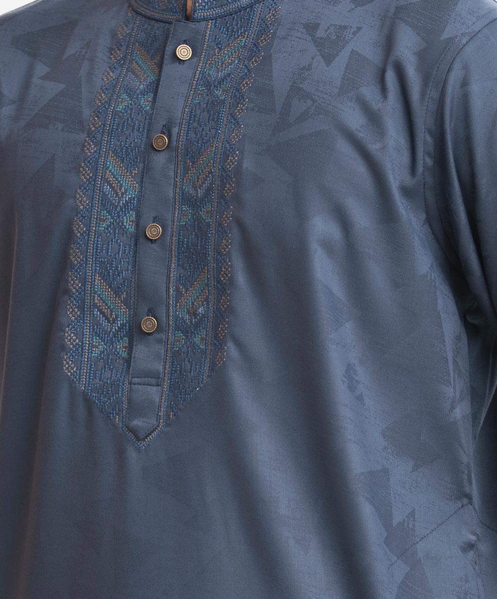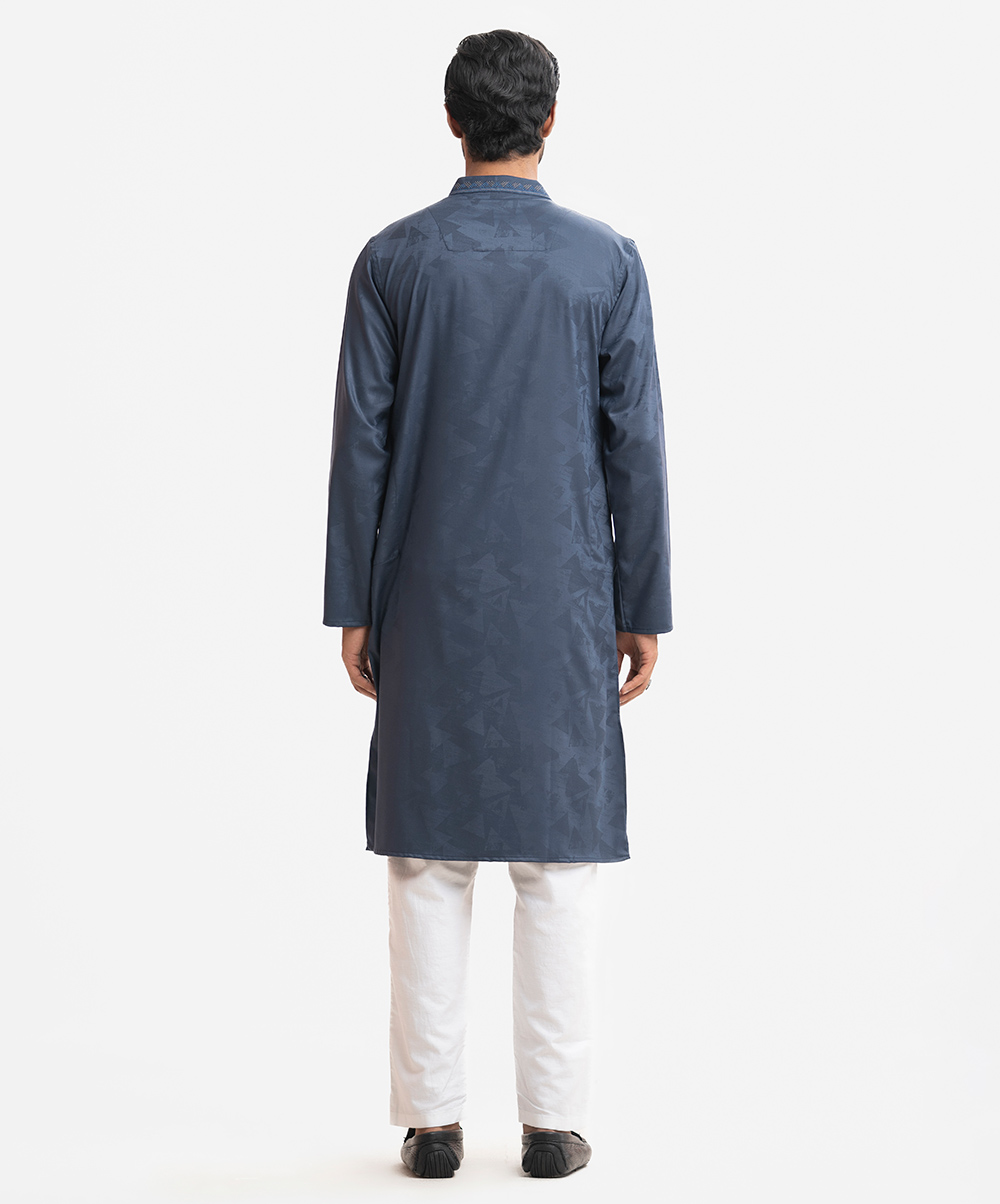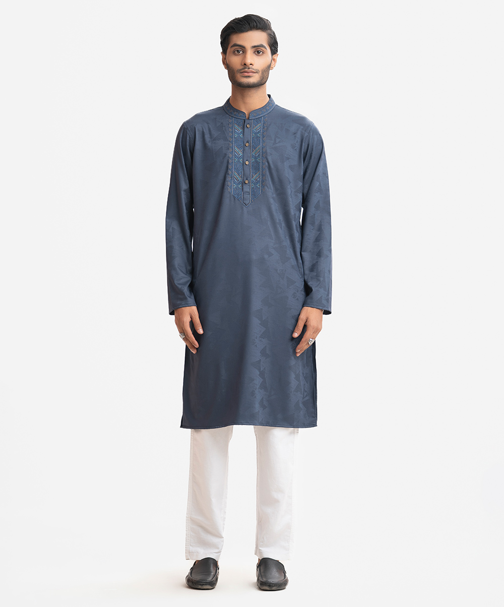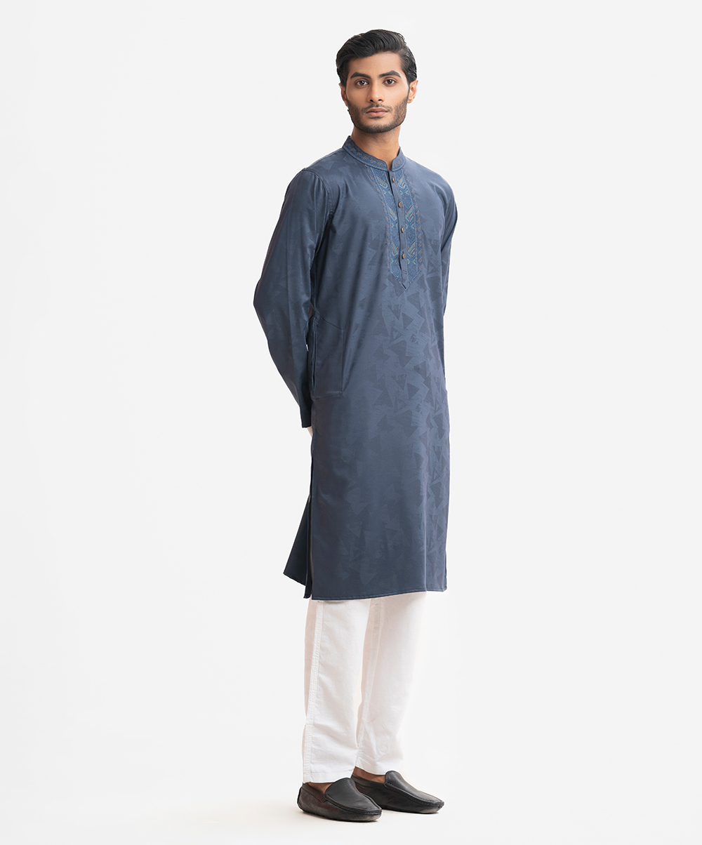 Men’s semi fitted panjabi in jacquard fabric. Mandarin collar with metal buttons on the placket & full sleeves. Inseam pockets. Embroidery at front.