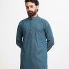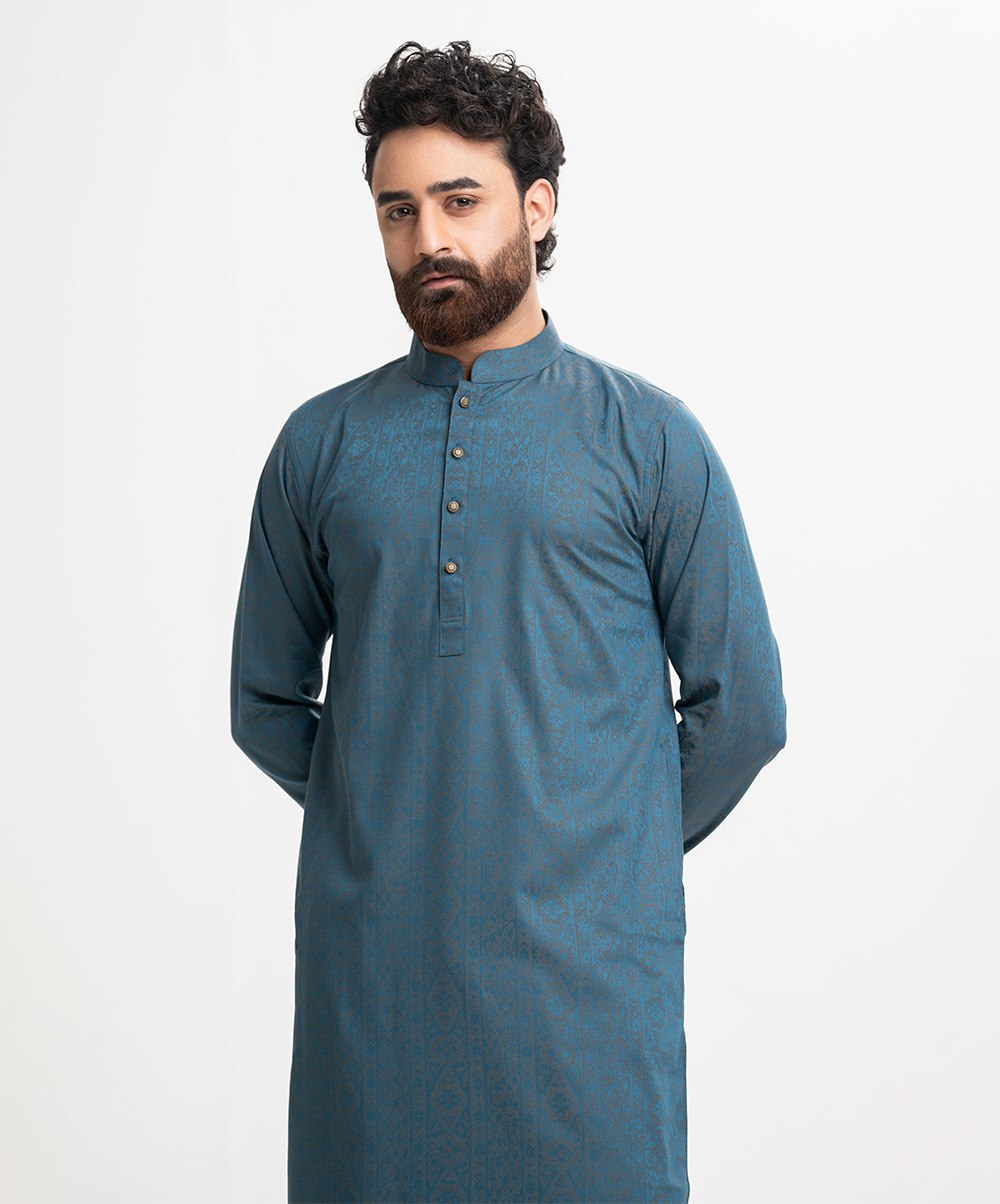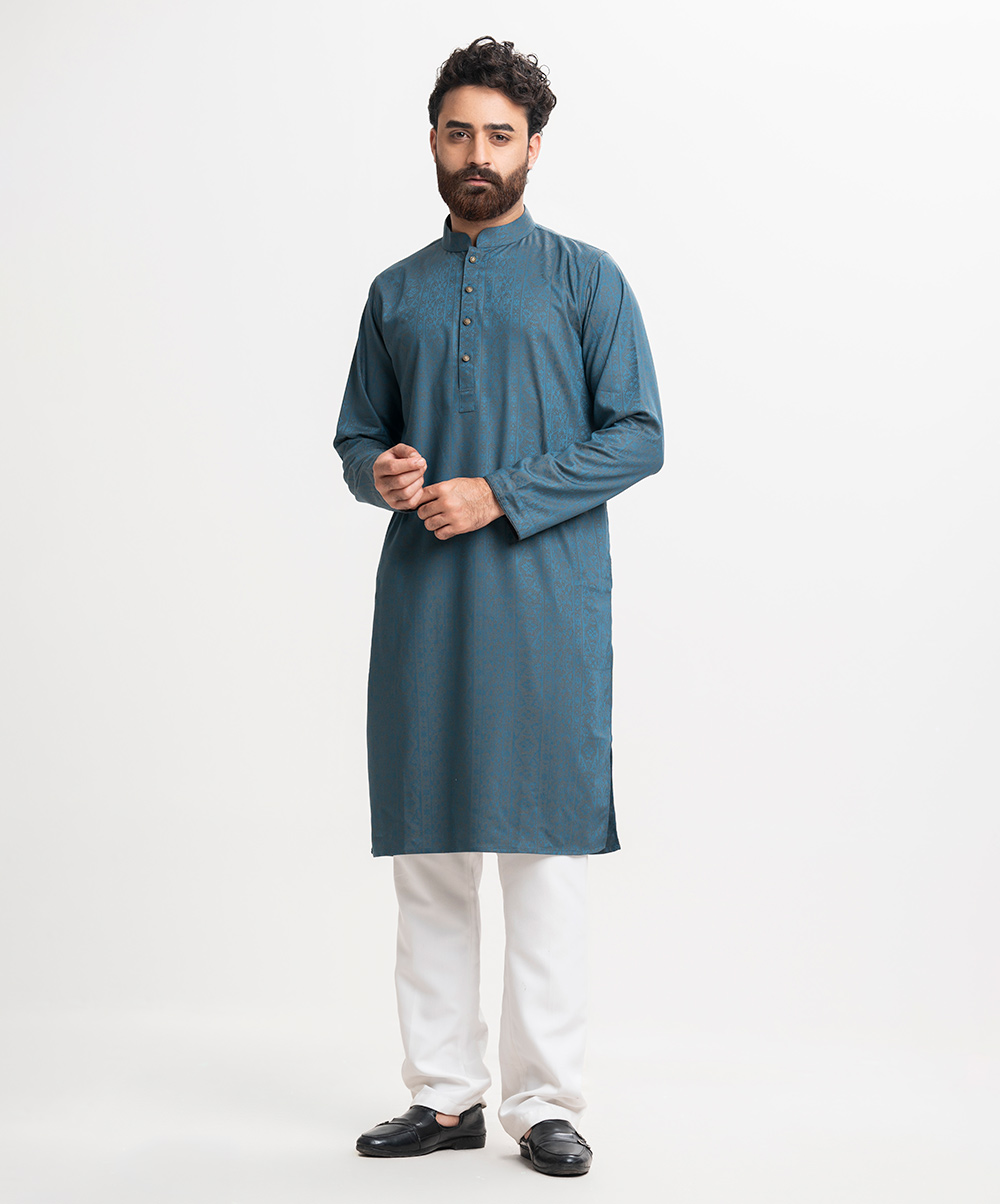 Men’s semi fitted panjabi in cotton jacquard fabric. Mandarin collar & metal buttons placket. Full sleeves & inseam side pockets.