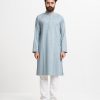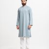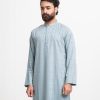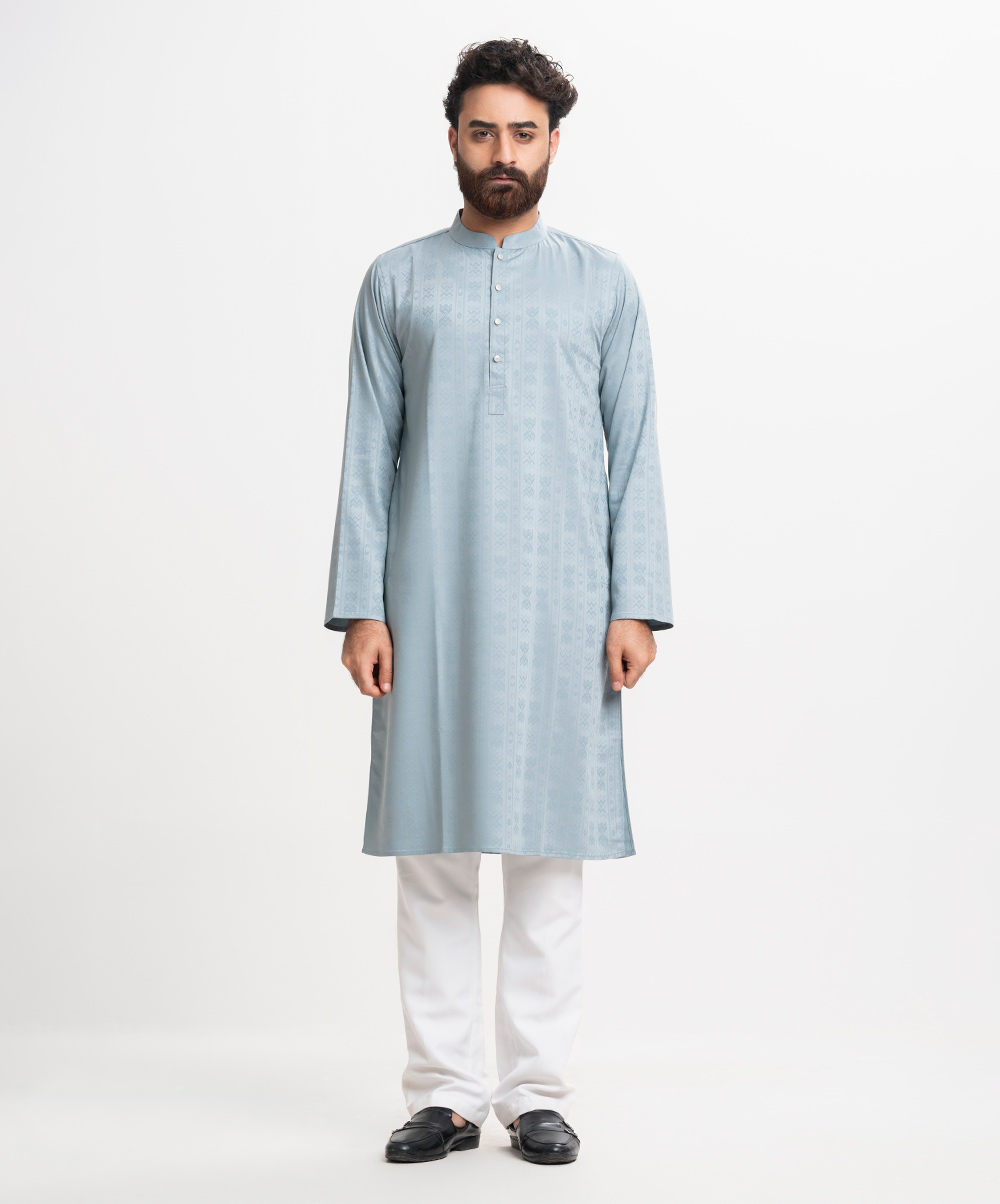Men’s semi-fitted panjabi in cotton Jacquard fabric. Mandarin collar & metal buttons placket. Full sleeves and inseam pockets.