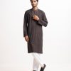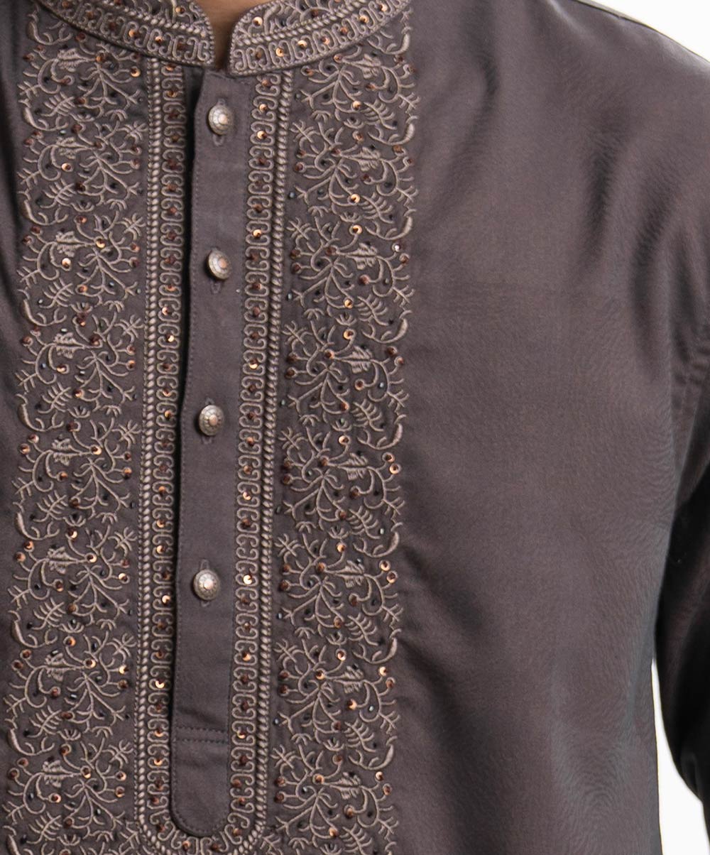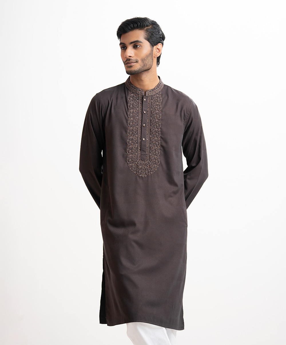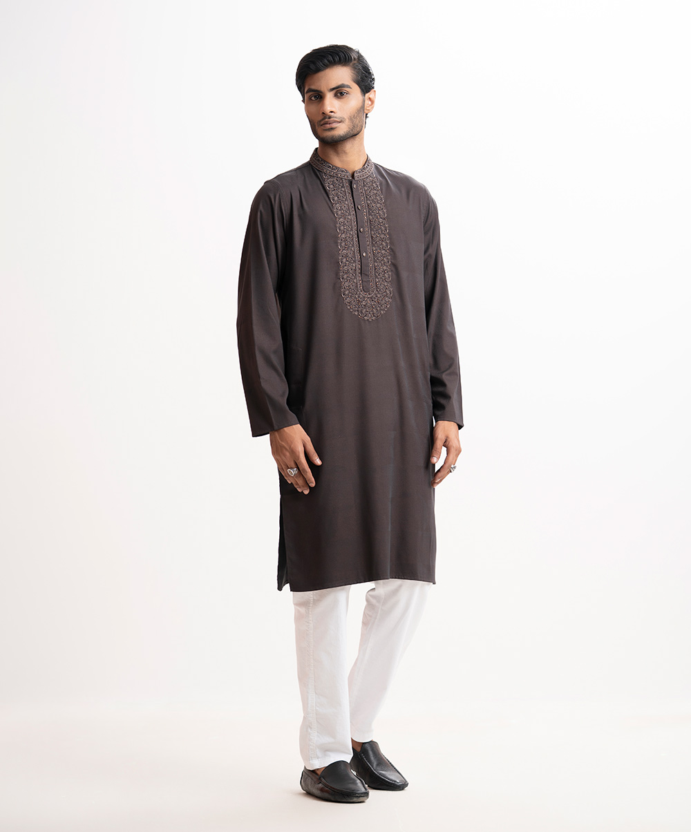 Men’s semi fitted panjabi in jacquard cotton fabric. Mandarin collar, full sleeves and inseam pockets. Embroidery at front.