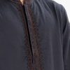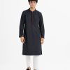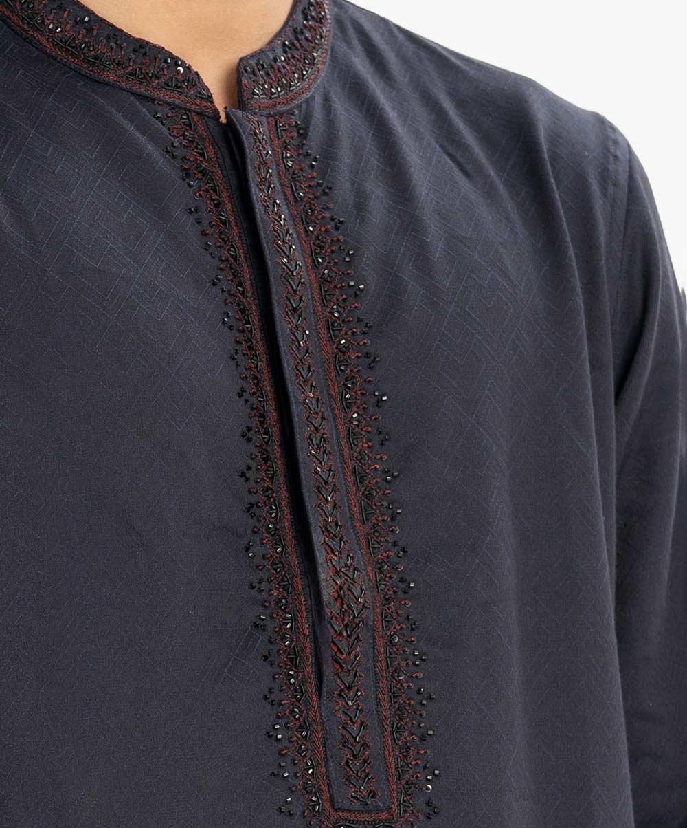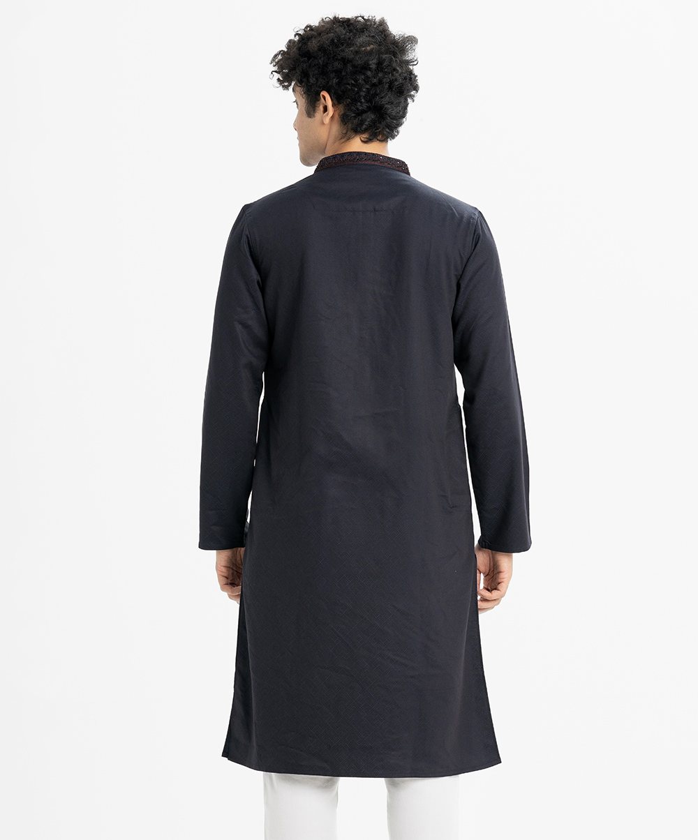 Men’s slim-fitted panjabi in jacquard fabric.Mandarin collar, inseam pockets and karchupi at the front.