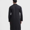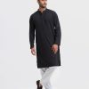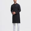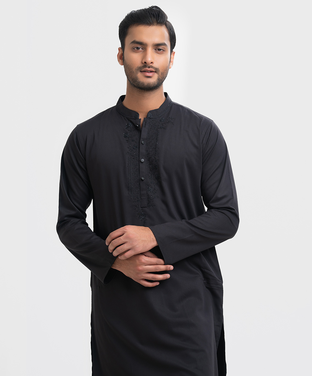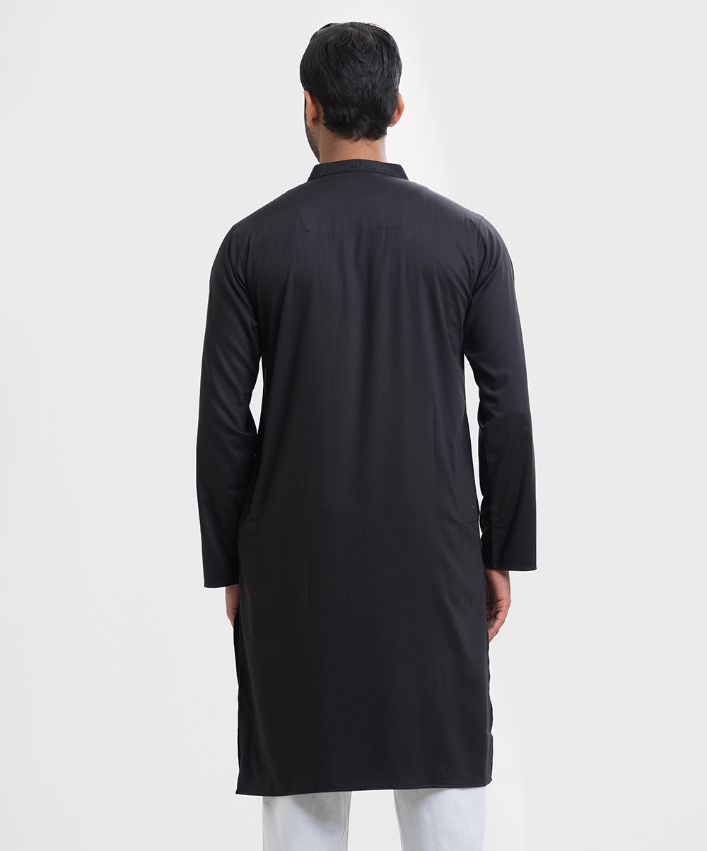 Fitted black panjabi in blended fabric. karchupi on the mandarin collar and placket.