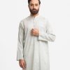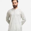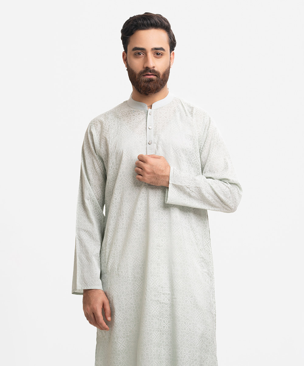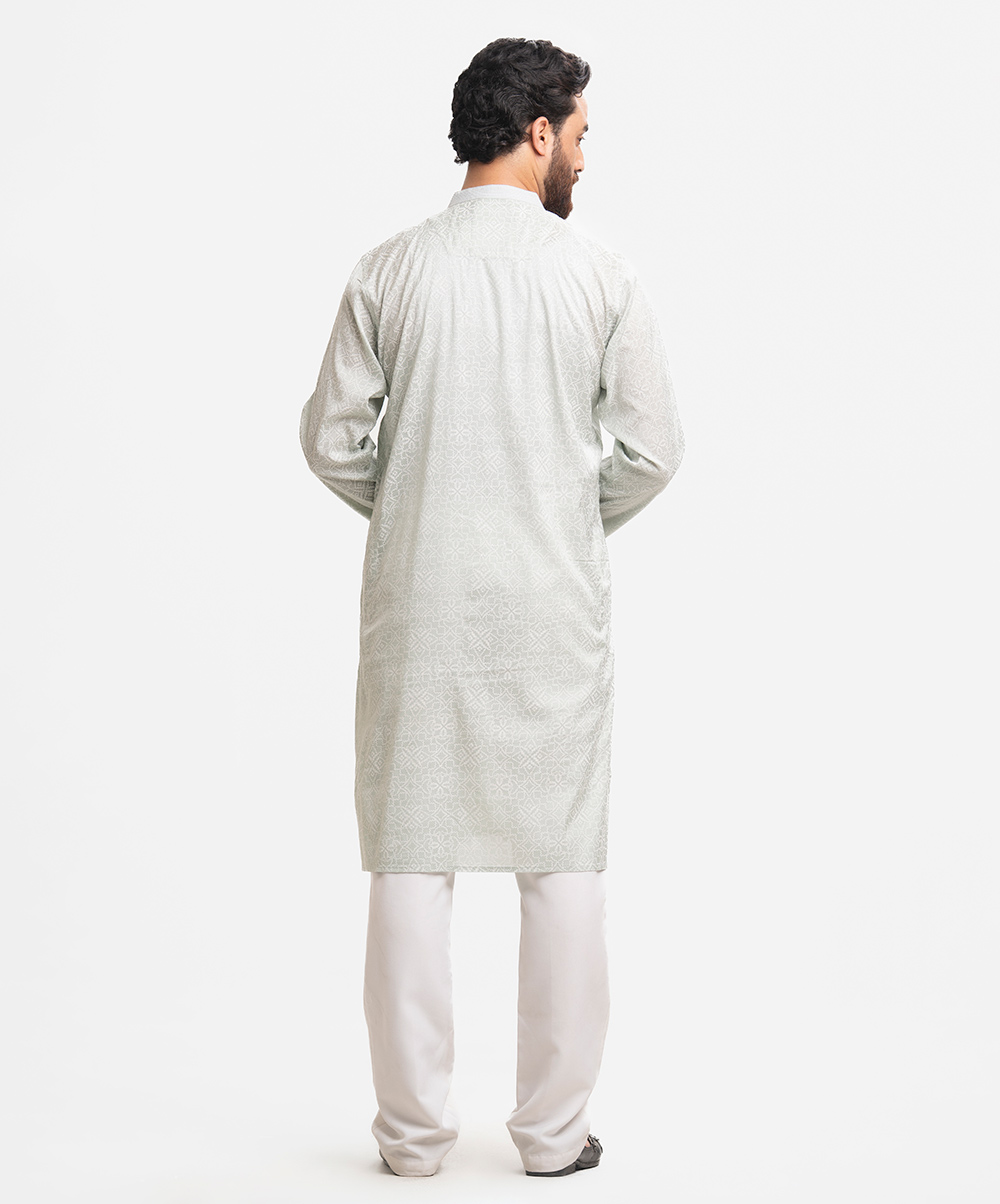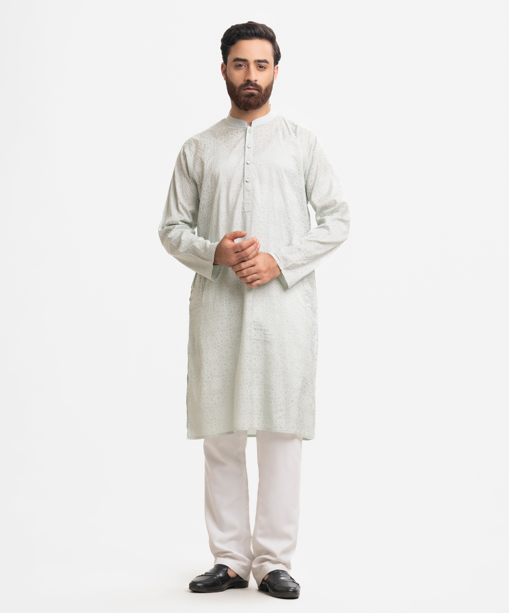 Men’s printed fitted panjabi in cotton fabric. Line stitching at mandarin collar and metal buttons placket. Inseam side pockets.