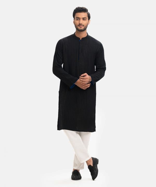 Men’s slim-fitted panjabi in cotton fabric. Mandarin collar, inseam pockets, and long sleeves. All-over pin tuck with line stitching.