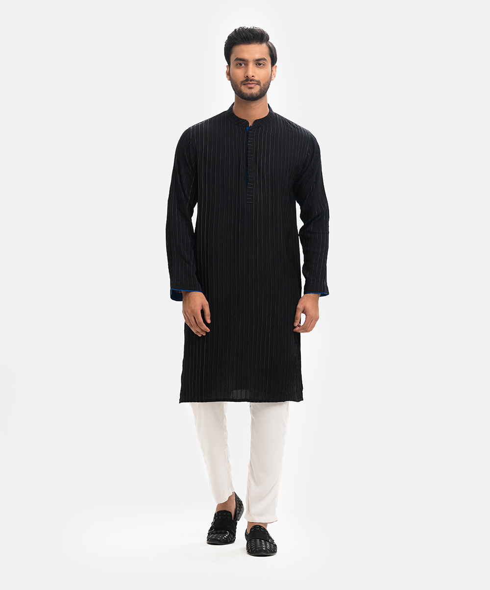 Men’s slim-fitted panjabi in cotton fabric. Mandarin collar, inseam pockets, and long sleeves. All-over pin tuck with line stitching.
