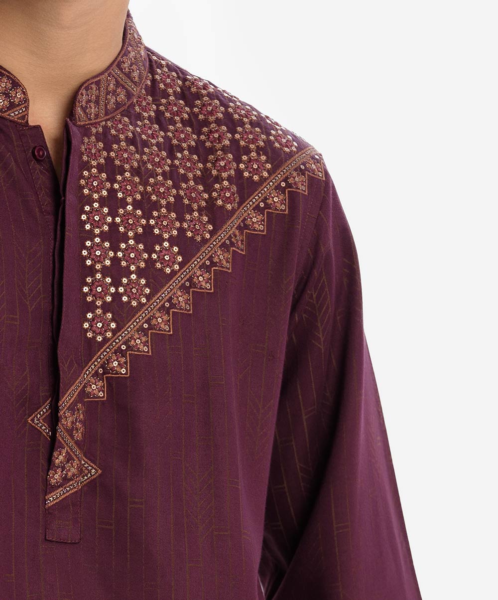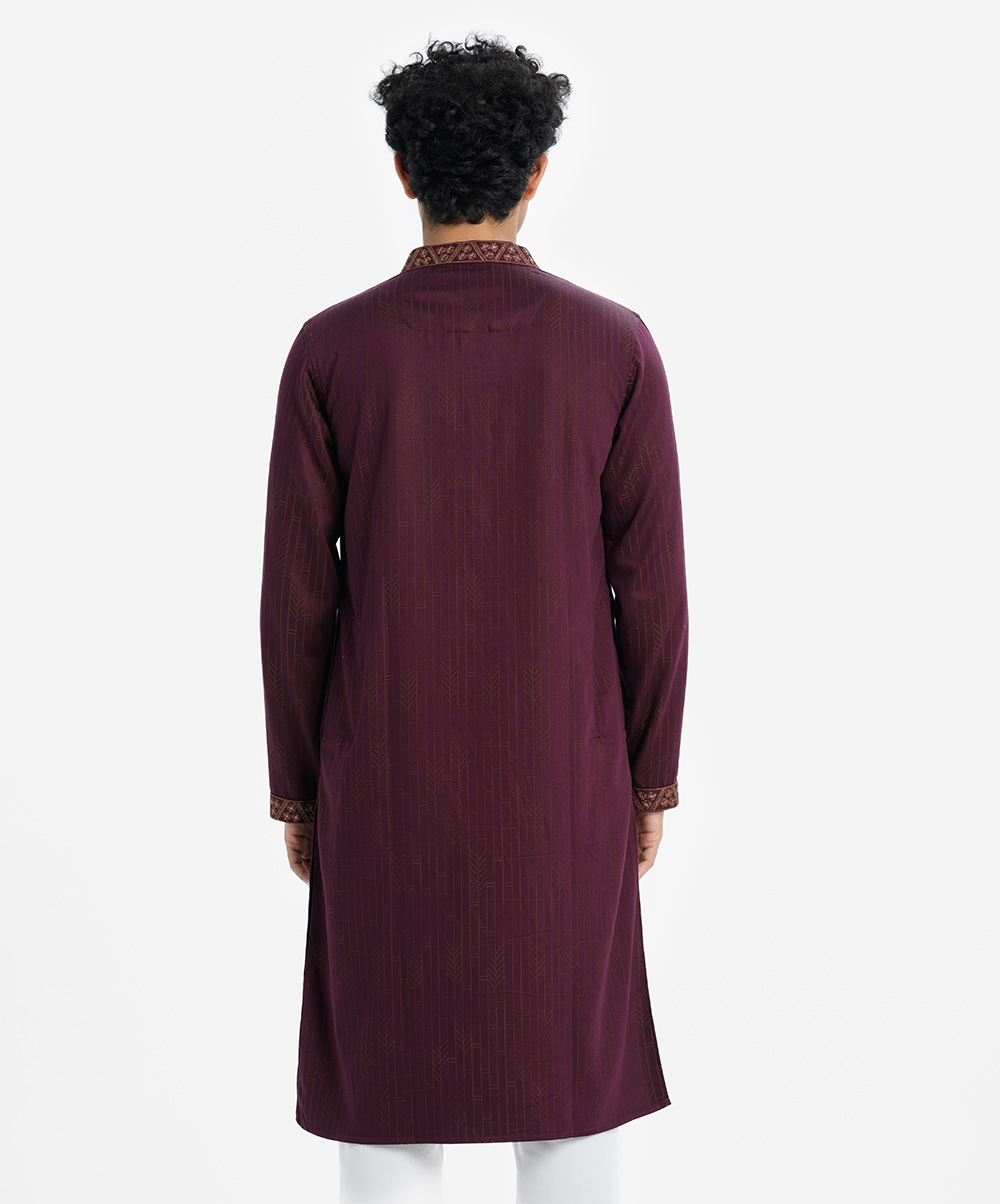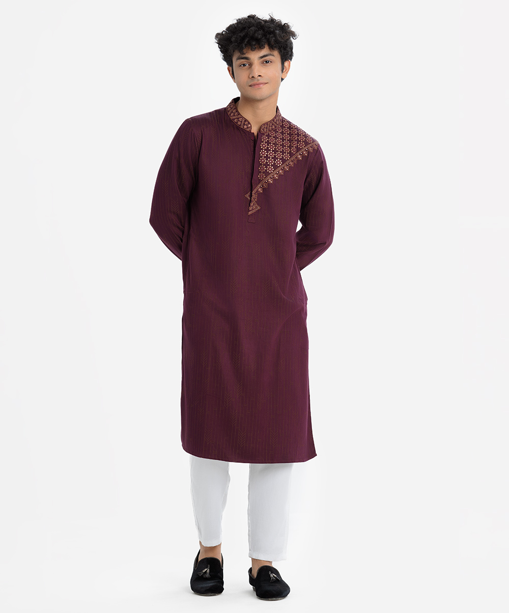 Men’s slim-fitted panjabi in jacquard fabric.Mandarin collar, inseam pockets. Embroidery and sequence at the front.