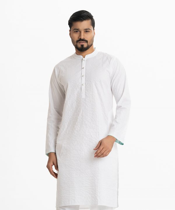 Men’s slim fitted panjabi in textured cotton fabric. Mandarin collar, inseam pockets, button fastening and line stitching at the front.