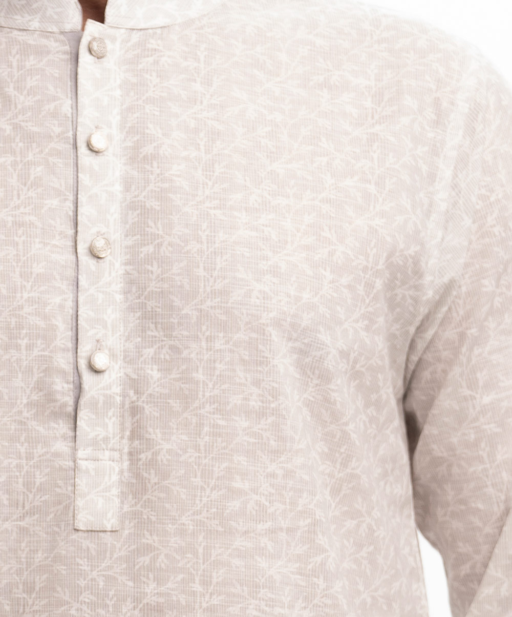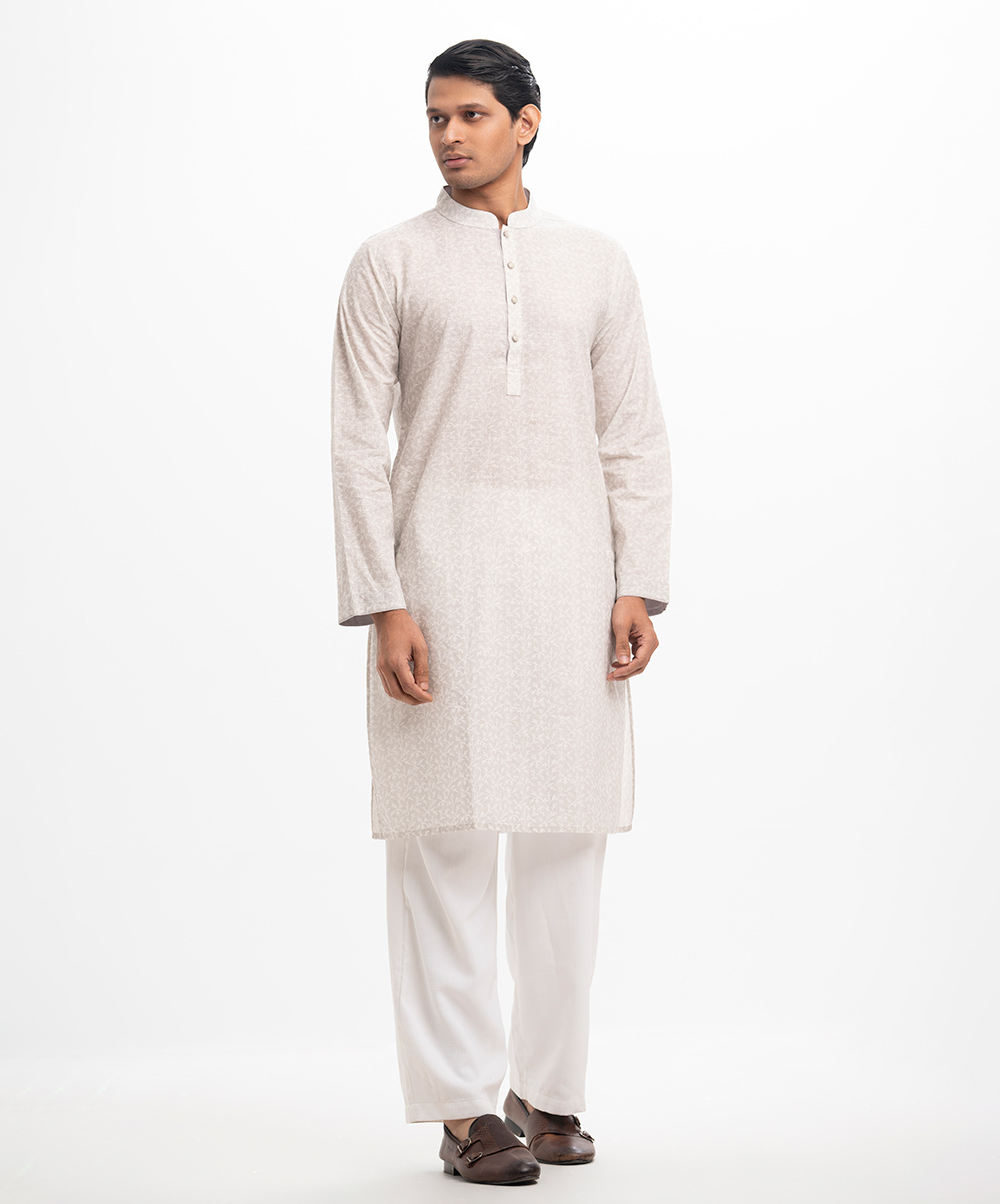 Men’s printed fitted panjabi in cotton fabric. Mandarin collar, buttons placket & full sleeves. Inseam pockets.