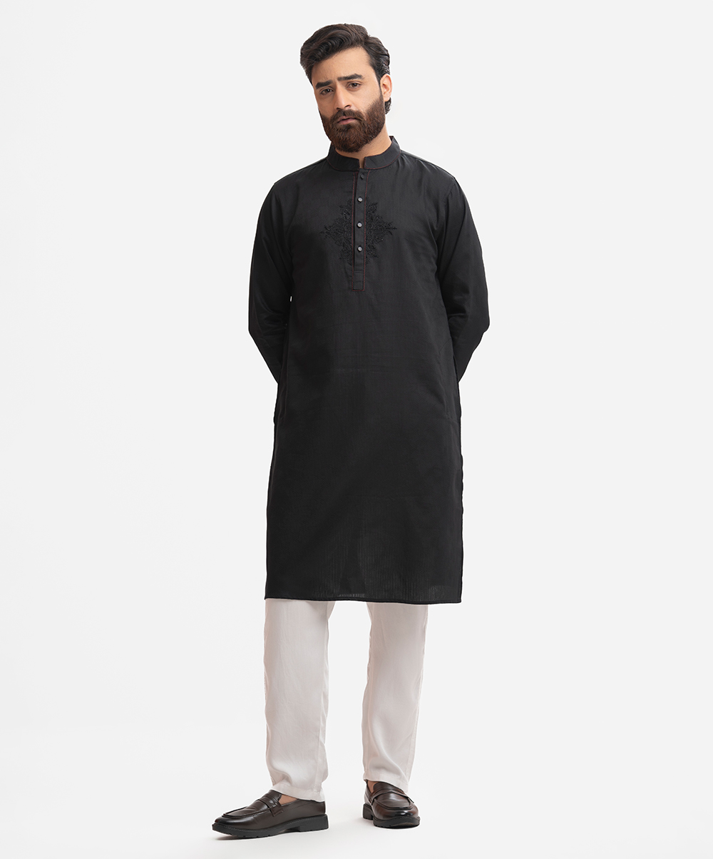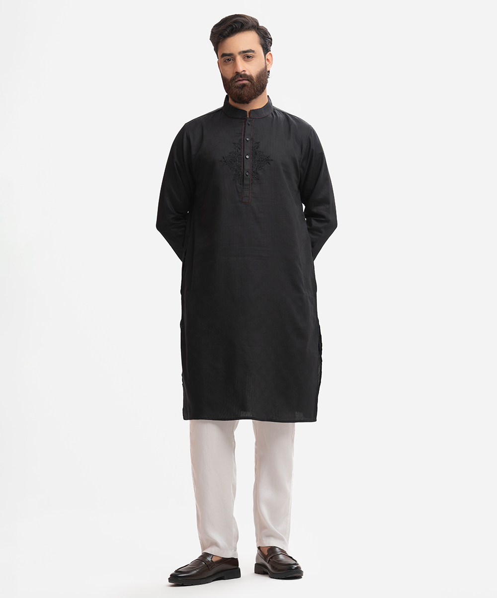 Men’s fitted panjabi in cotton fabric. Long sleeves, inseam side pockets. Handstitch and karchupi details.