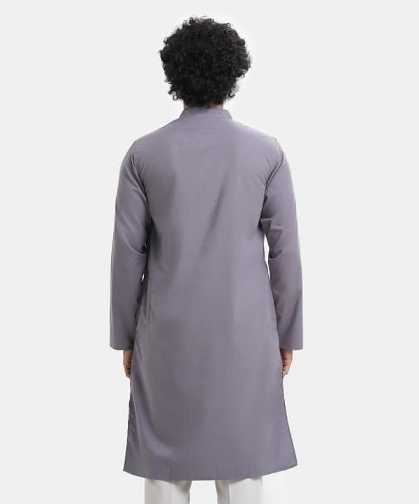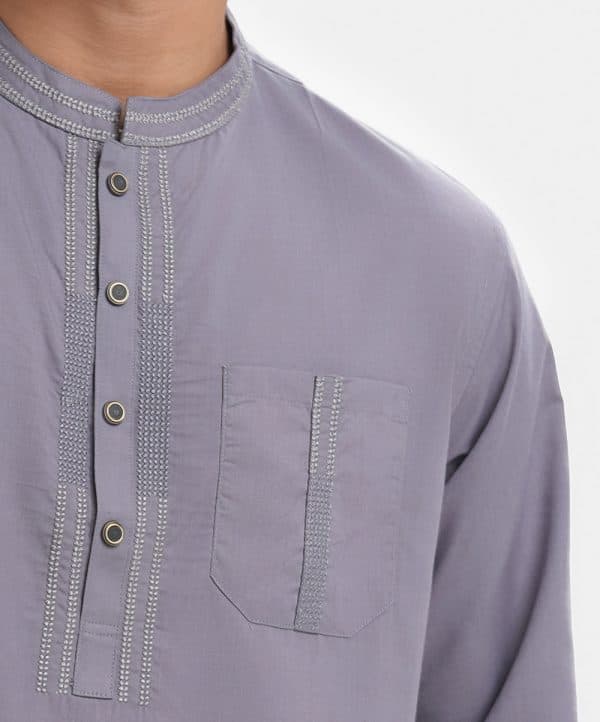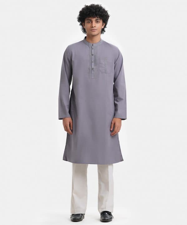 Men’s single color fitted panjabi in cotton blended fabric. Embroidery at mandarin collar, buttons placket side and front pocket. Full sleeves & inseam side pockets.