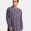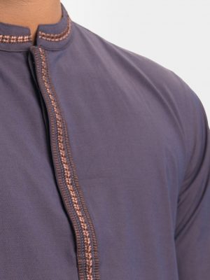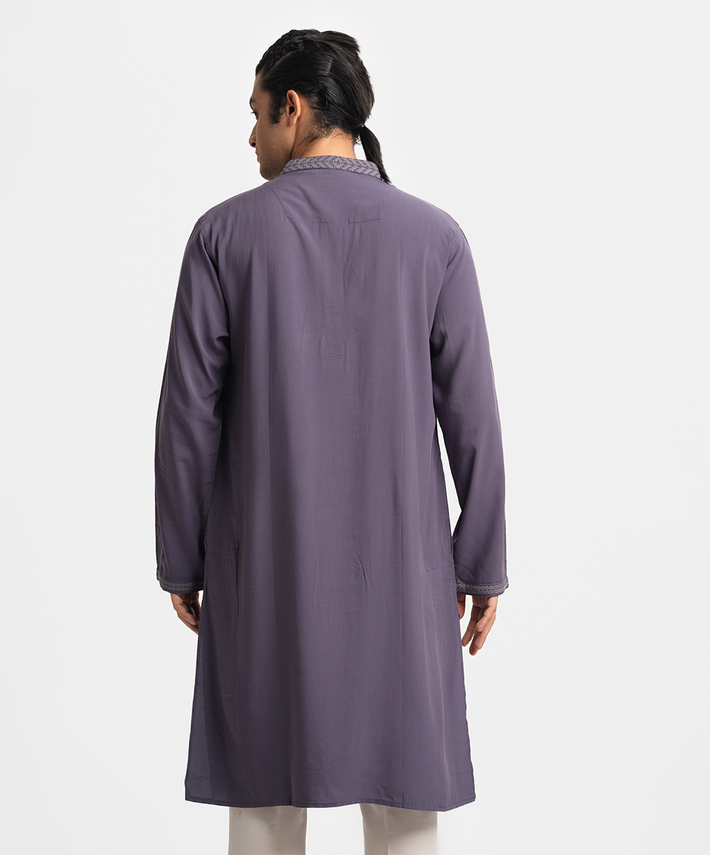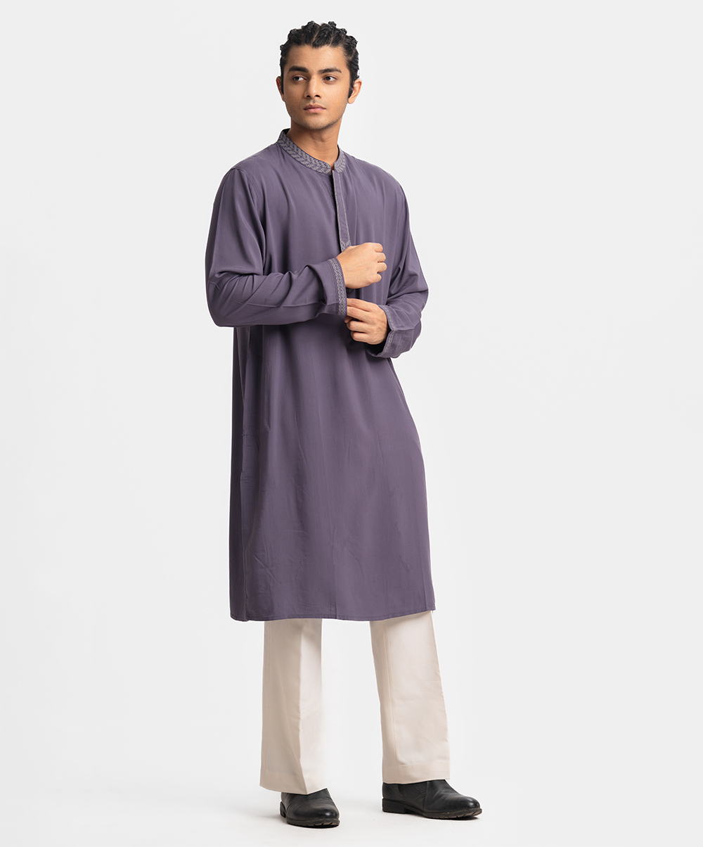 Men’s fitted panjabi in viscose fabric. Embroidery at mandarin collar & placket. Full sleeves and inseam pockets.