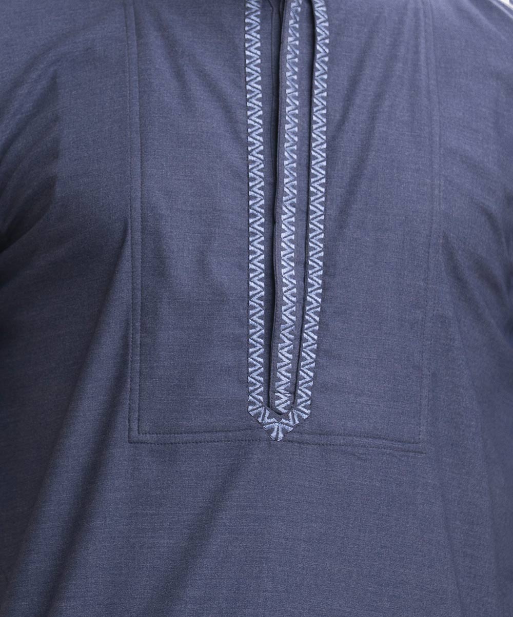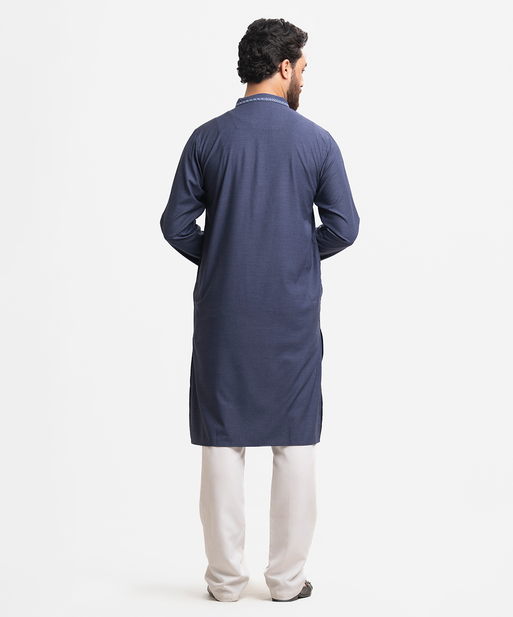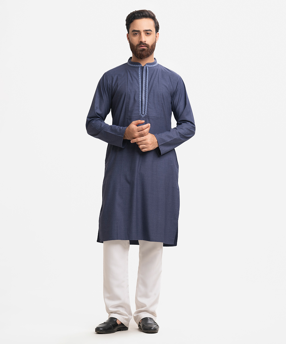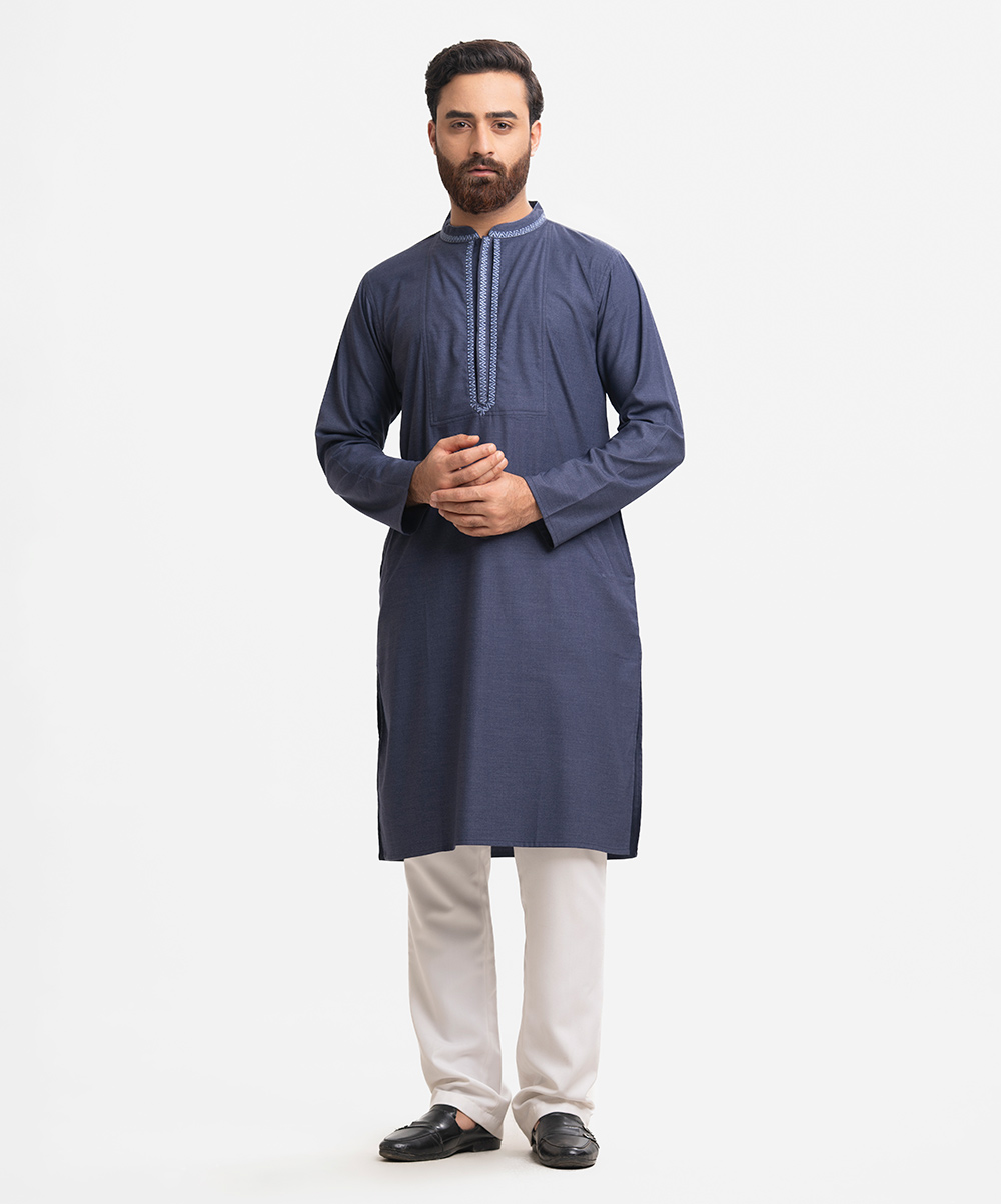 Men’s fitted panjabi in blended fabric. Long sleeves, inseam side pockets. Embroidery on the collar and placket.