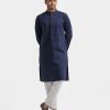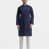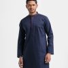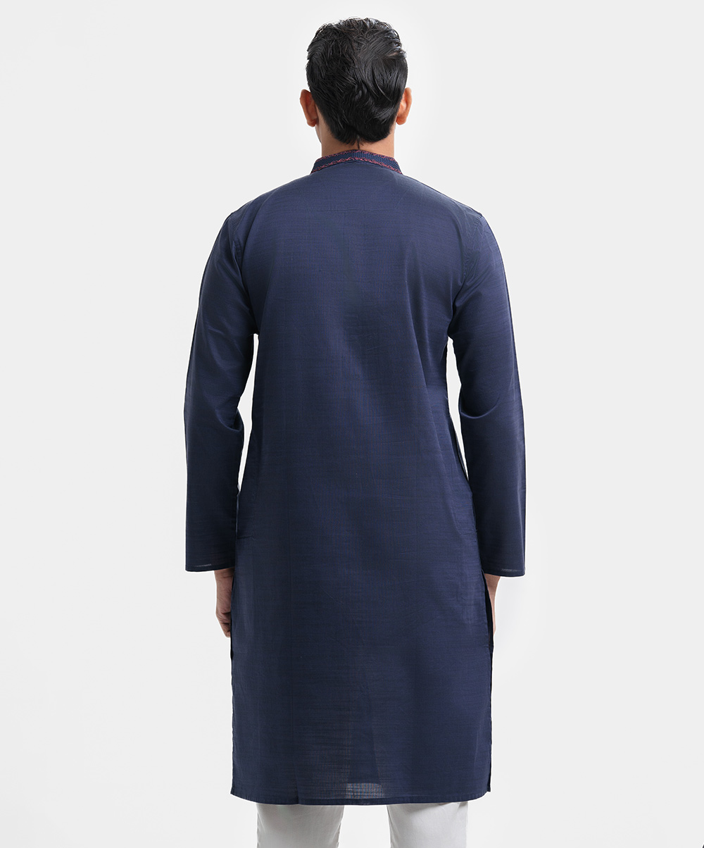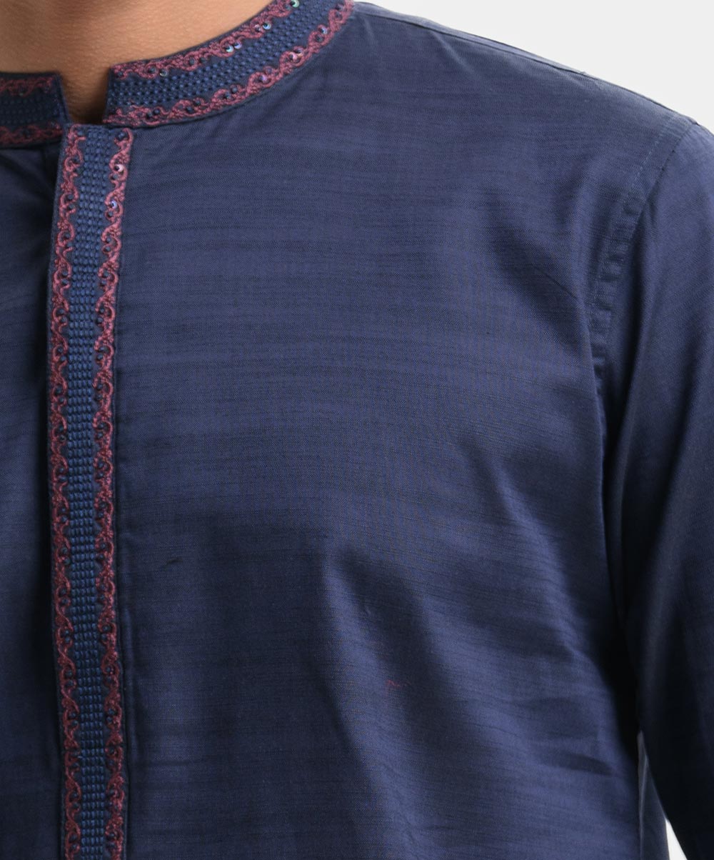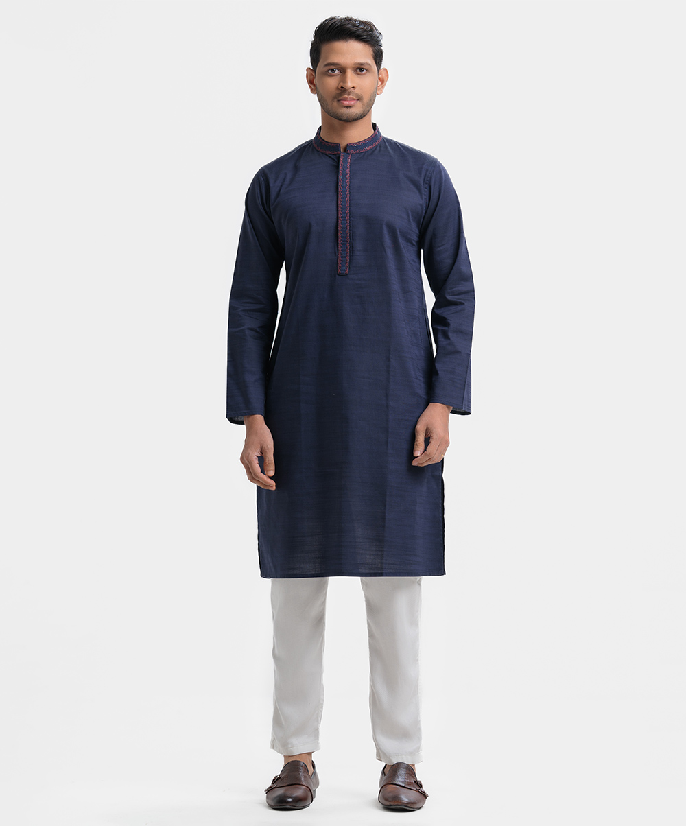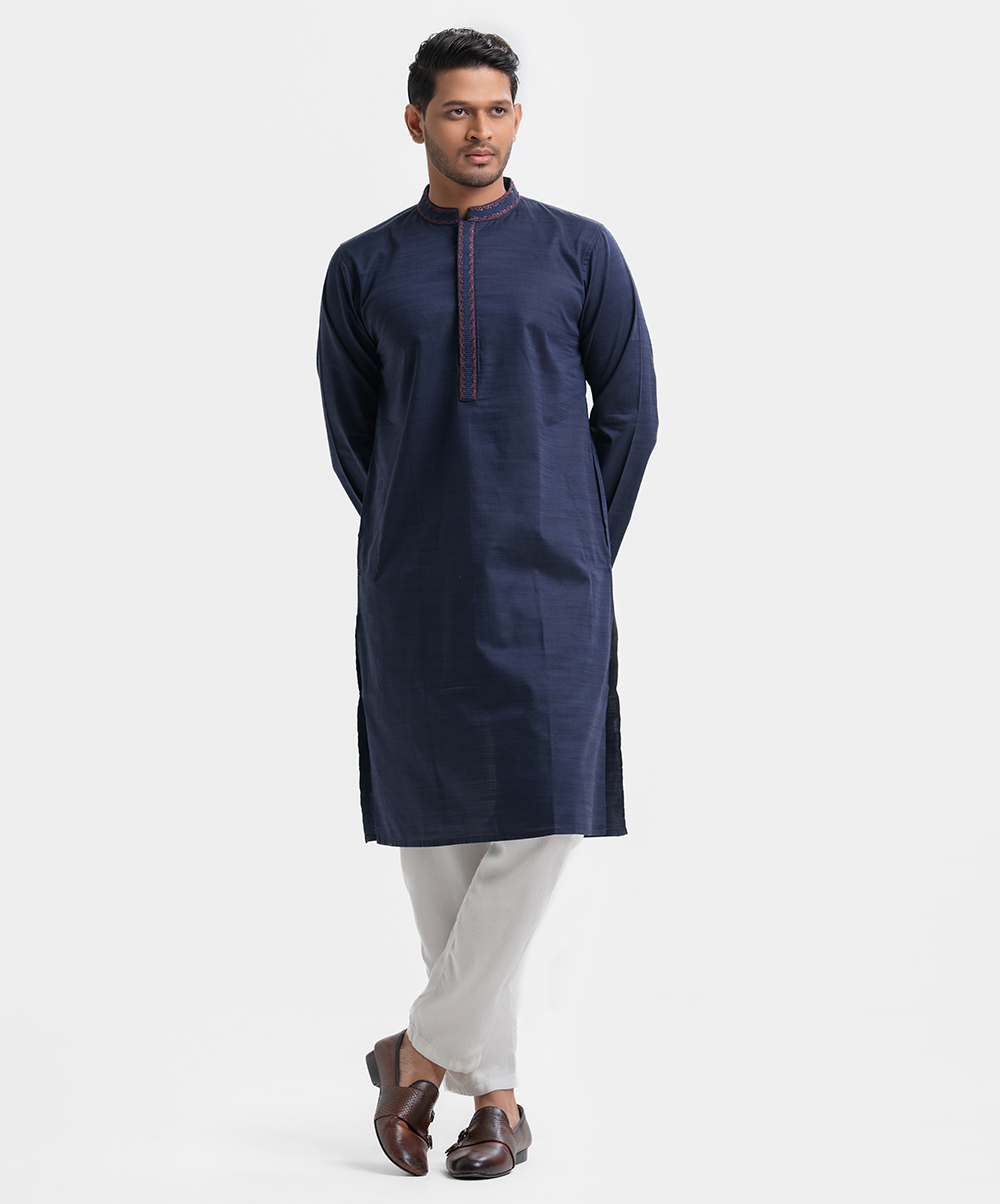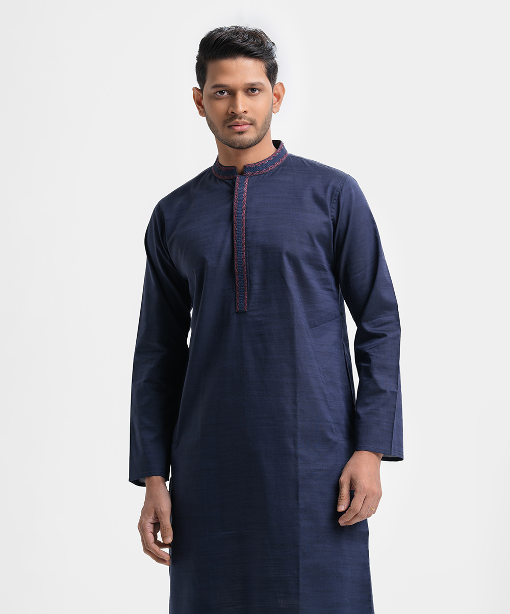 Men’s slim fitted panjabi in cotton fabric. Embroidery at mandarin collar with hidden buttons placket. Full sleeves & inseam pockets.