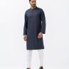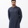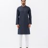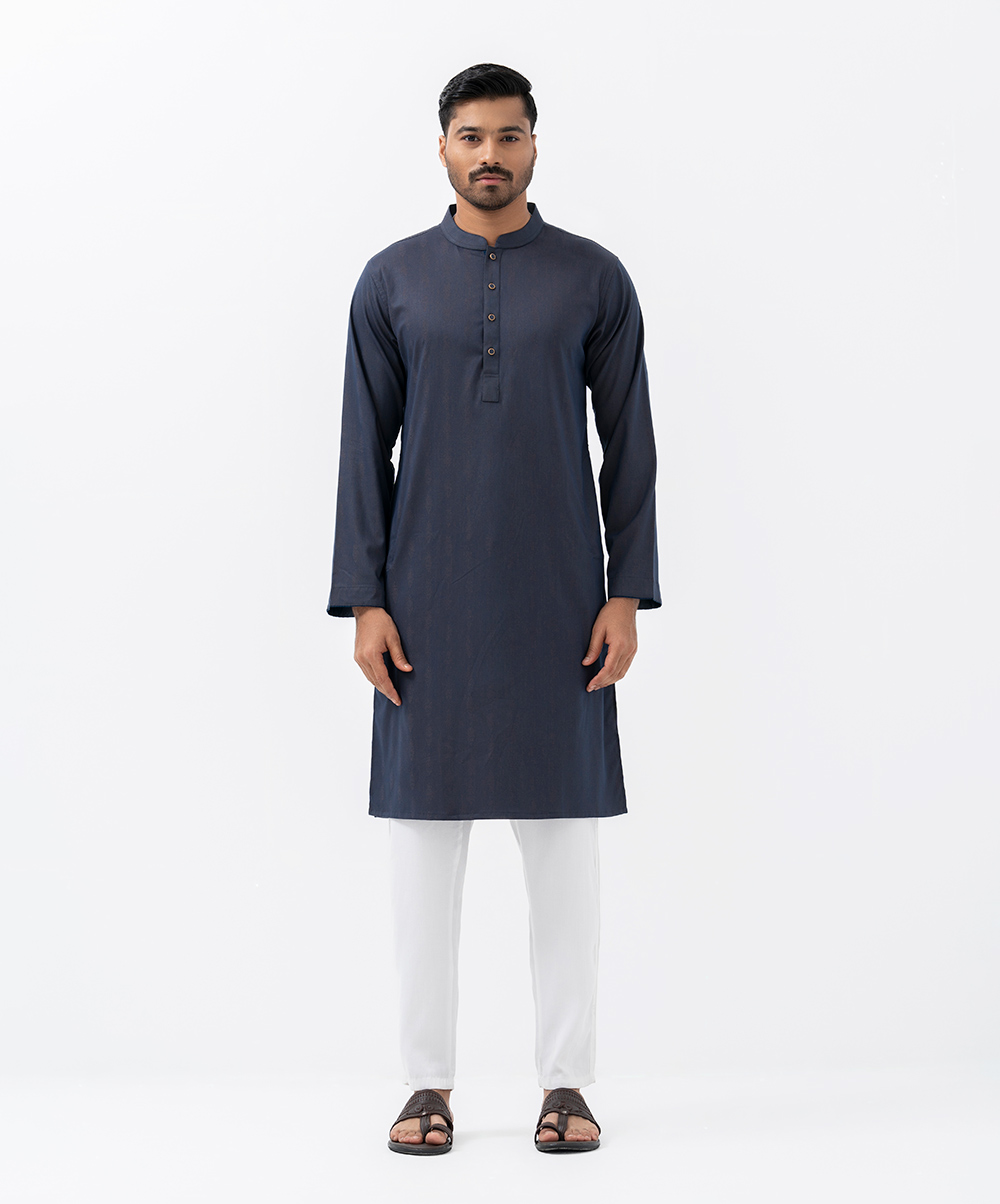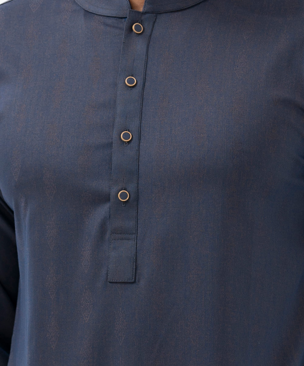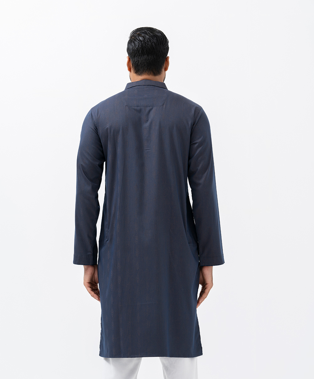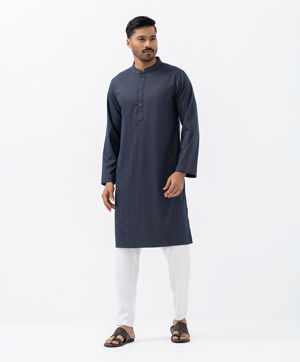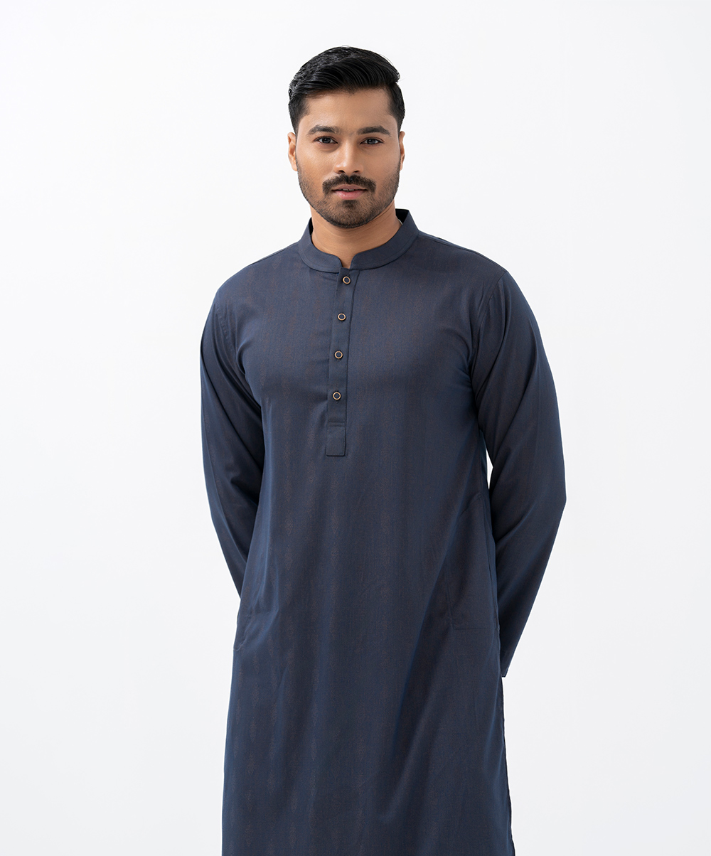 Men’s slim fitted panjabi in jacquard fabric. Mandarin collar, inseam pockets and long sleeves.