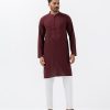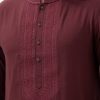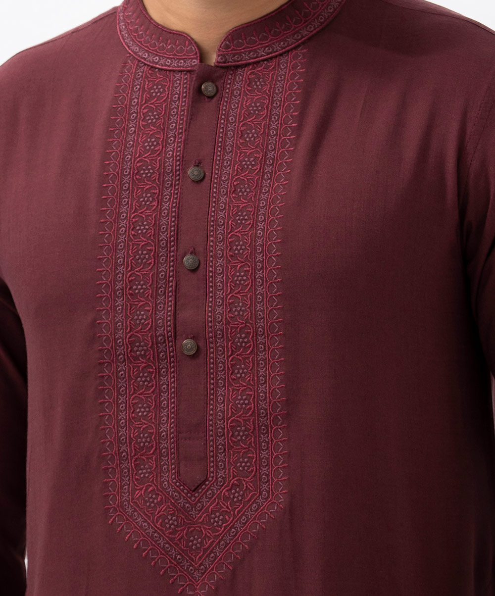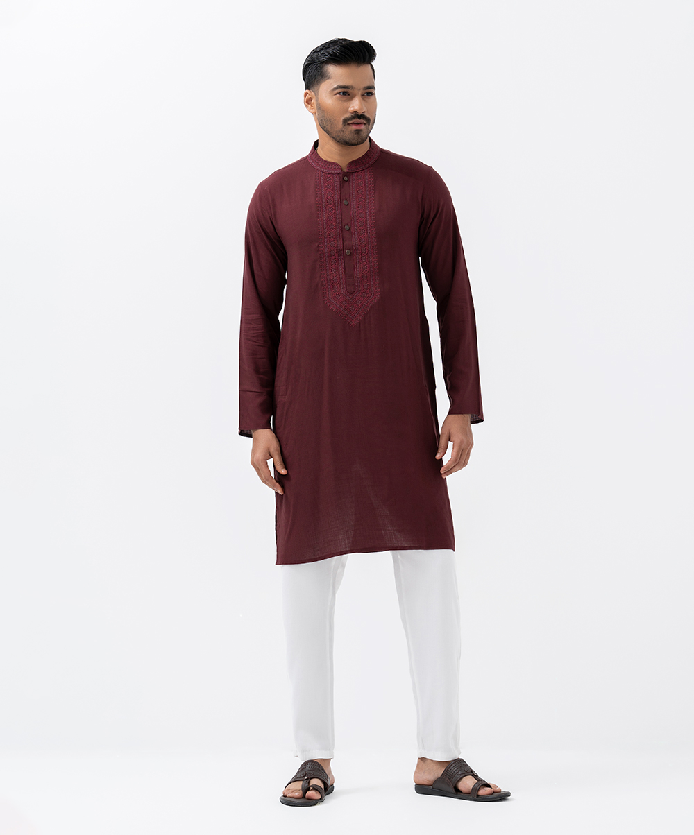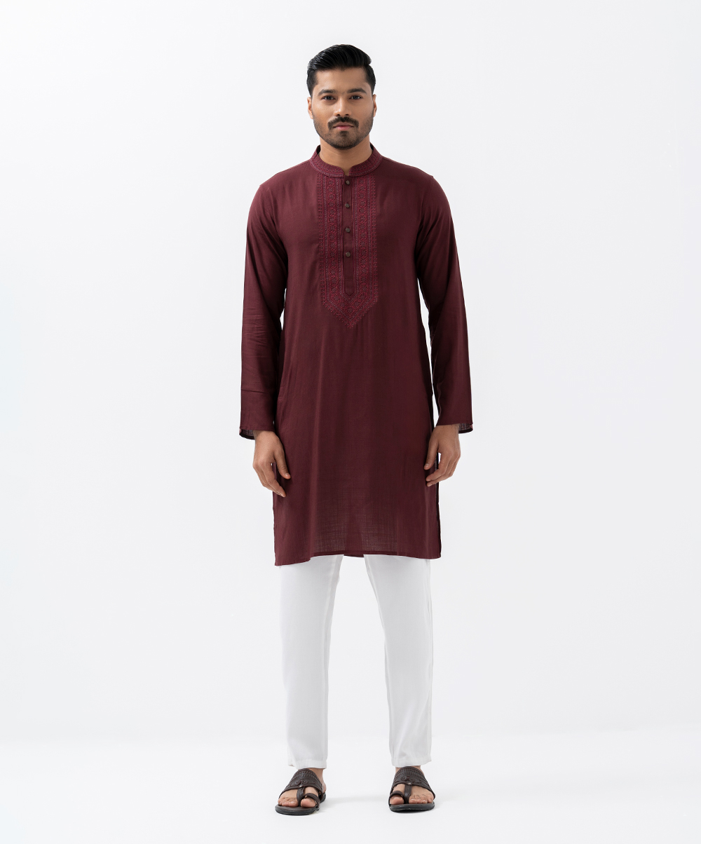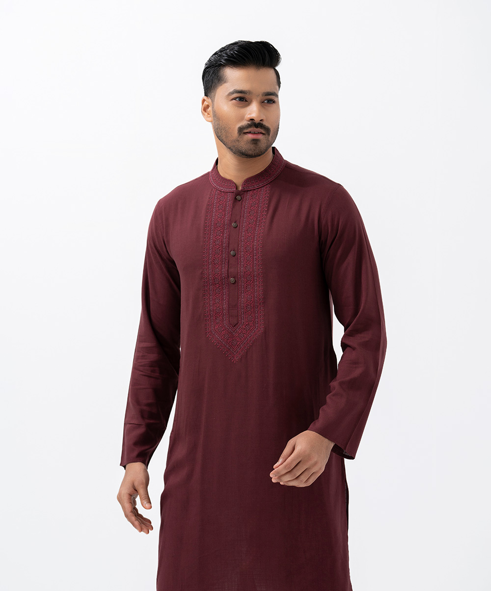 Men’s fitted panjabi in viscose fabric. Embroidery at the mandarin collar & placket. Full sleeves and inseam pockets.