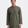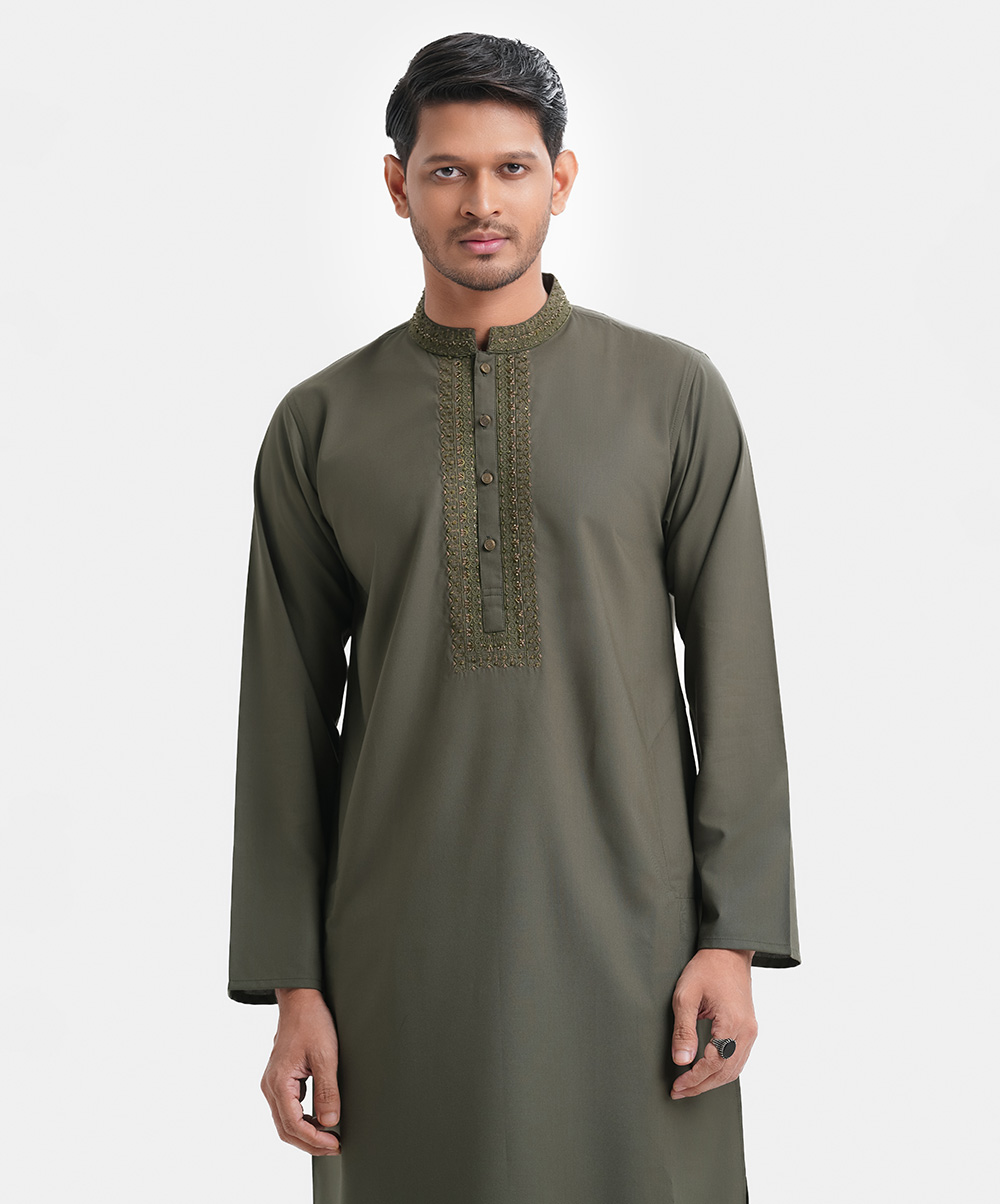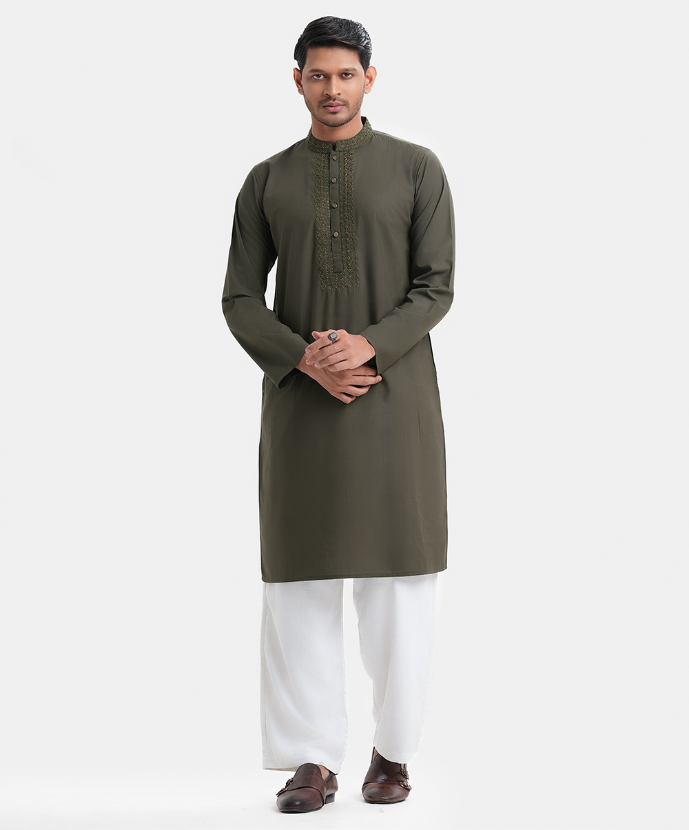 Men’s single color fitted panjabi in blended fabric. Mandarin collar, full sleeves and karchupi at front. Inseam pockets.