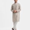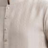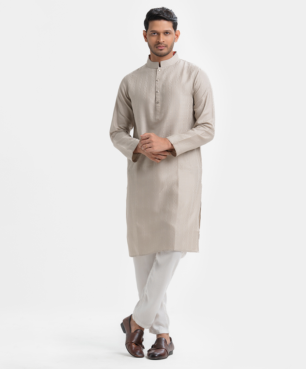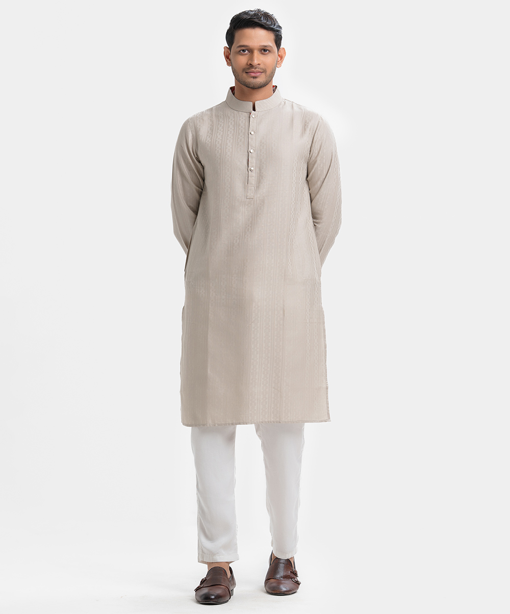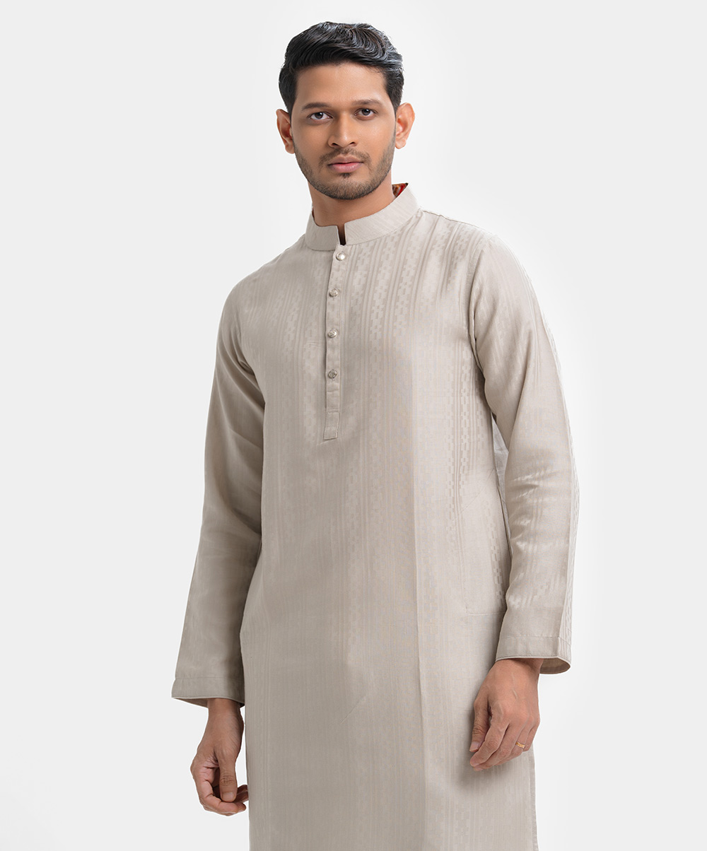 Men’s fitted panjabi in jacquard cotton fabric. Mandarin collar, buttons placket & full sleeves. Inseam pockets.