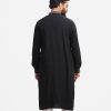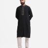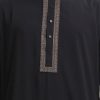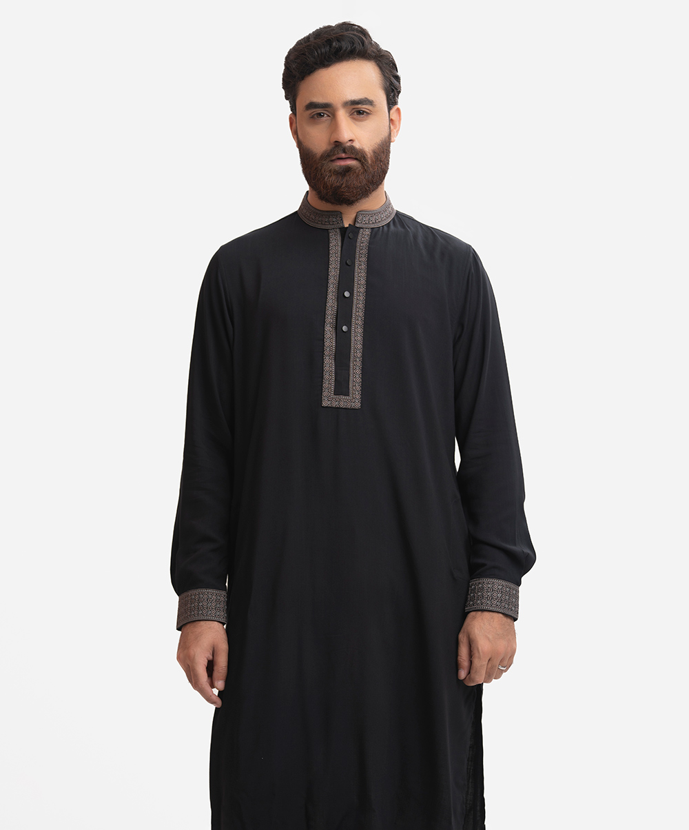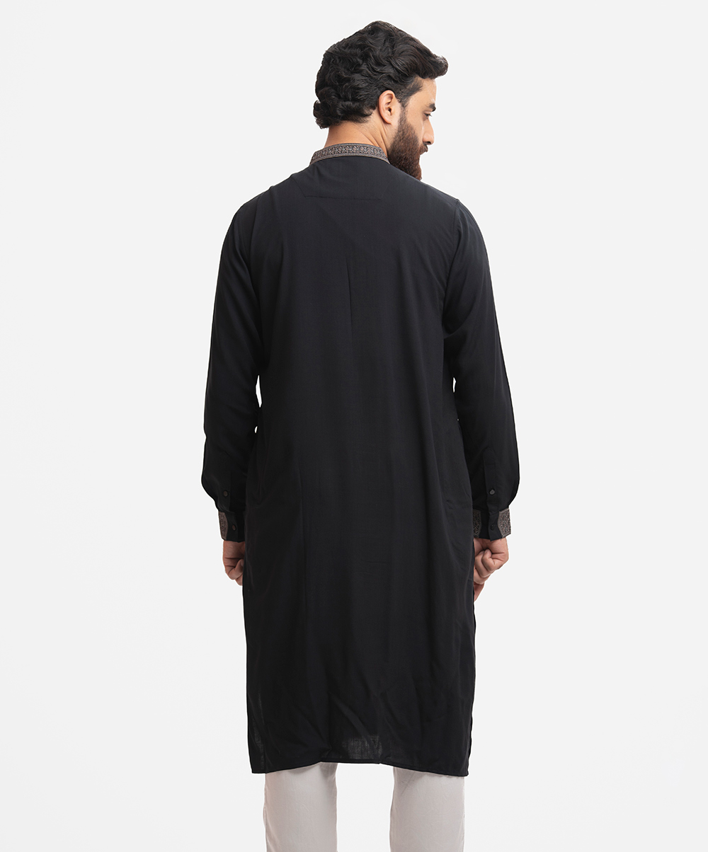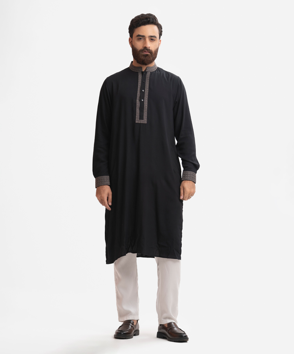 Men’s fitted panjabi in viscose fabric. Embroidery at the mandarin collar & placket. Full sleeves and inseam pockets.