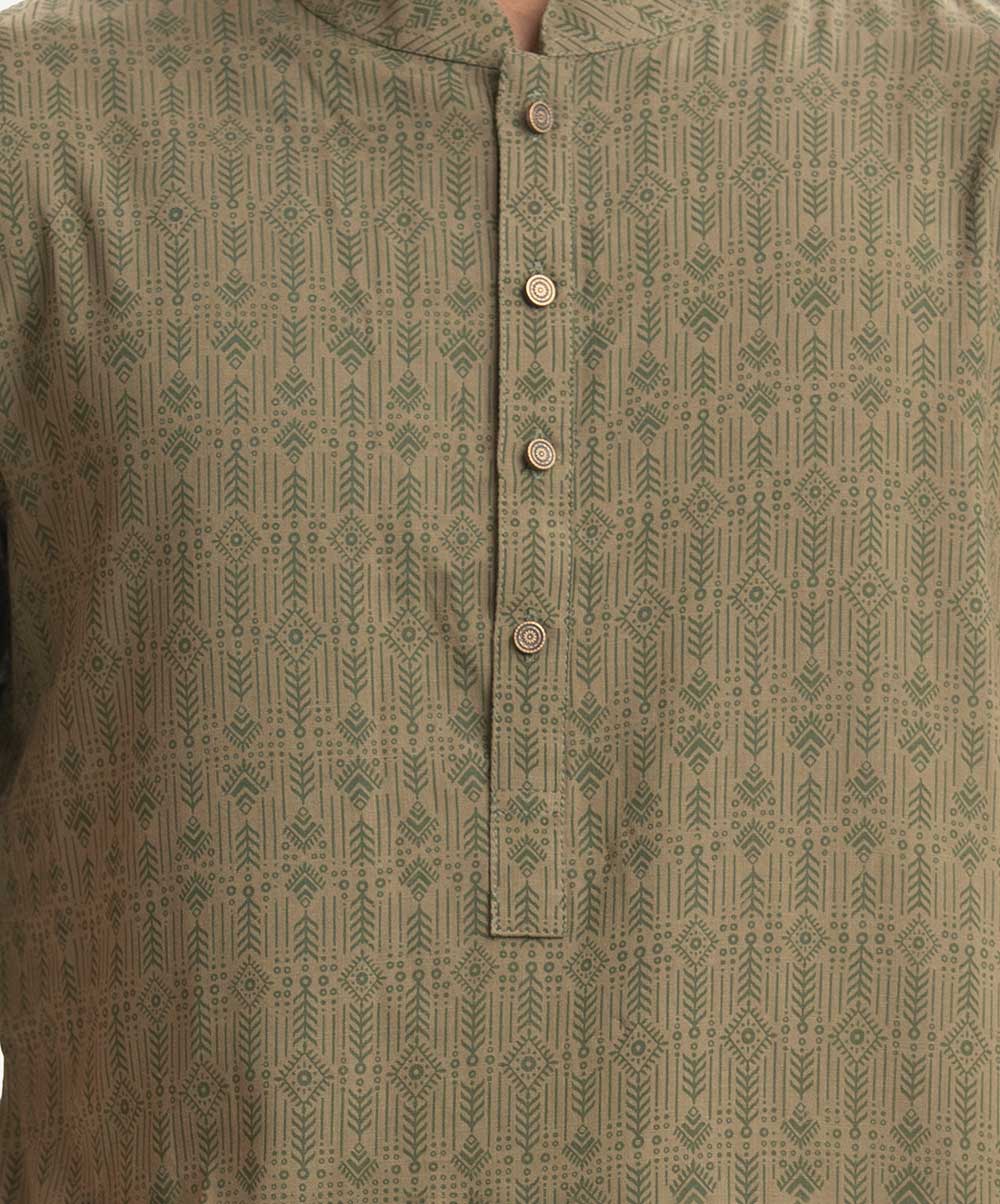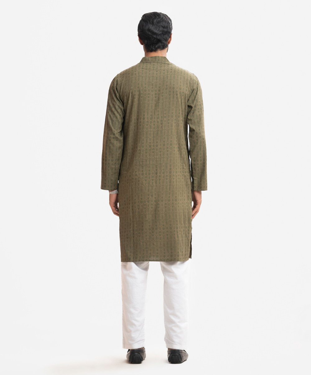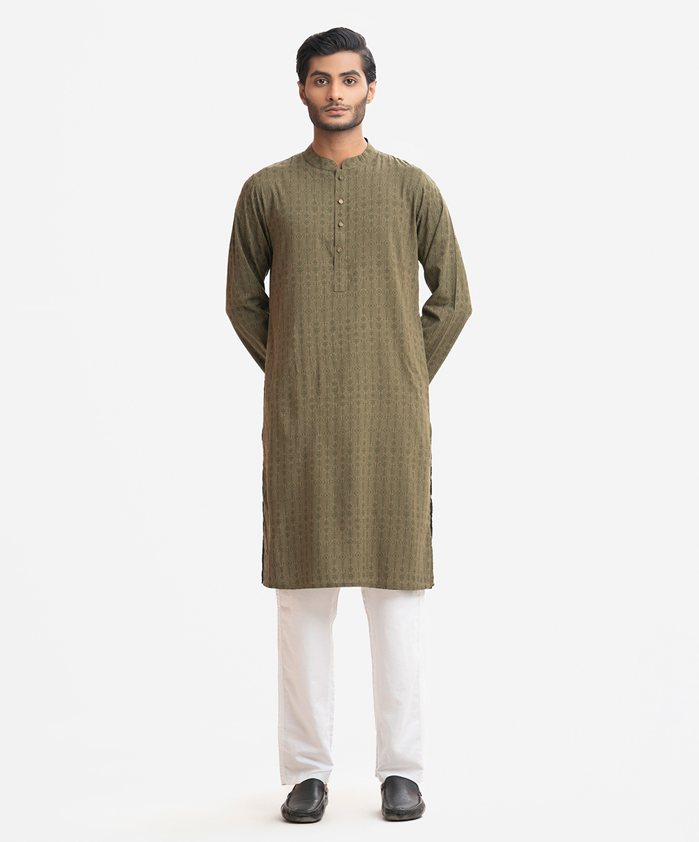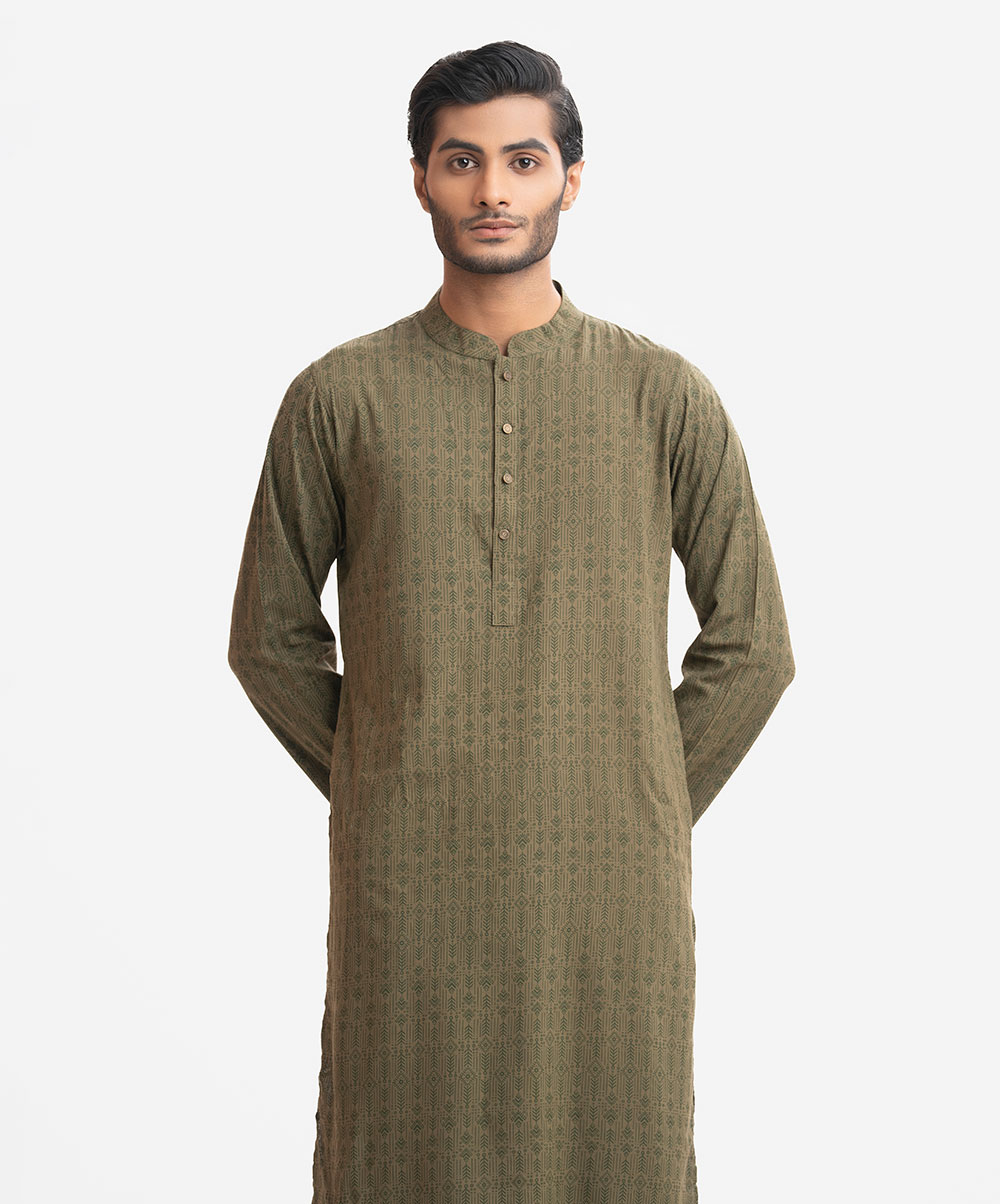 Men’s printed fitted panjabi in viscose fabric. Mandarin collar & placket. Full sleeves and inseam pockets.