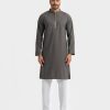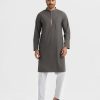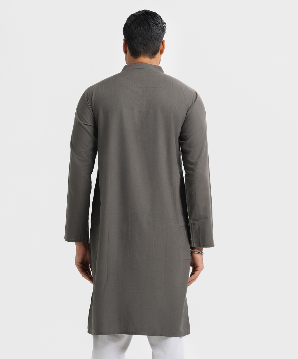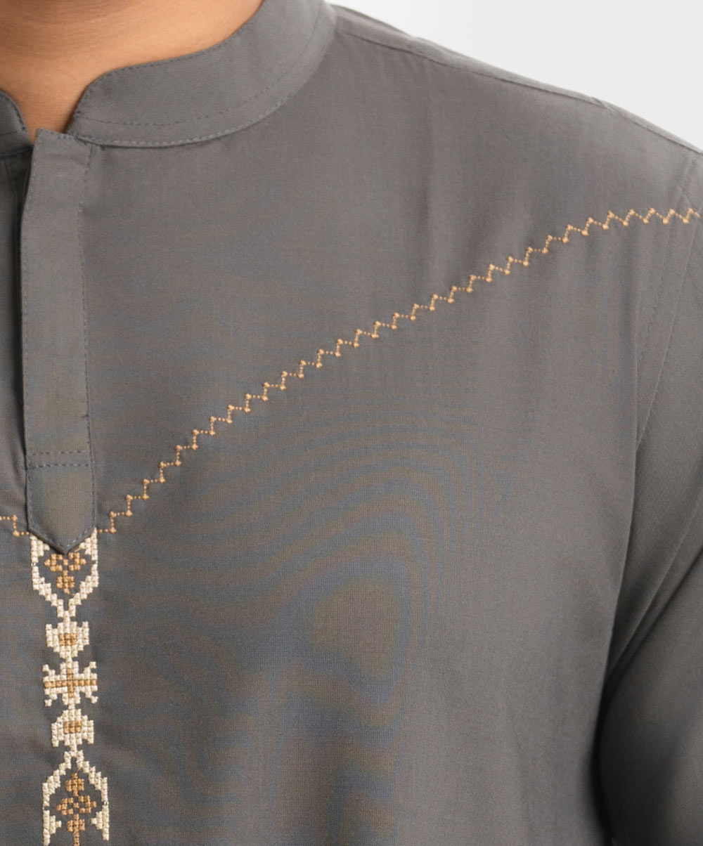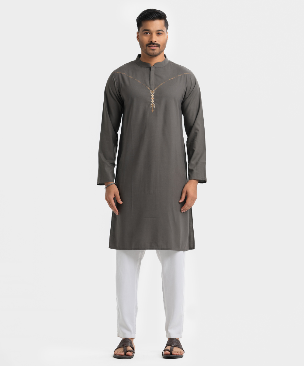 Men’s slim fitted panjabi in blended fabric. Mandarin collar with hidden buttons placket & full sleeves. Embroidery at front.