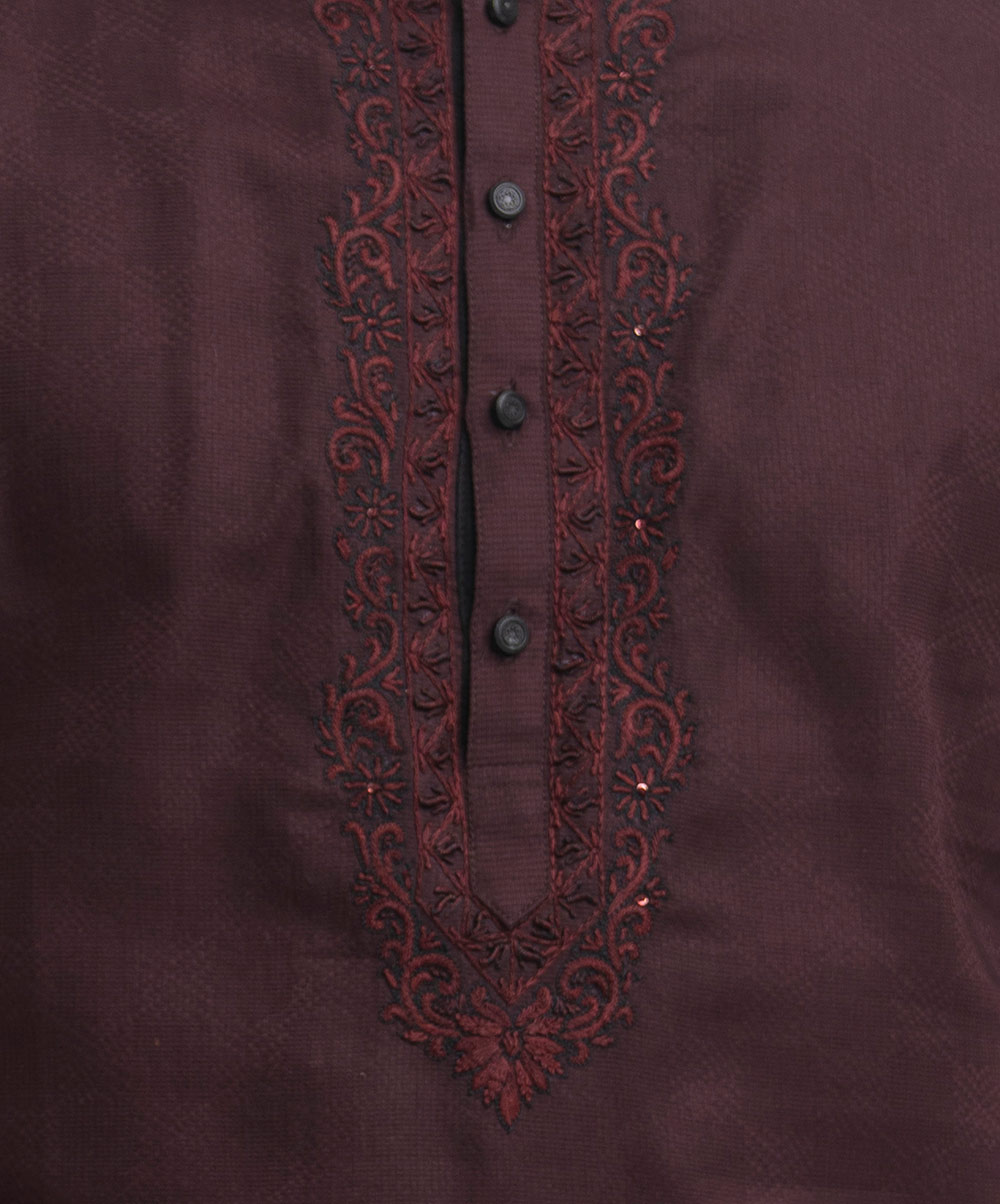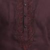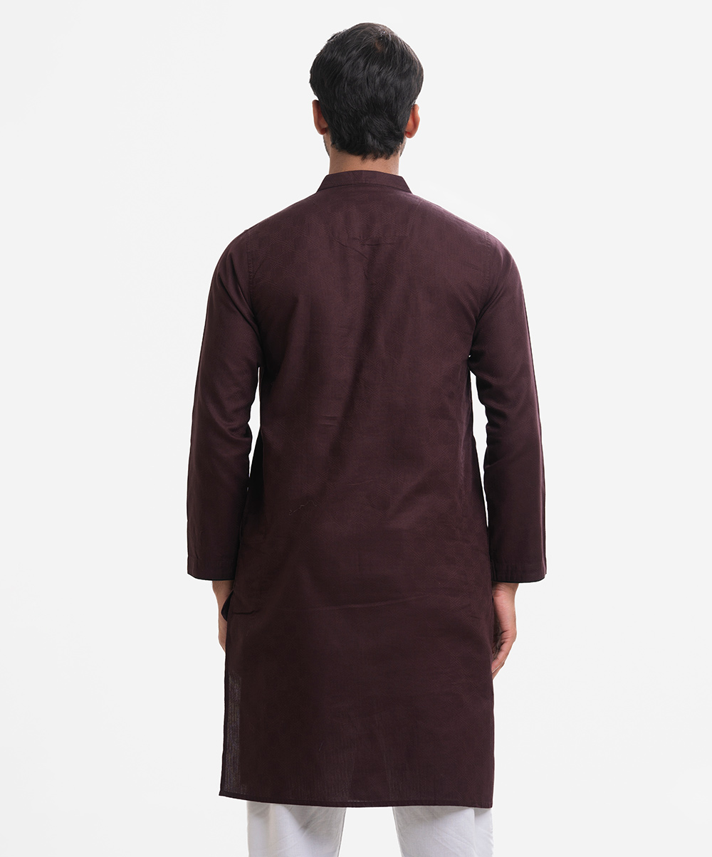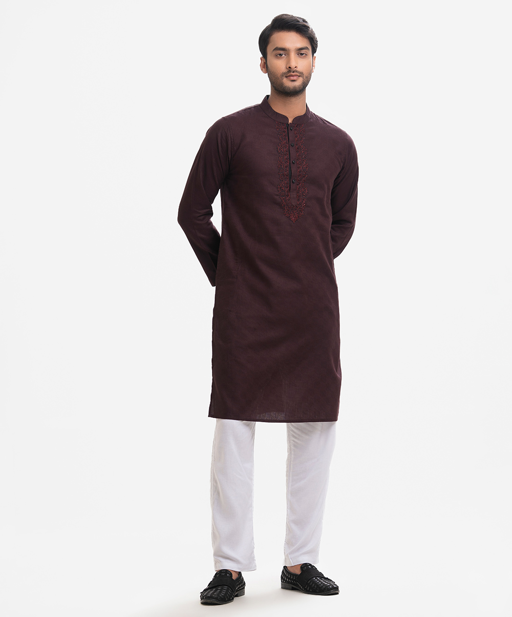 Men’s fitted panjabi in cotton fabric. Long sleeves, inseam side pockets. Handstitch embroidery on the placket.