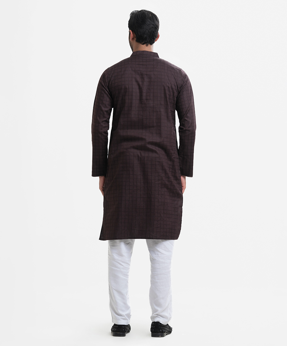 Men’s slim fitted panjabi in cotton jacquard fabric. Mandarin collar with hidden metal buttons on the placket & full sleeves. Inseam pockets.