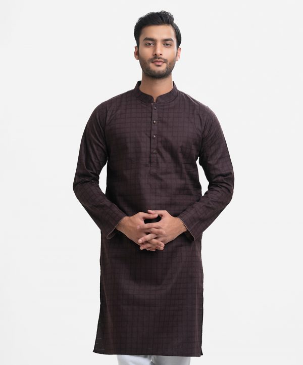 Men’s slim fitted panjabi in cotton jacquard fabric. Mandarin collar with hidden metal buttons on the placket & full sleeves. Inseam pockets.