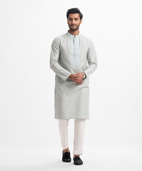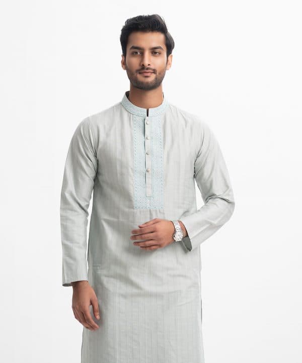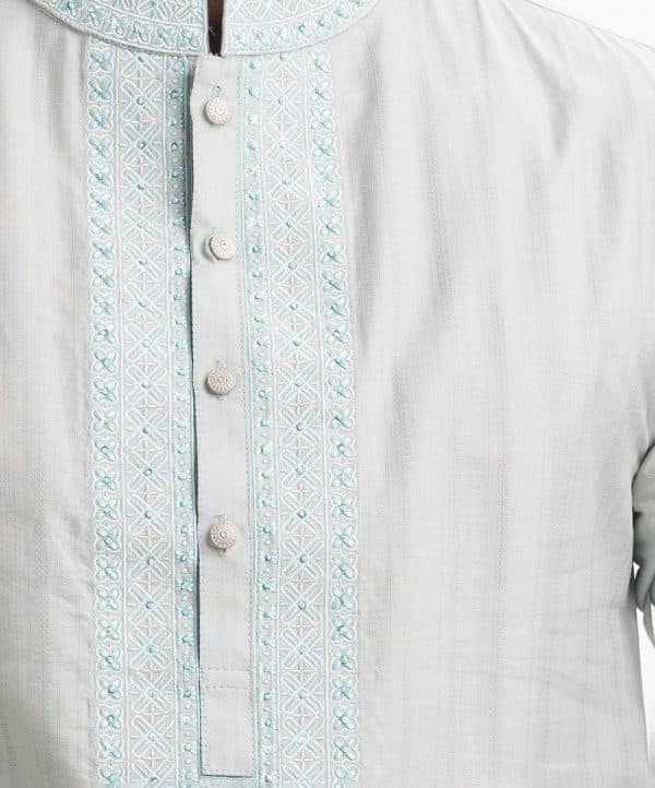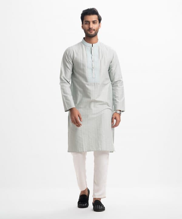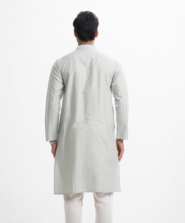 Classic fitted panjabi in cotton jacquard fabric with button closure and inseam side pockets. Embroidery on the collar and placket.
