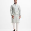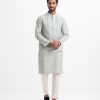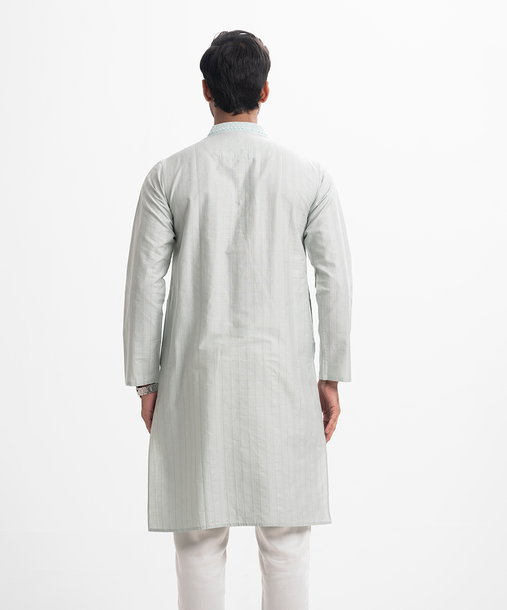 Classic fitted panjabi in cotton jacquard fabric with button closure and inseam side pockets. Embroidery on the collar and placket.