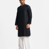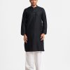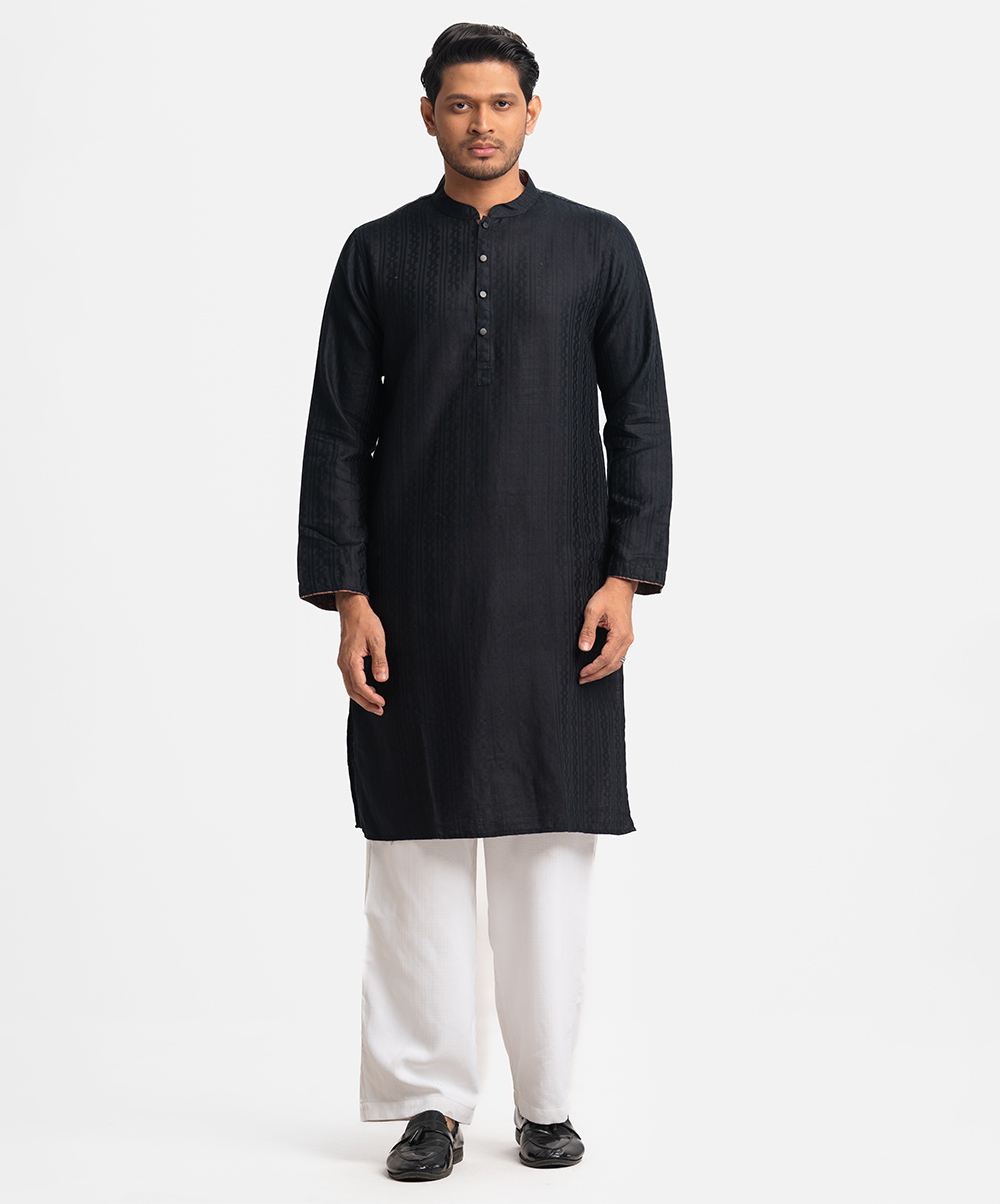 Men’s fitted panjabi in cotton jacquard fabric. Mandarin collar with metal buttons on the placket & full sleeves. Inseam pockets.