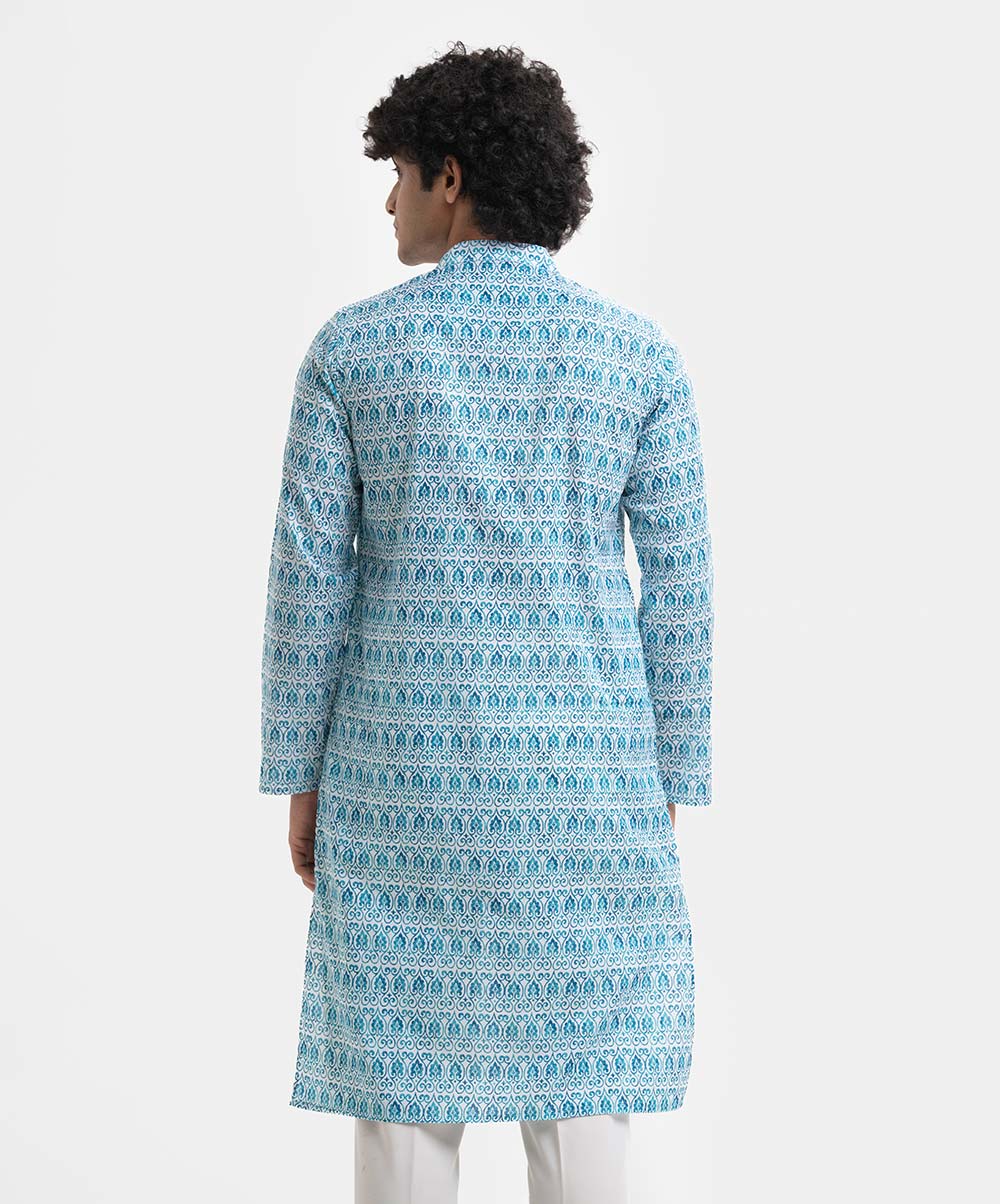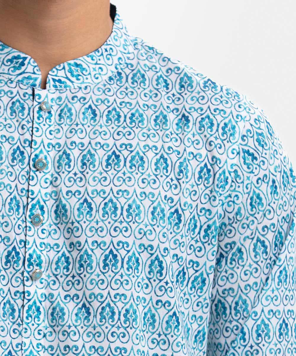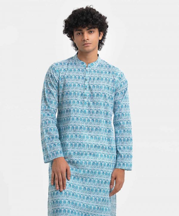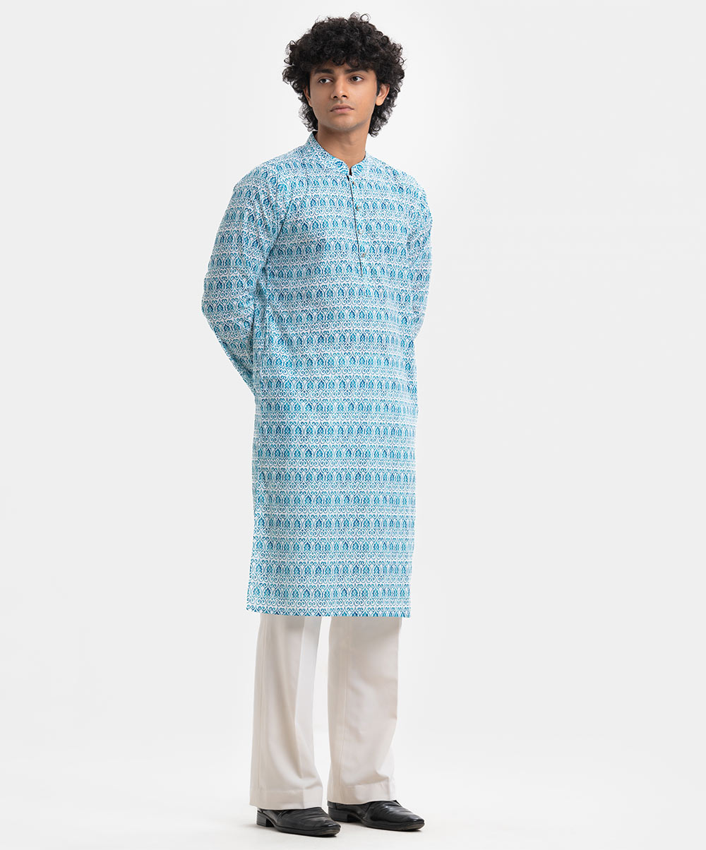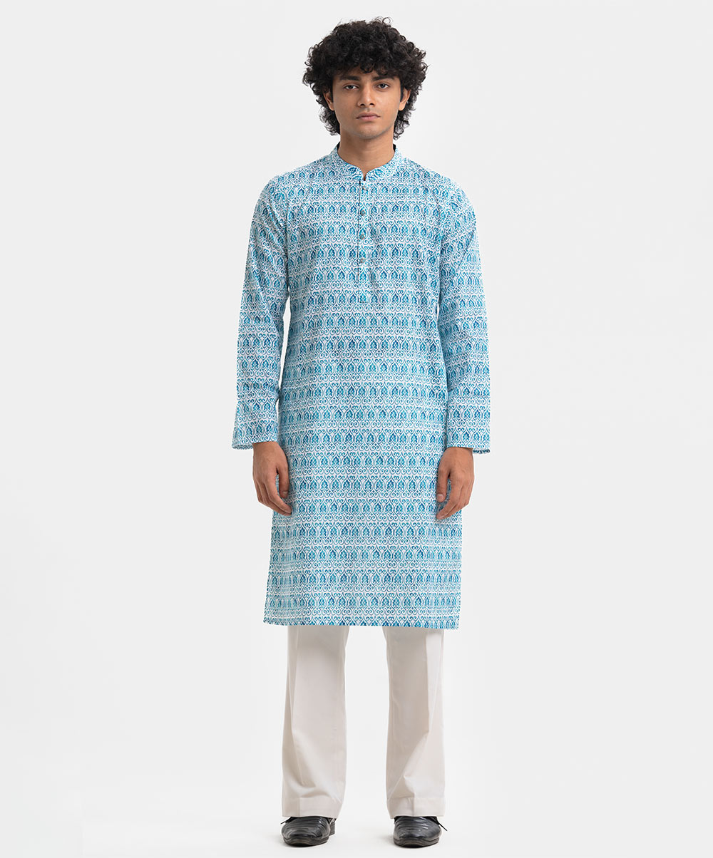 Men’s slim fitted panjabi in printed cotton fabric. Mandarin collar with metal buttons on the placket & full sleeves. Inseam pockets.
