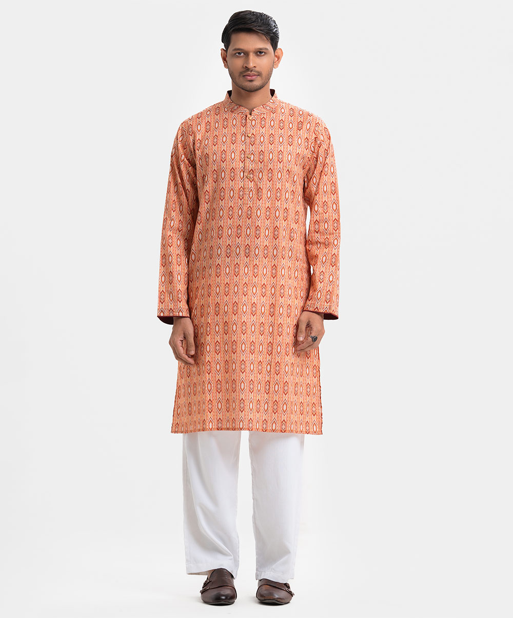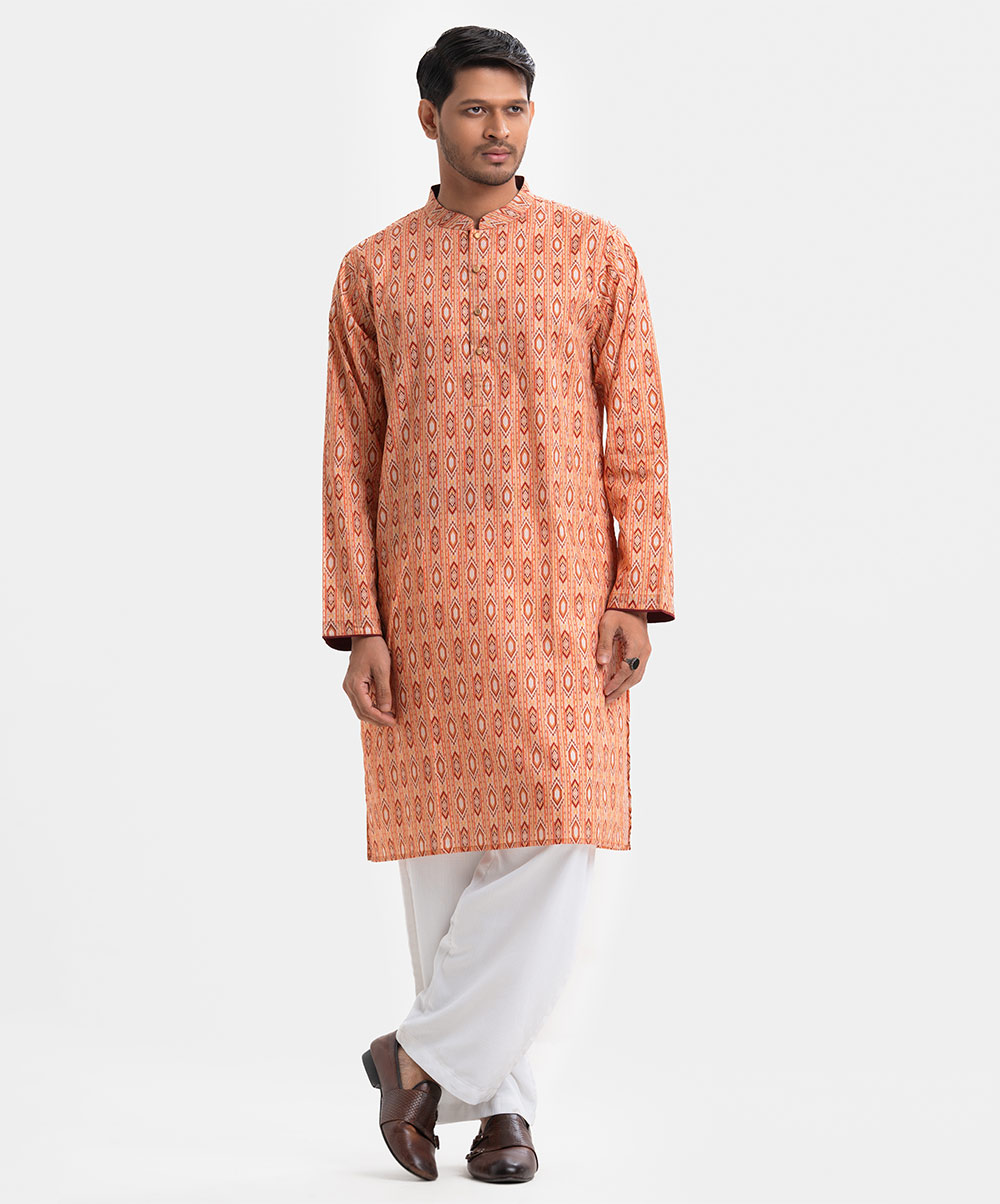 Men’s fitted panjabi in printed cotton fabric. Mandarin collar, buttons placket & full sleeves. Inseam pockets.