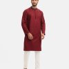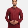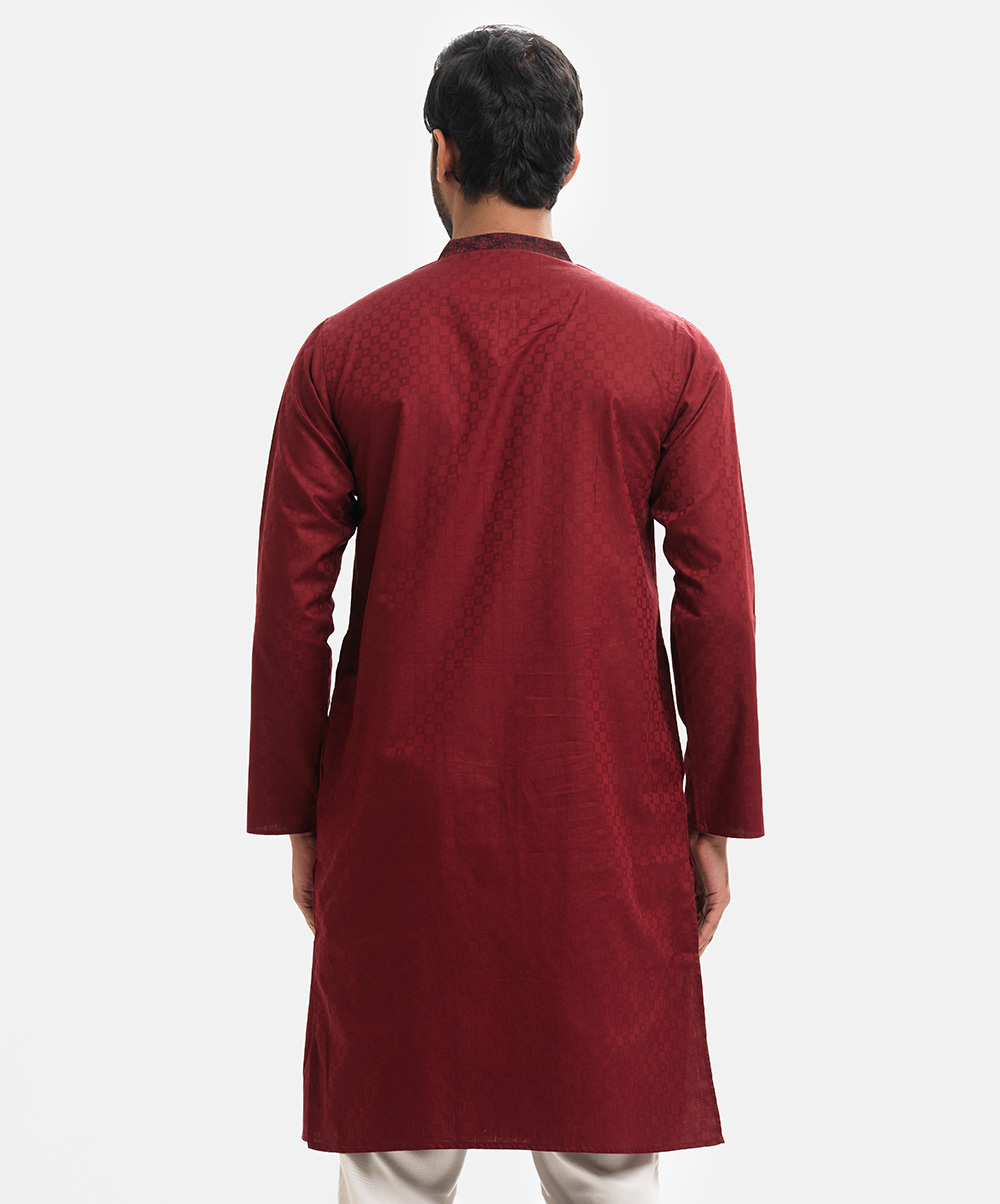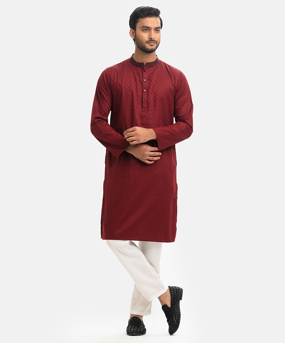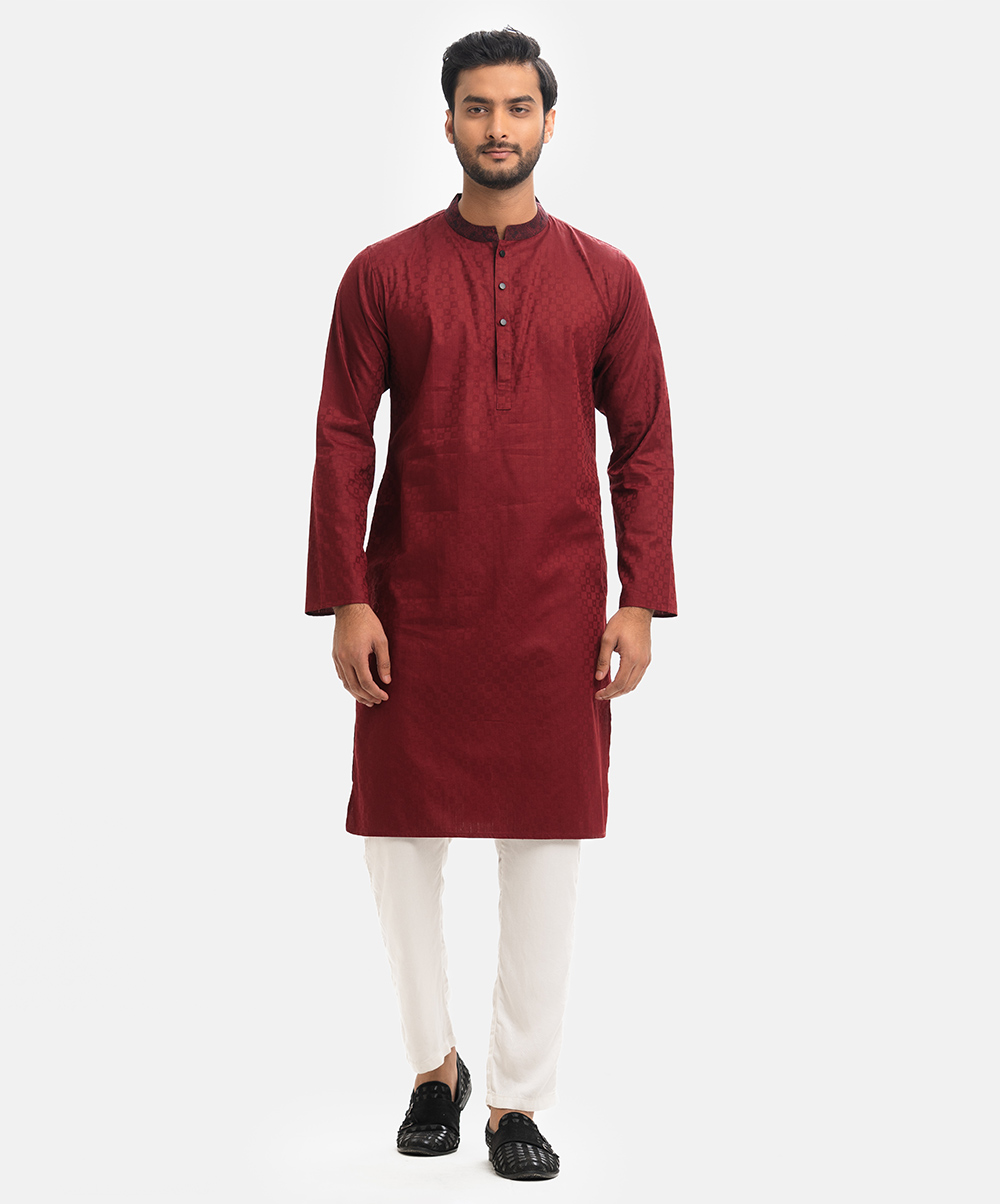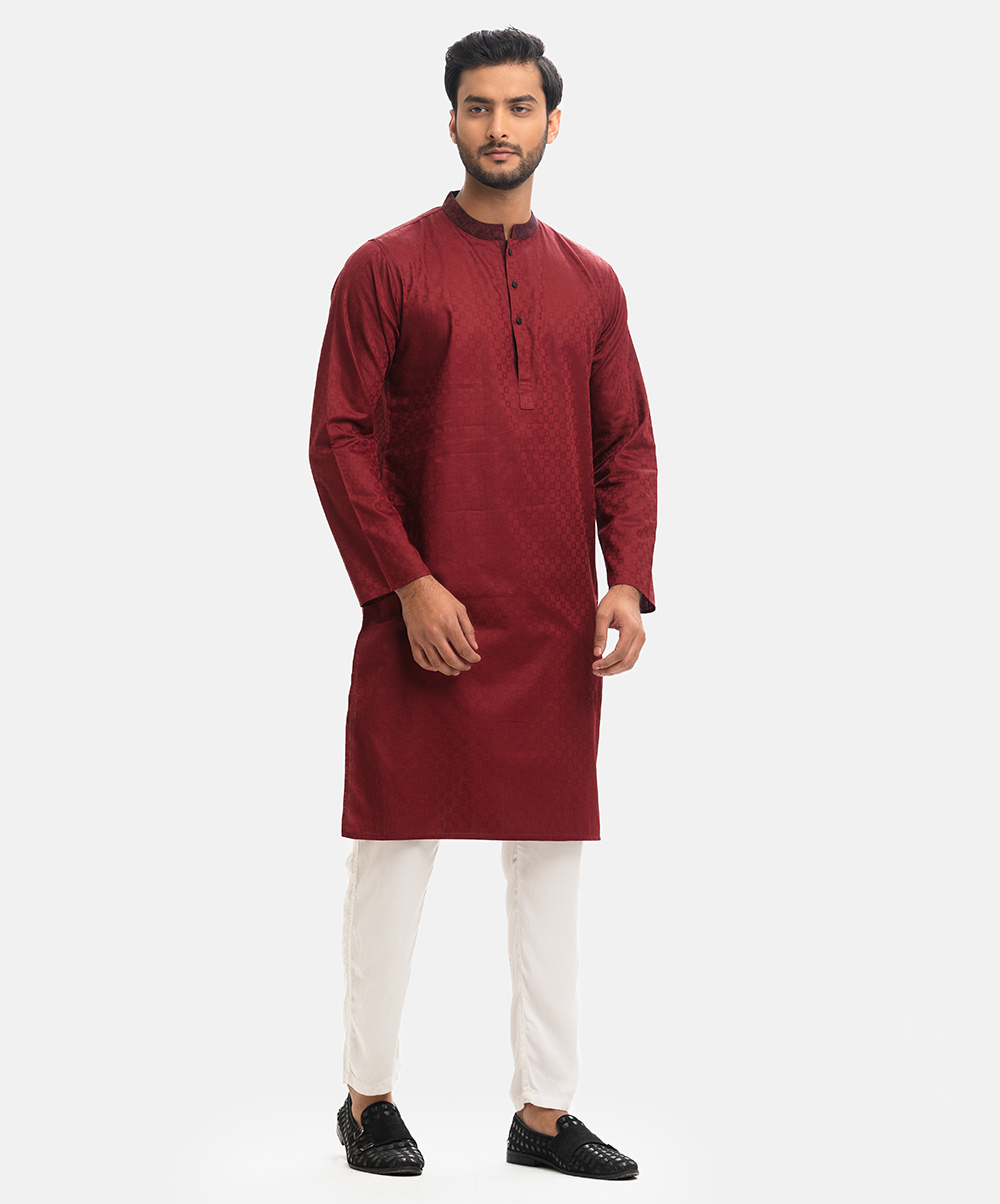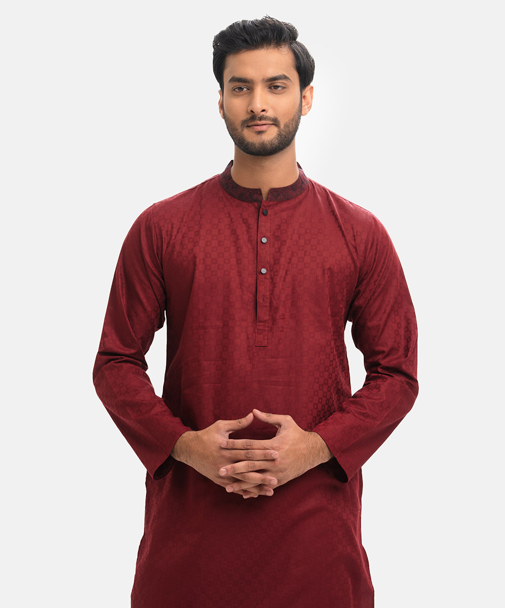 Men’s fitted panjabi in cotton Jacquard fabric. Mandarin collar & metal buttons placket. Full sleeves and inseam pockets.