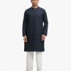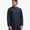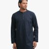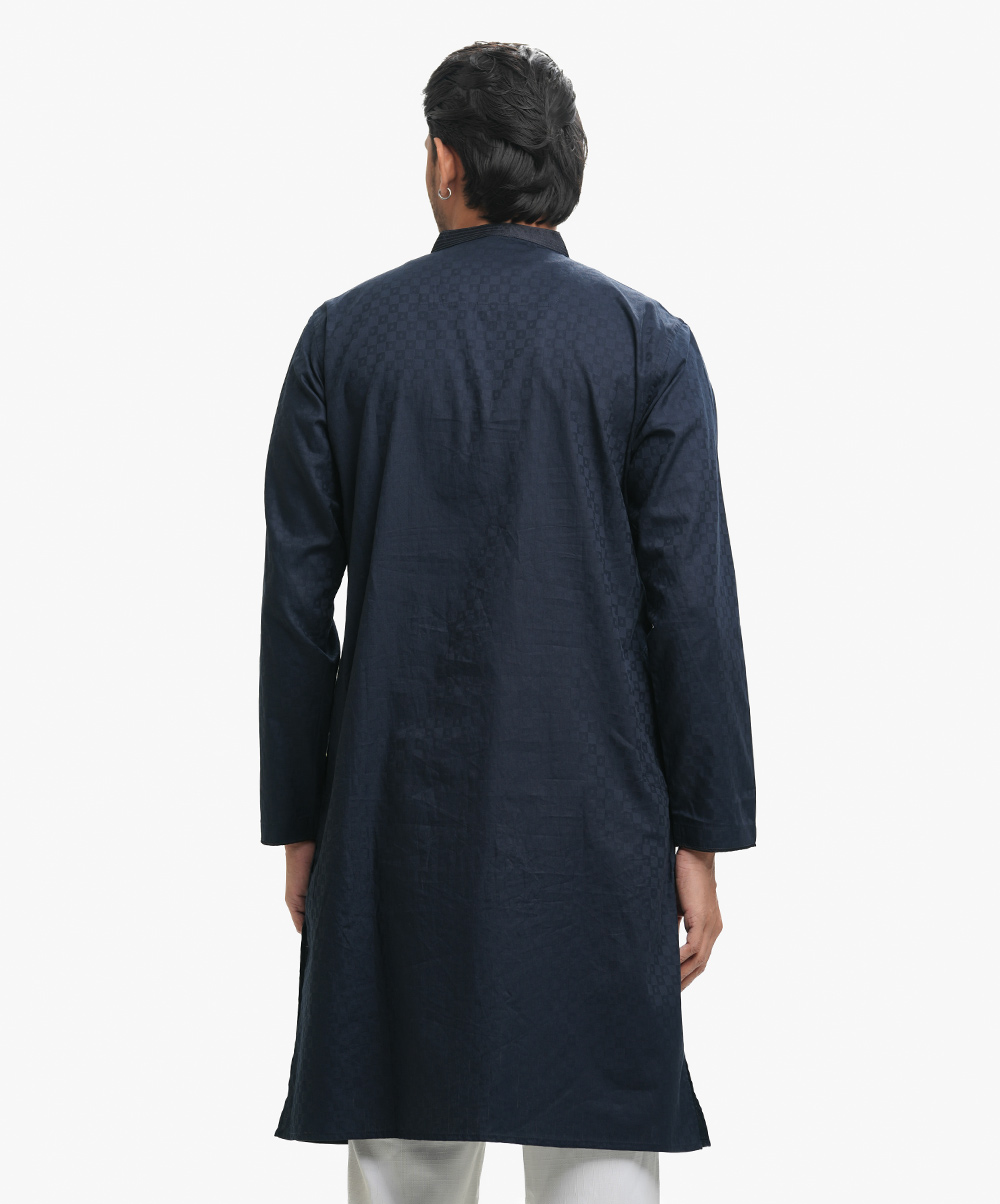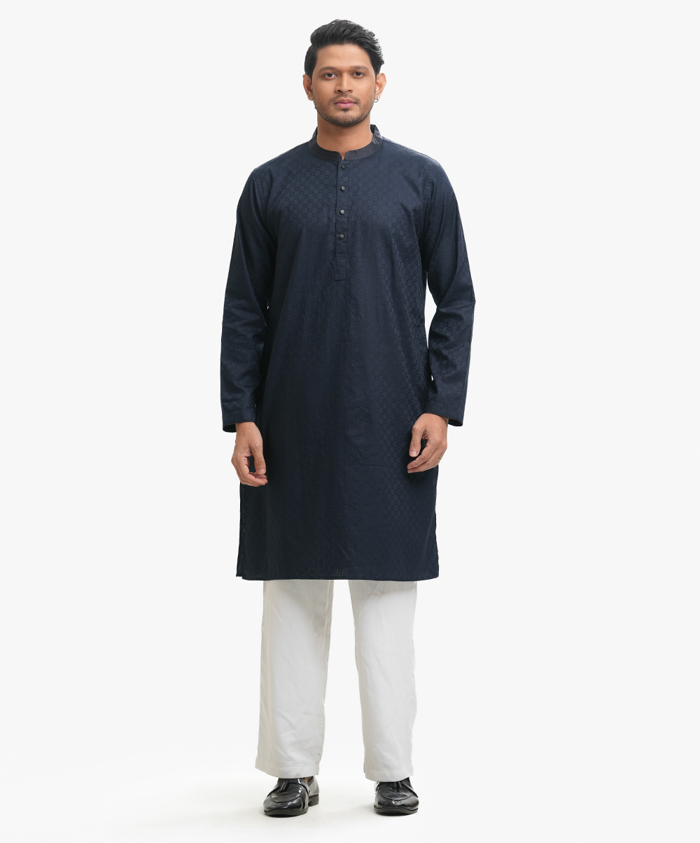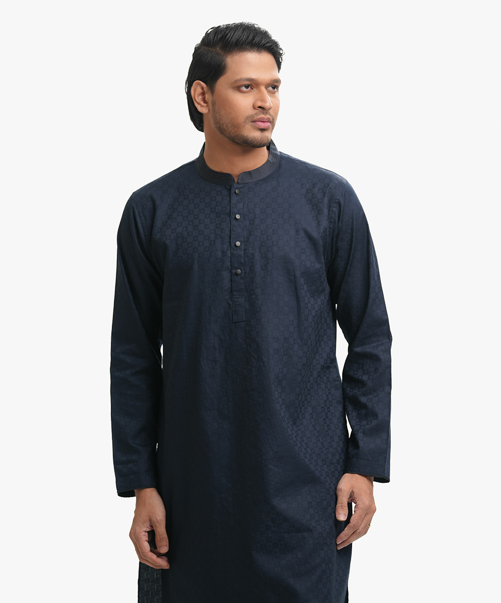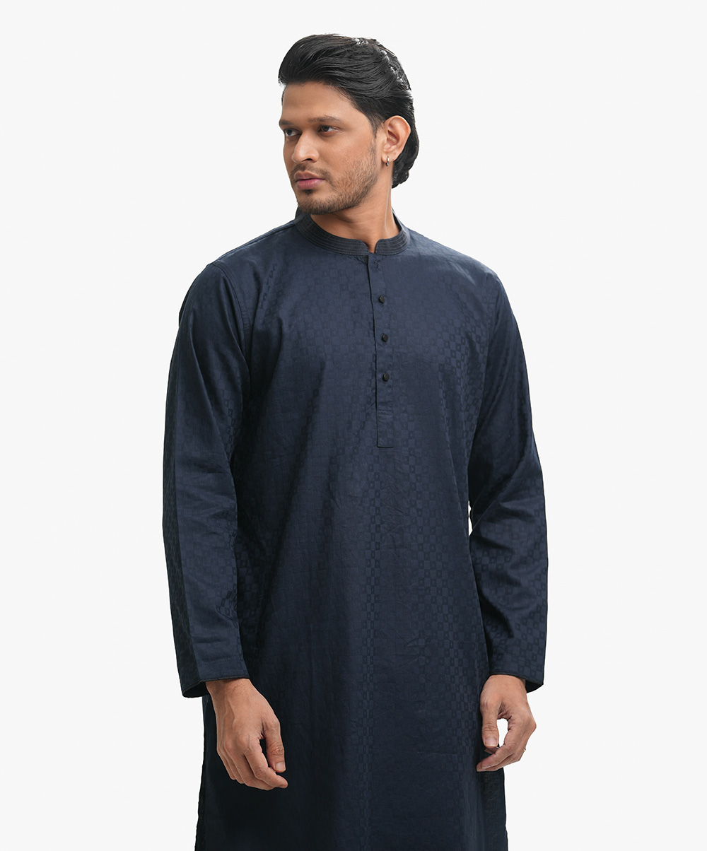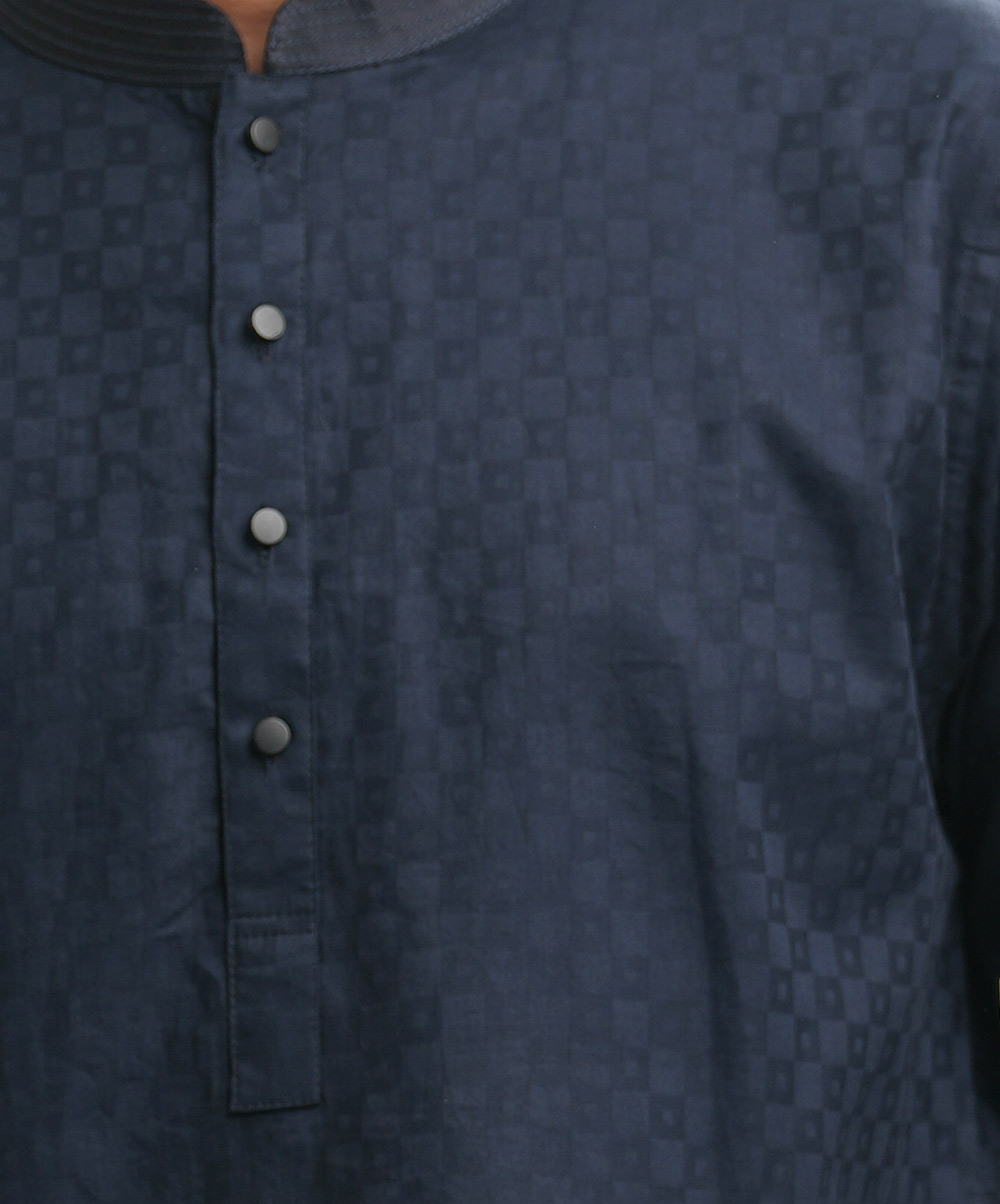 Men’s fitted panjabi in cotton Jacquard fabric. Line stitching at mandarin collar, metal buttons placket. Inseam side pockets.