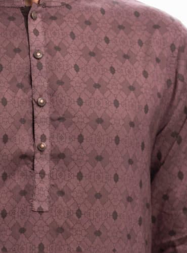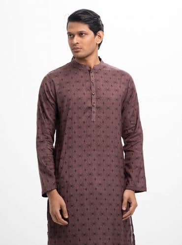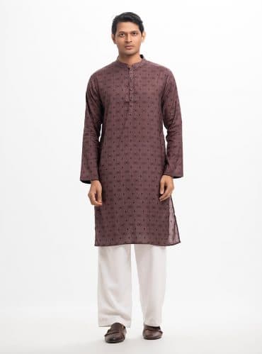 Fitted panjabi in blended jacquard fabric. Embroidery on the collar and hidden button placket. Inseam side pockets.