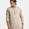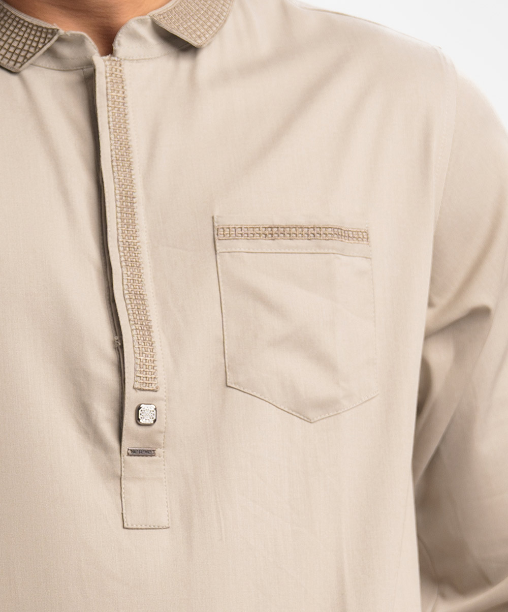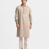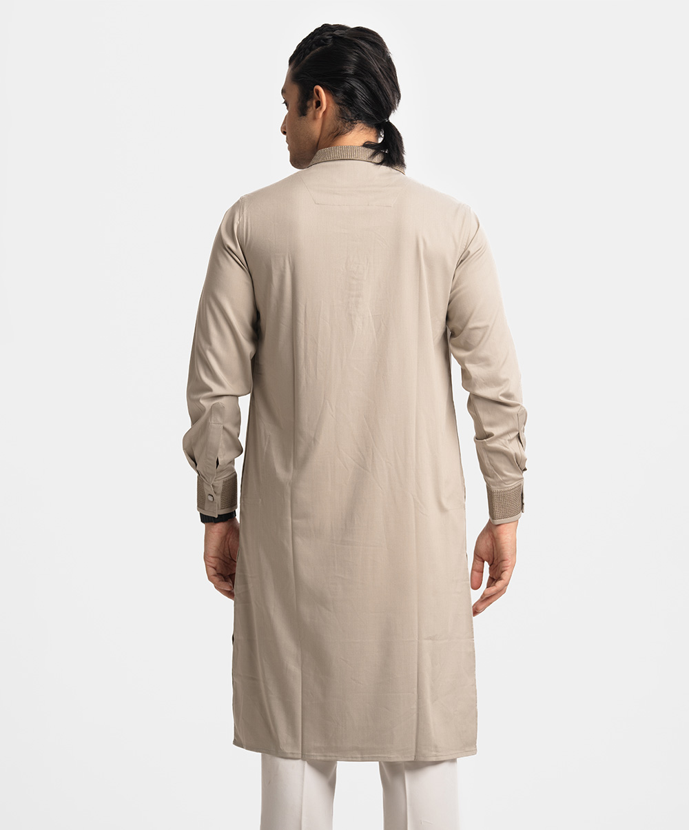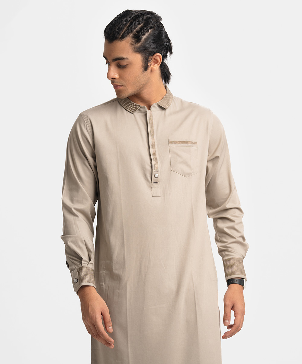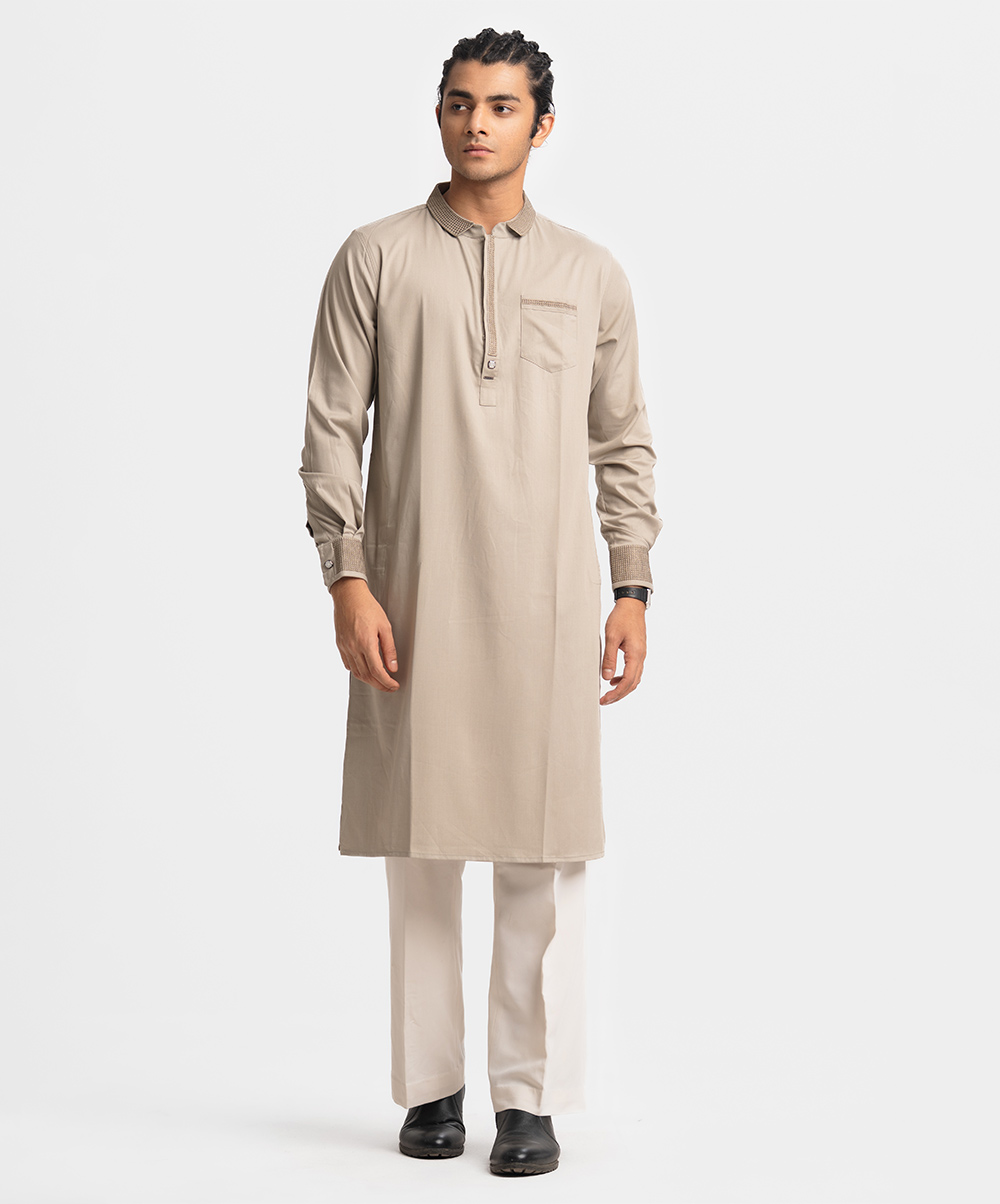 Ethnic panjabi in cotton fabric. Embroidery on the hidden button placket, collar, chest pocket and cuffs. Inseam side pockets.