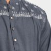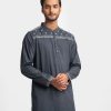 Men’s slim-fitted panjabi in blended fabric. Mandarin collar and inseam pockets. Embroidery at the front.