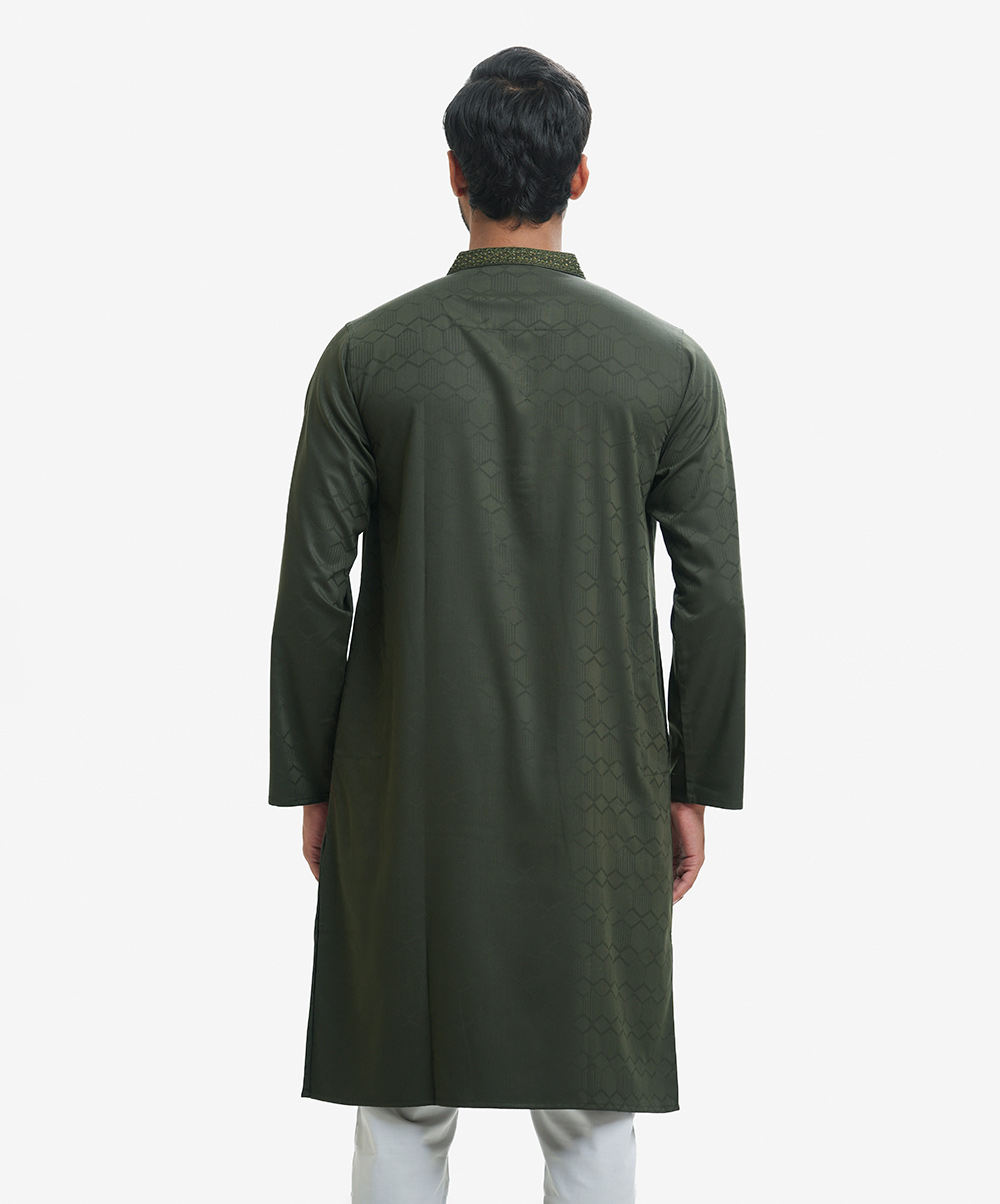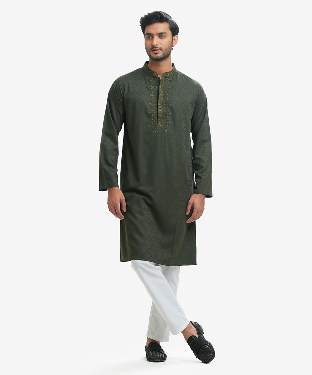 Fitted panjabi in jacquard fabric with embroidery and karchupi on the collar, hidden placket and chest.