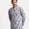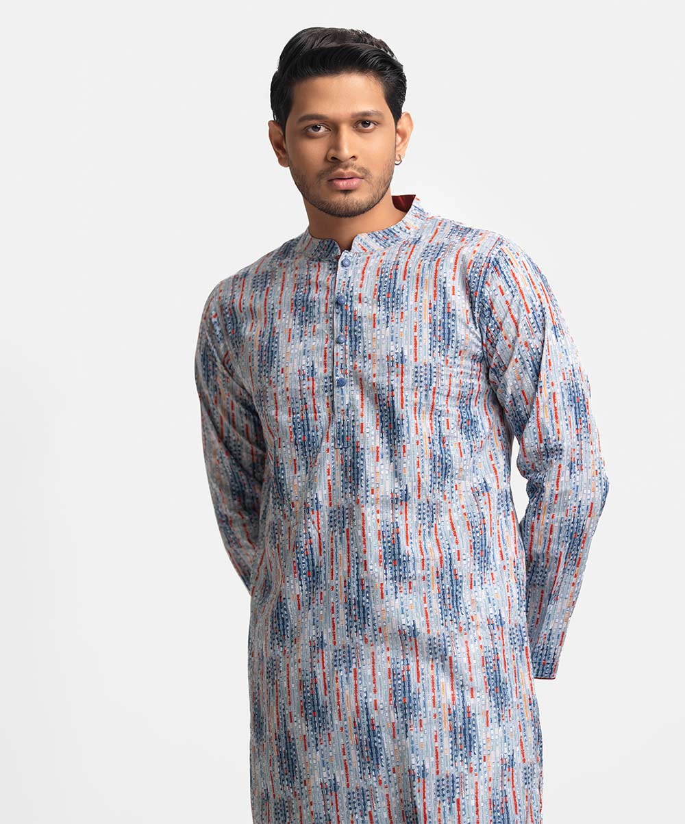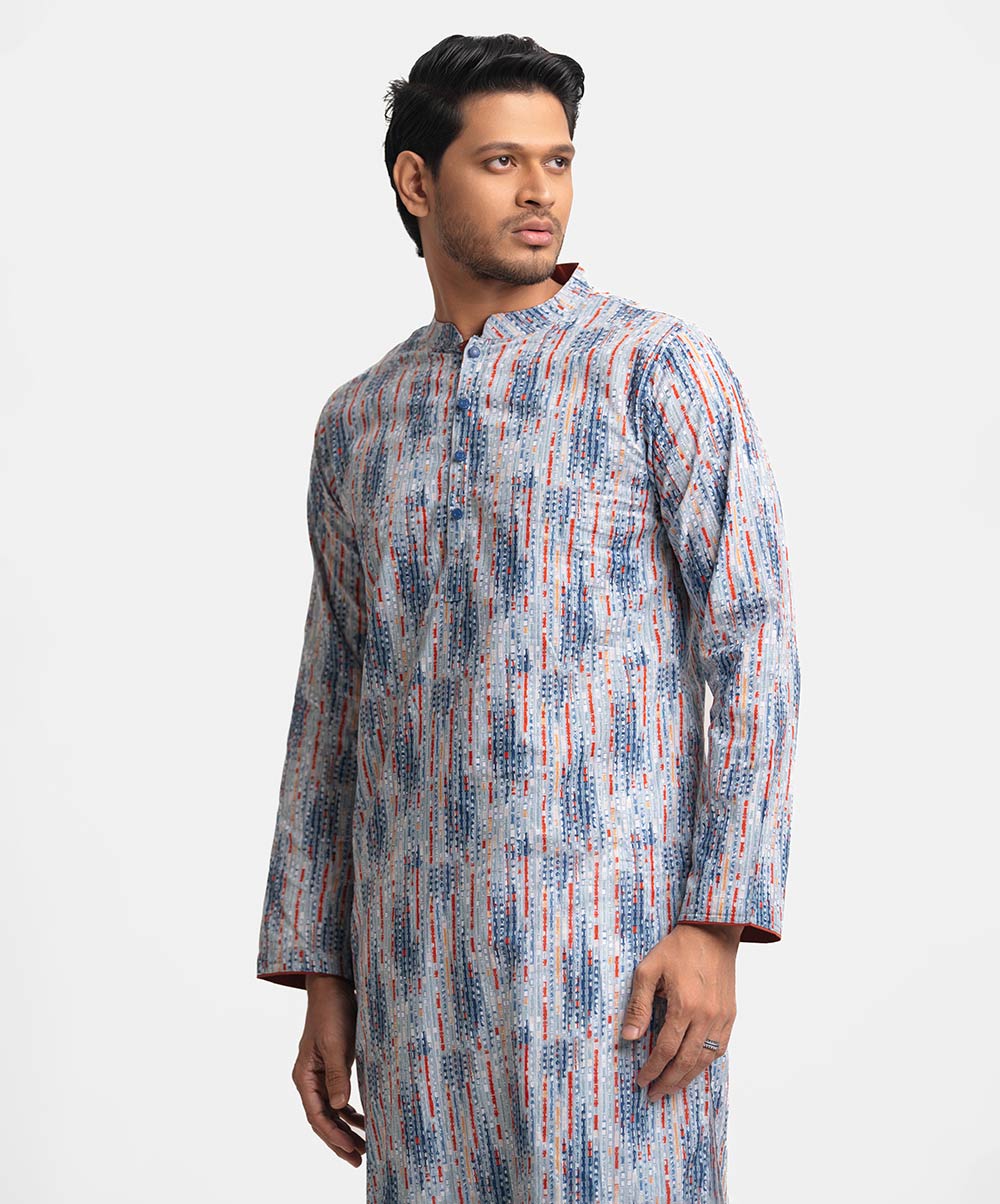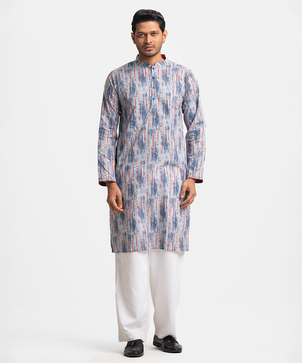 Men’s semi-fitted panjabi in cotton fabric. Mandarin collar, full sleeves. Inseam side pockets.
