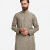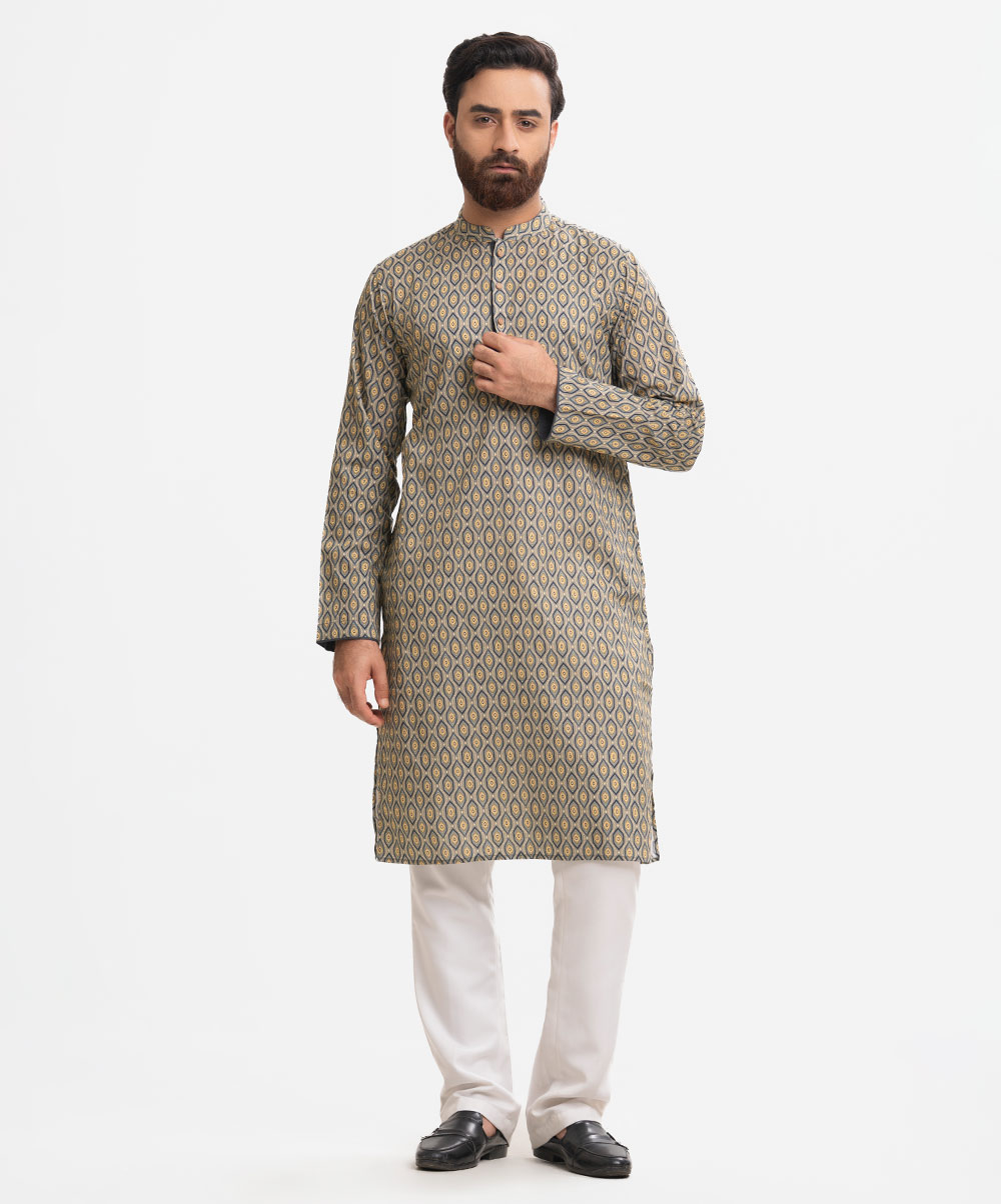Men’s fitted panjabi in cotton fabric. Long sleeves, inseam side pockets.