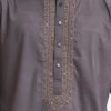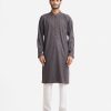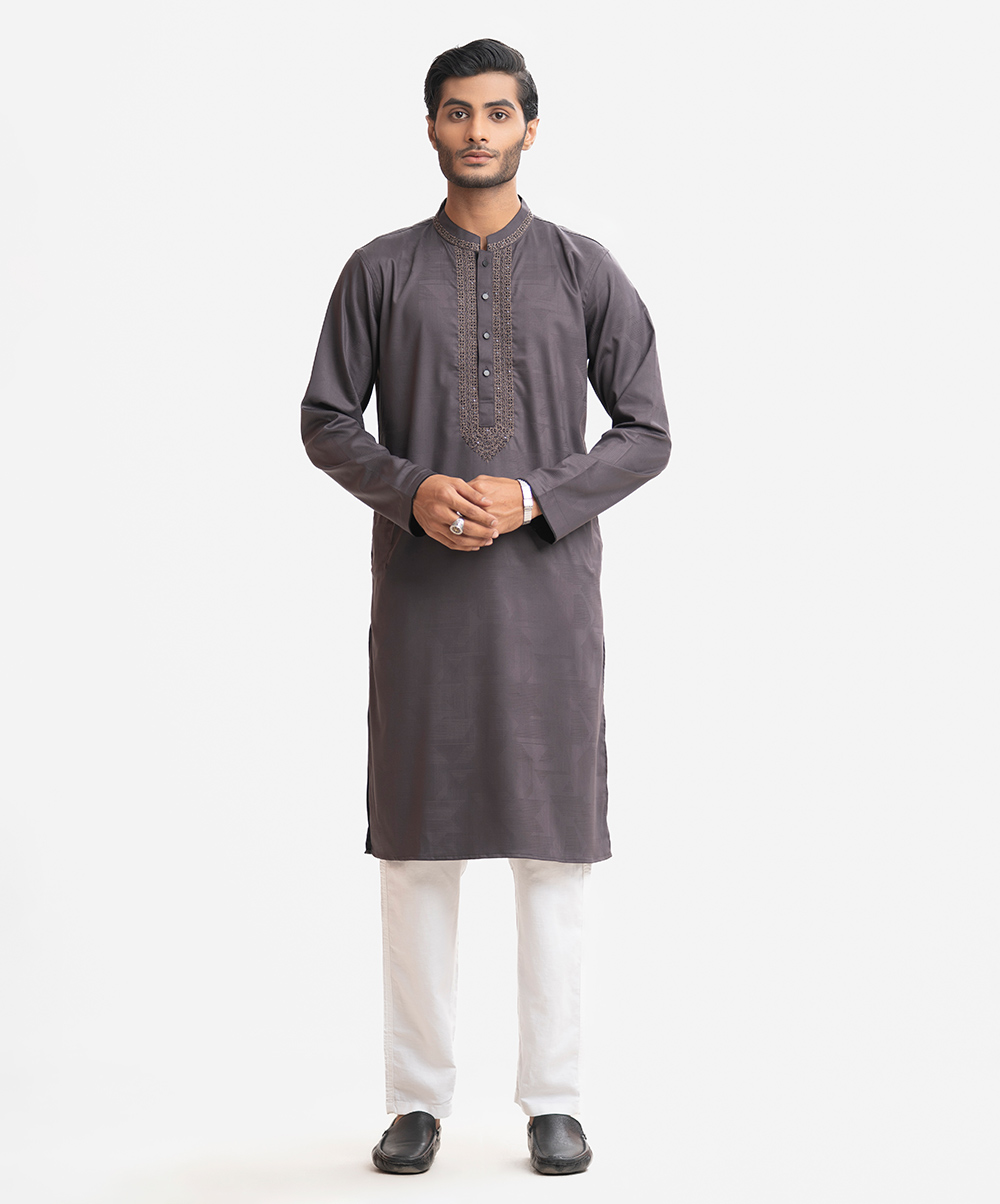 Men’s fitted panjabi in cotton jacquard fabric. Karchupi at mandarin collar with metal buttons on the placket & full sleeves. Inseam pockets.