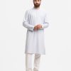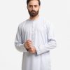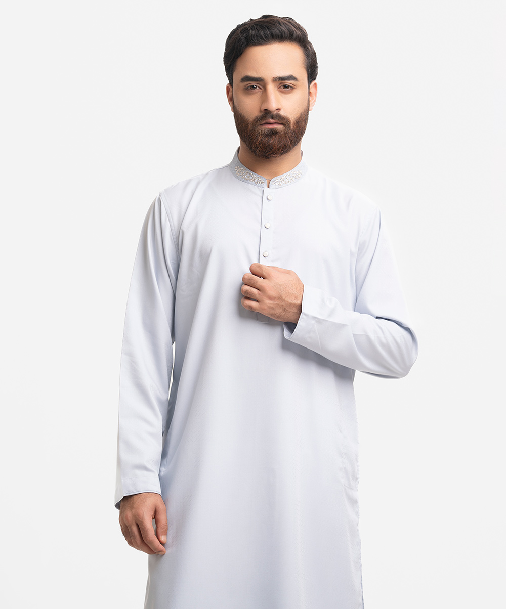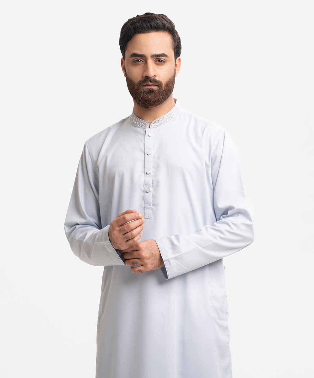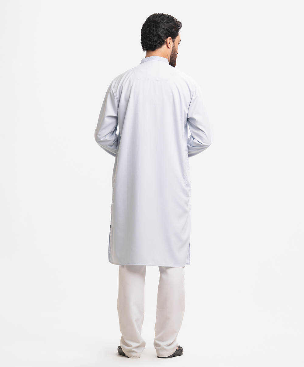 Men’s fitted panjabi in cotton jacquard fabric. Karchupi at the mandarin collar. Full sleeves & inseam side pockets.