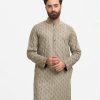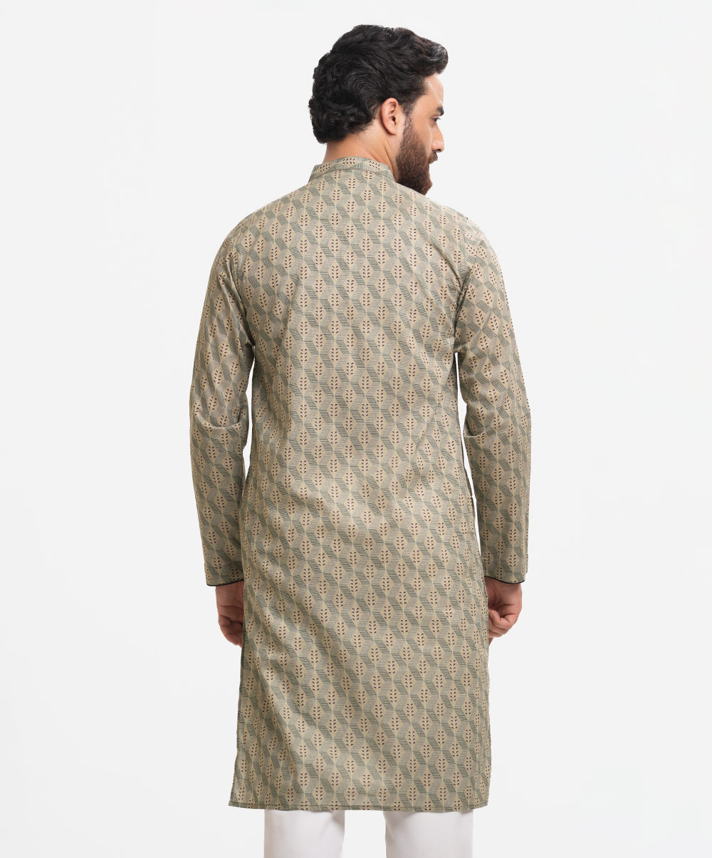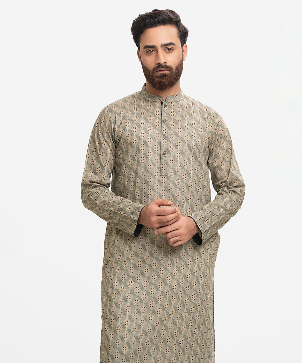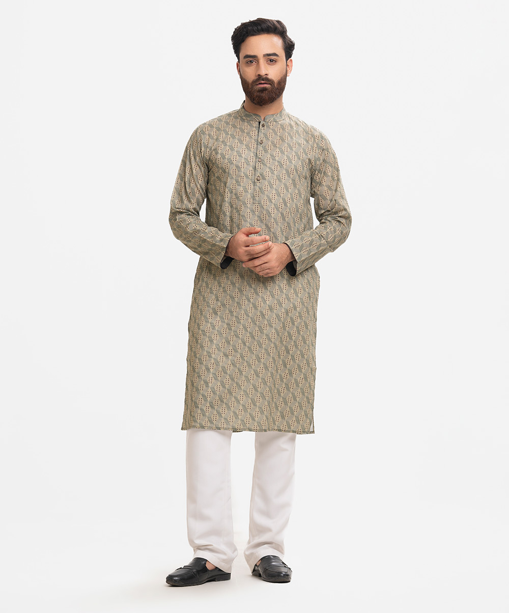 Men’s fitted panjabi in cotton fabric. Long sleeves, inseam side pockets.