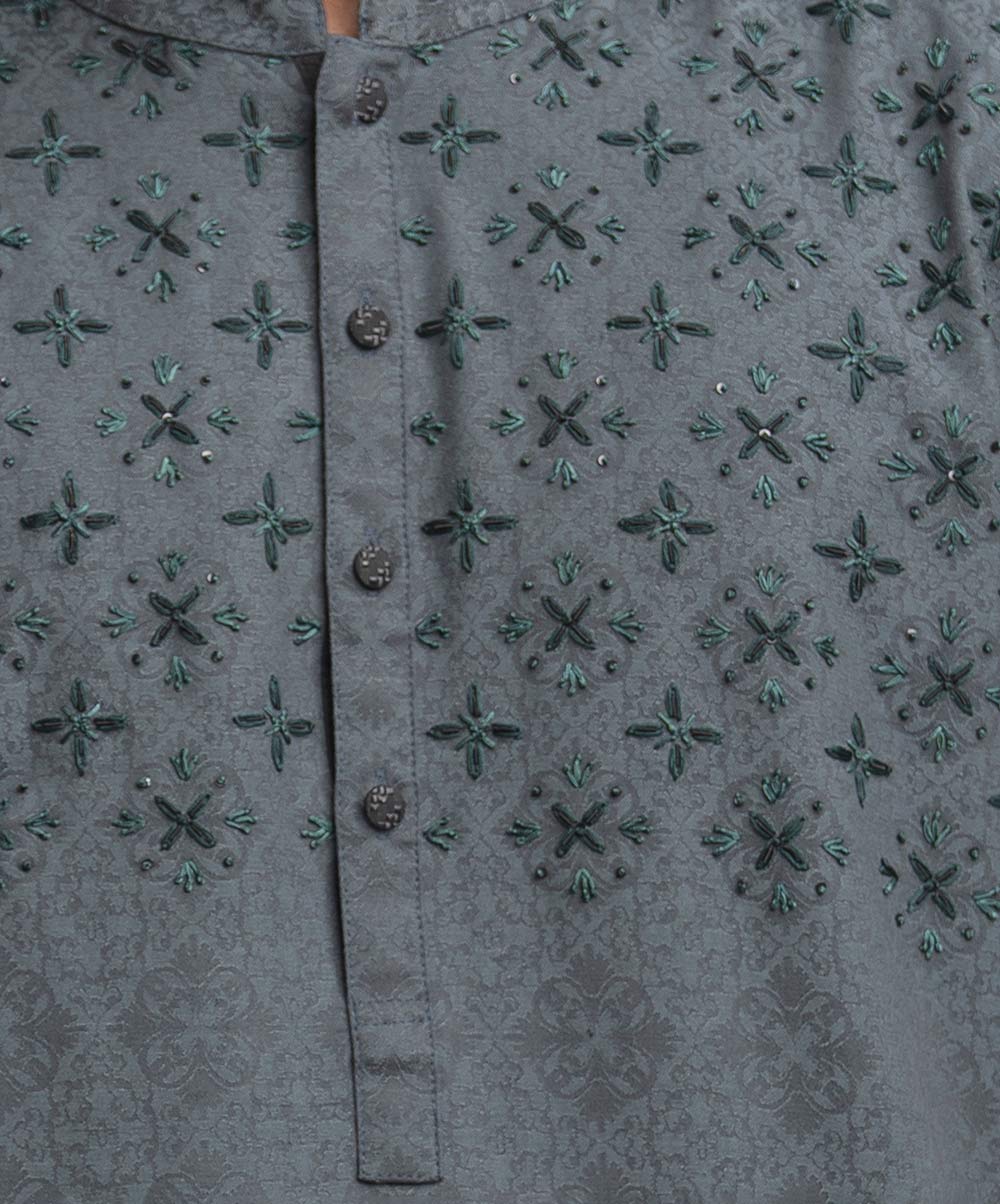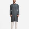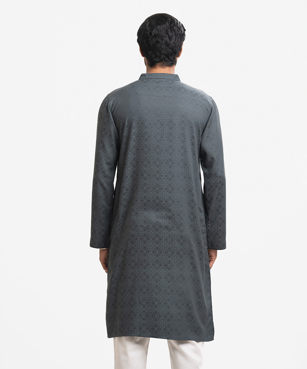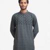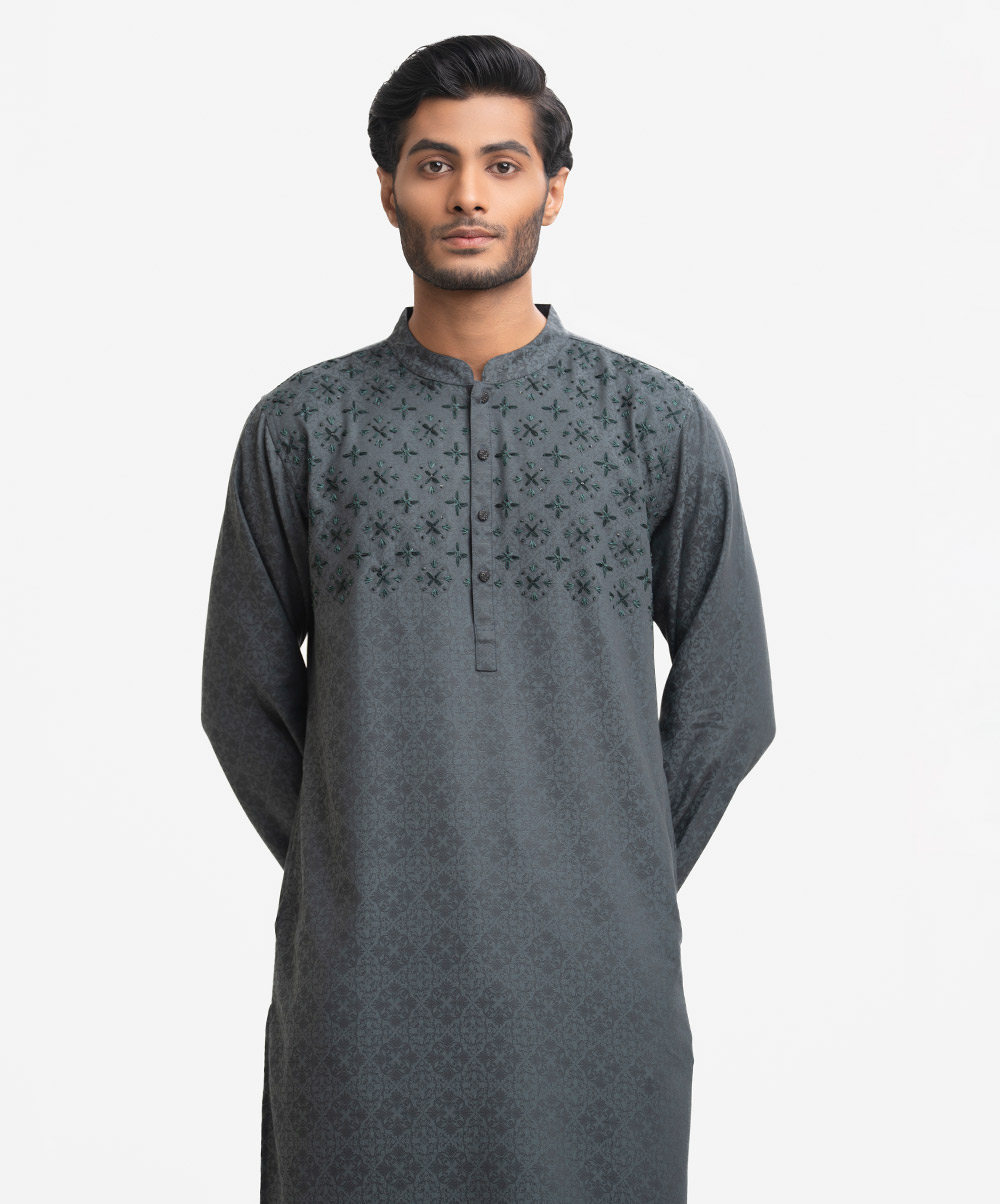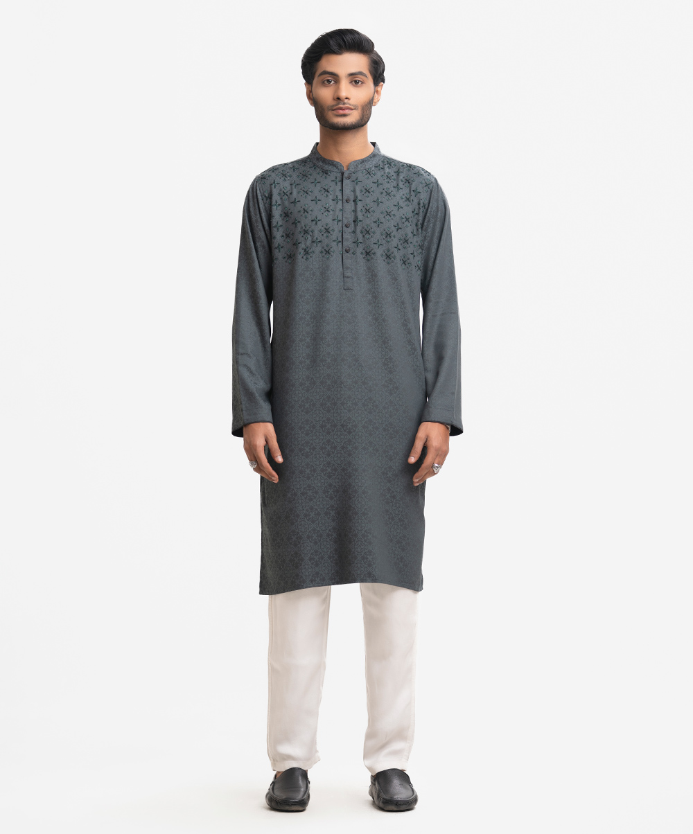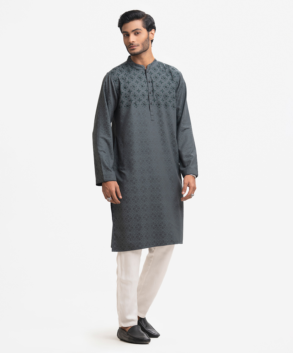 Men’s fitted panjabi in cotton fabric. Long sleeves, inseam side pockets. Handstitch and karchupi on the chest.