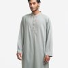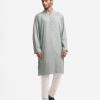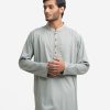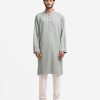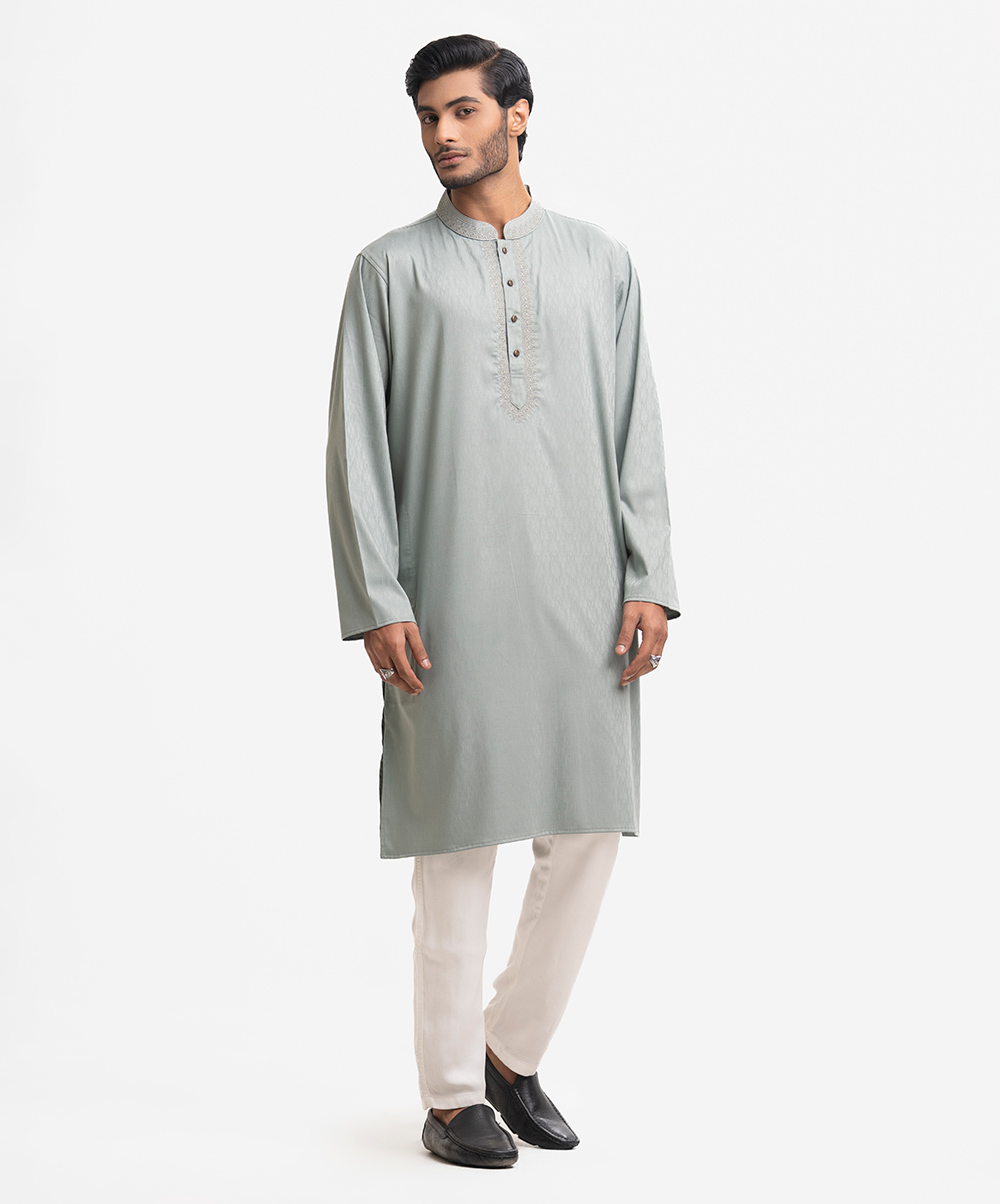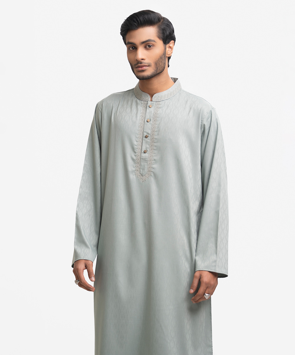 Men’s fitted panjabi in jacquard fabric. Long sleeves, inseam side pockets. Embroidery on the collar and placket.