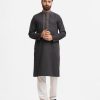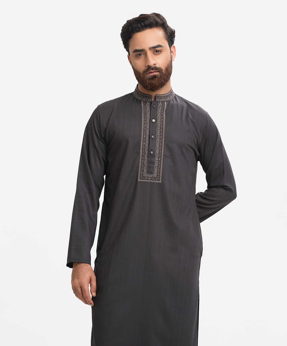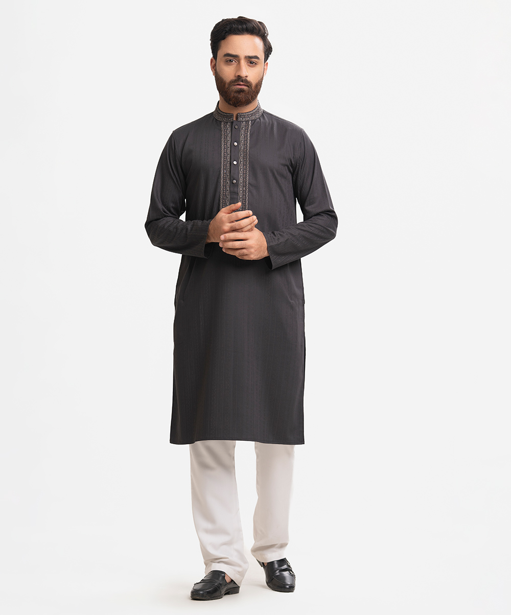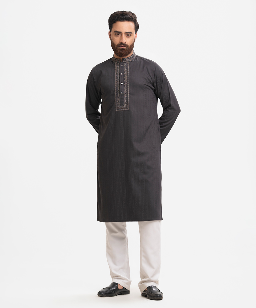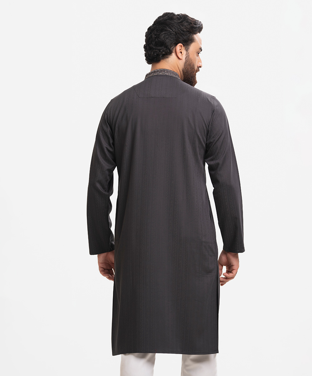 Men’s fitted panjabi in cotton fabric. Long sleeves, inseam side pockets. Handstitched on the collar and placket.